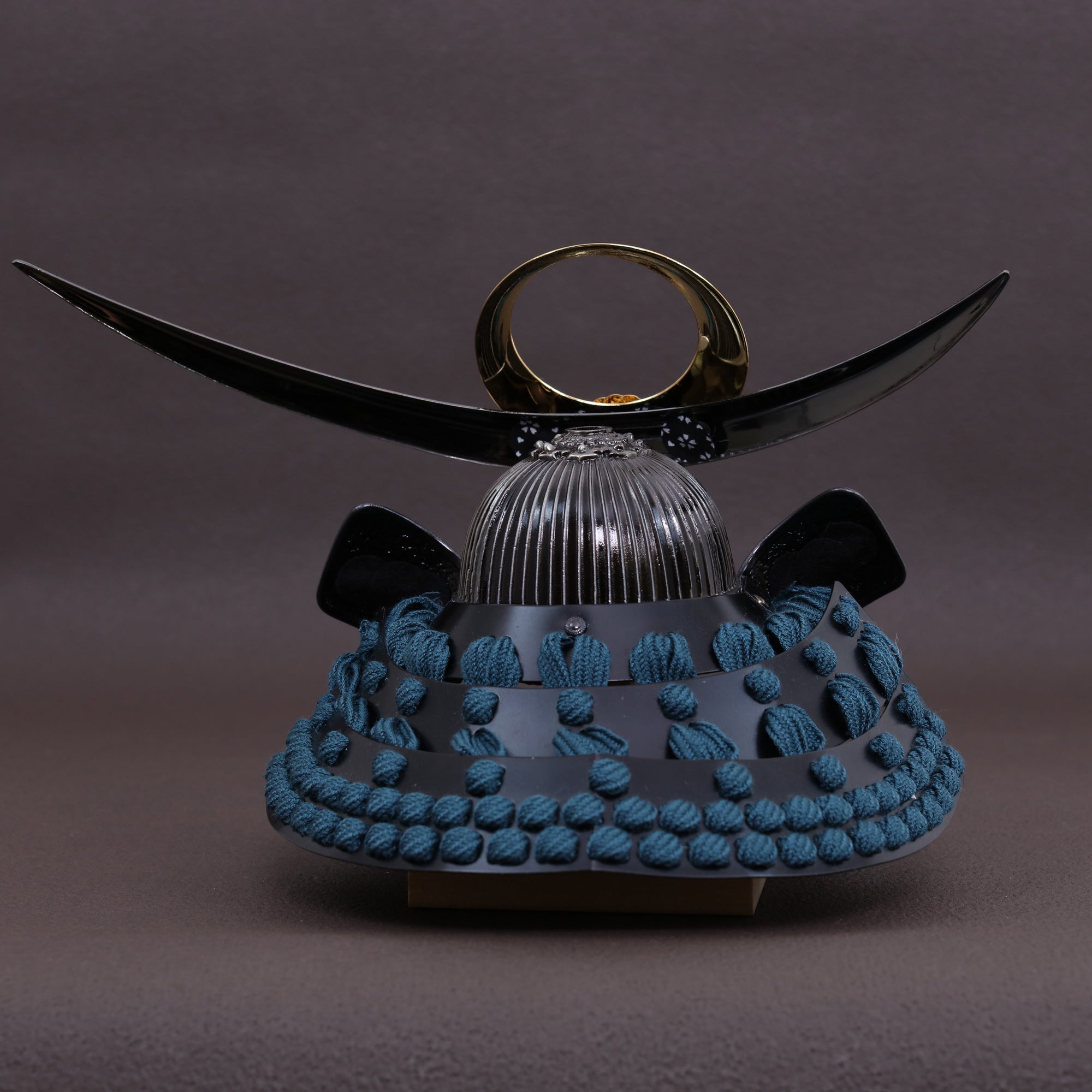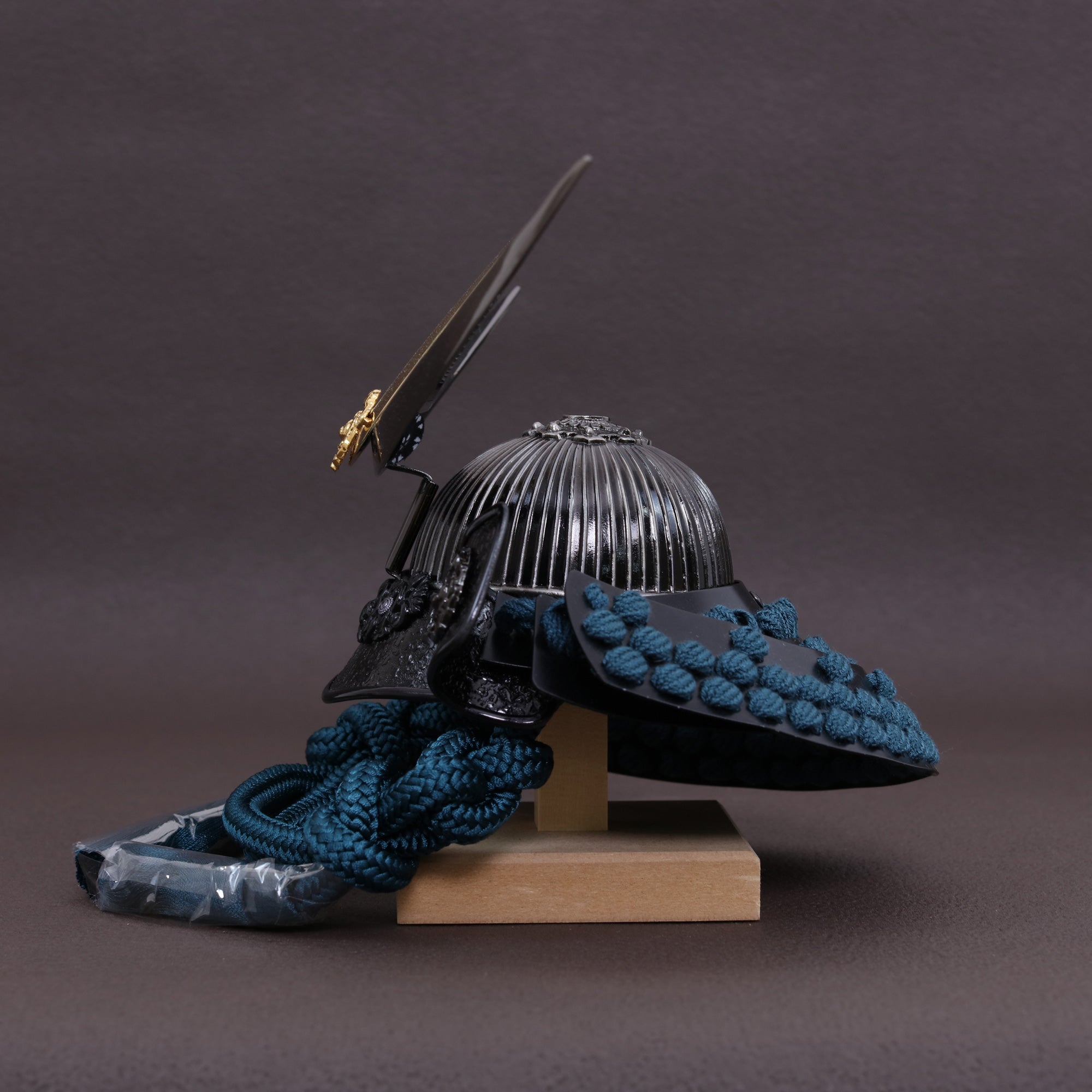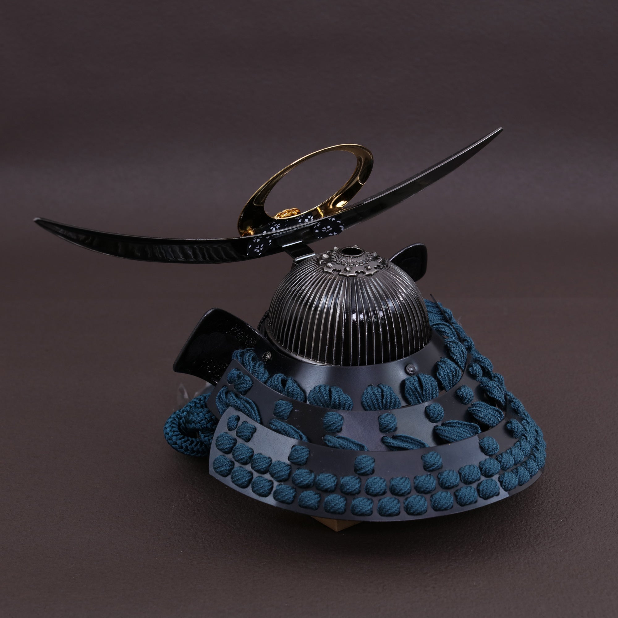 黒の艶と藍の奥行きが溶け合い、兜全体を落ち着いた高級感へ。