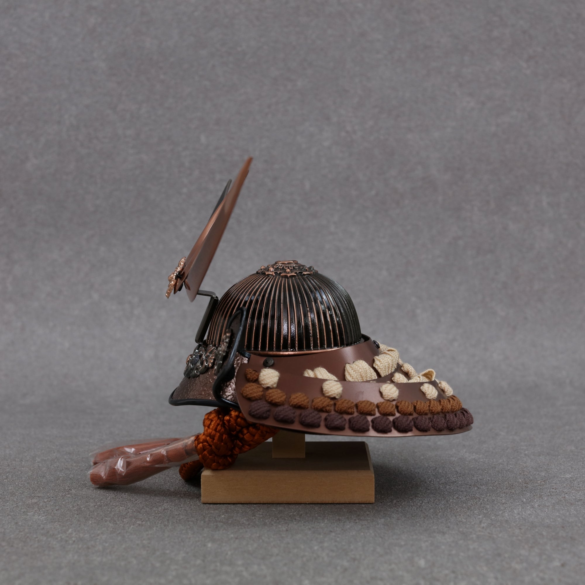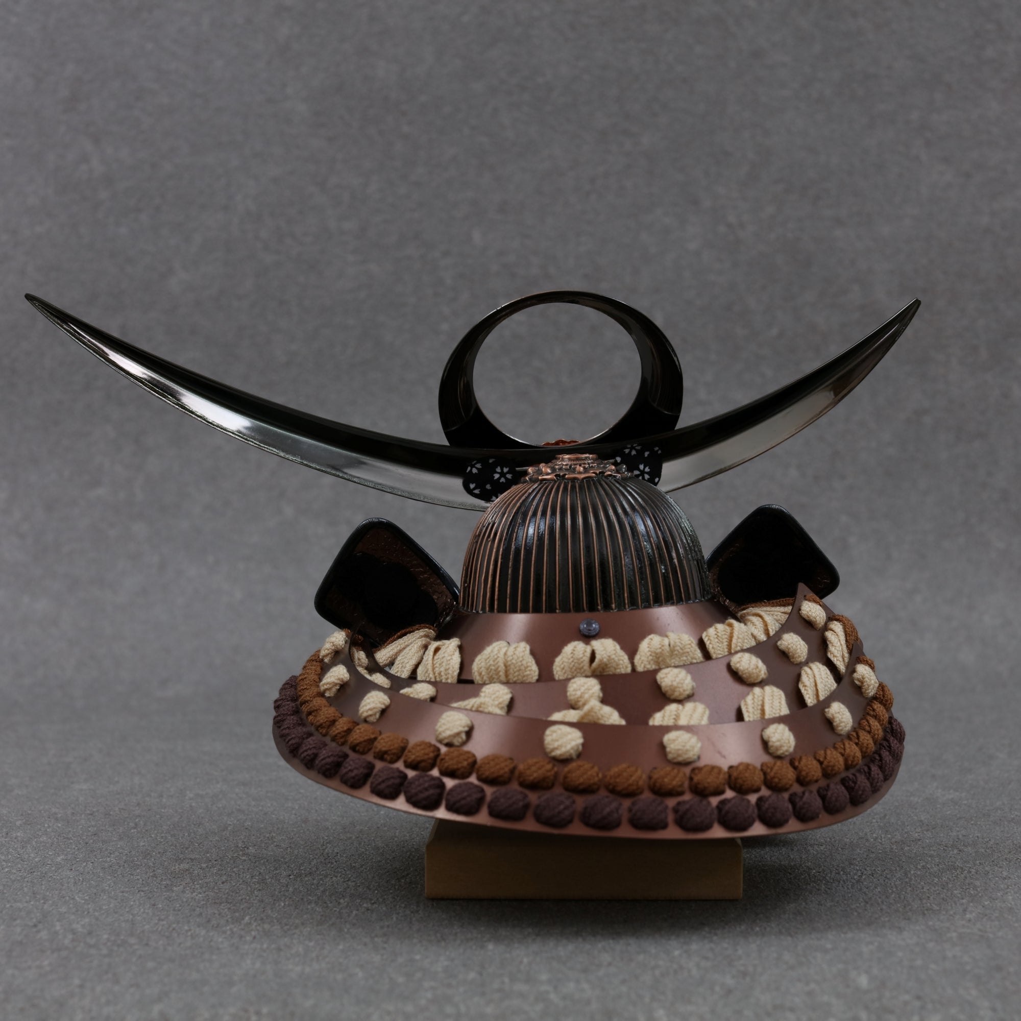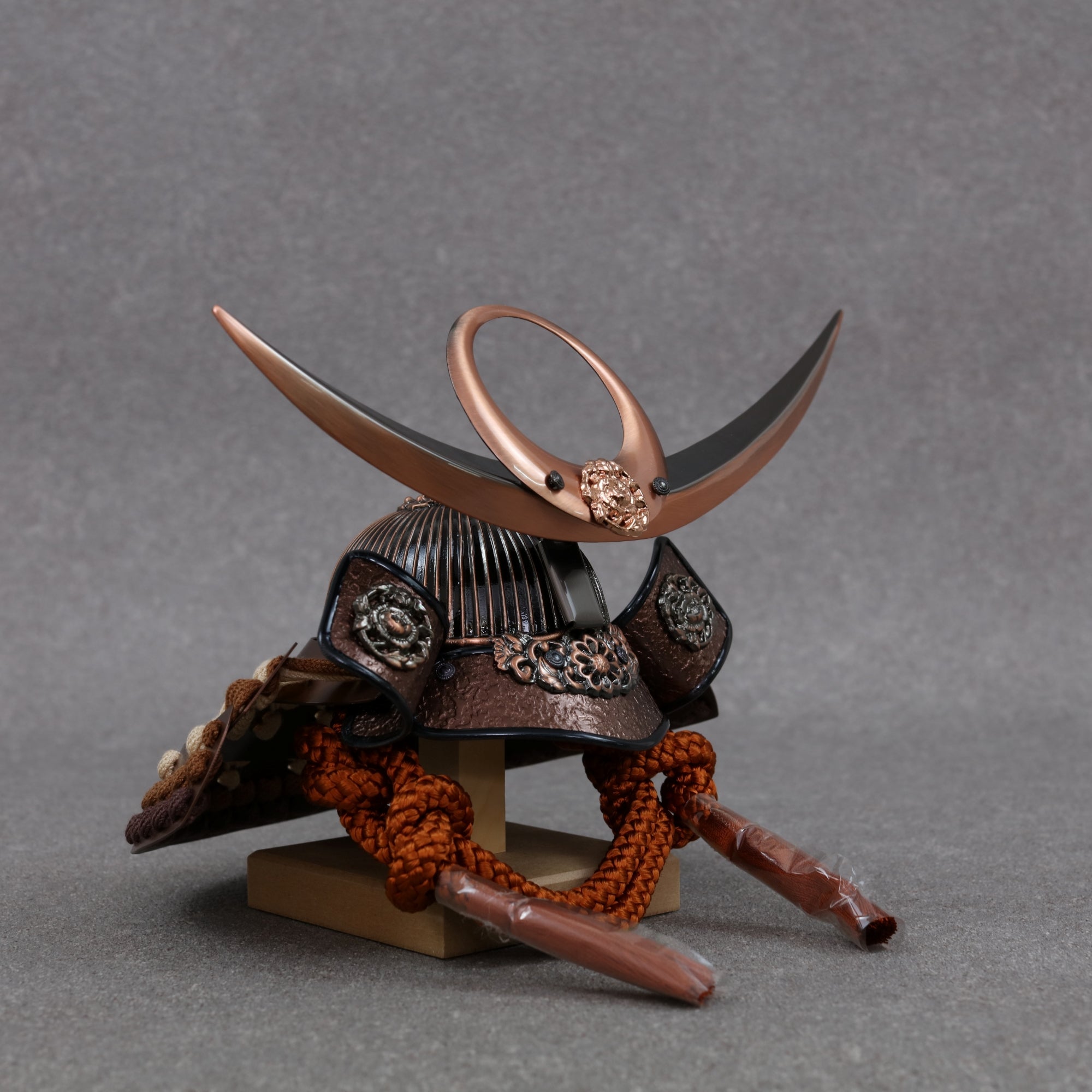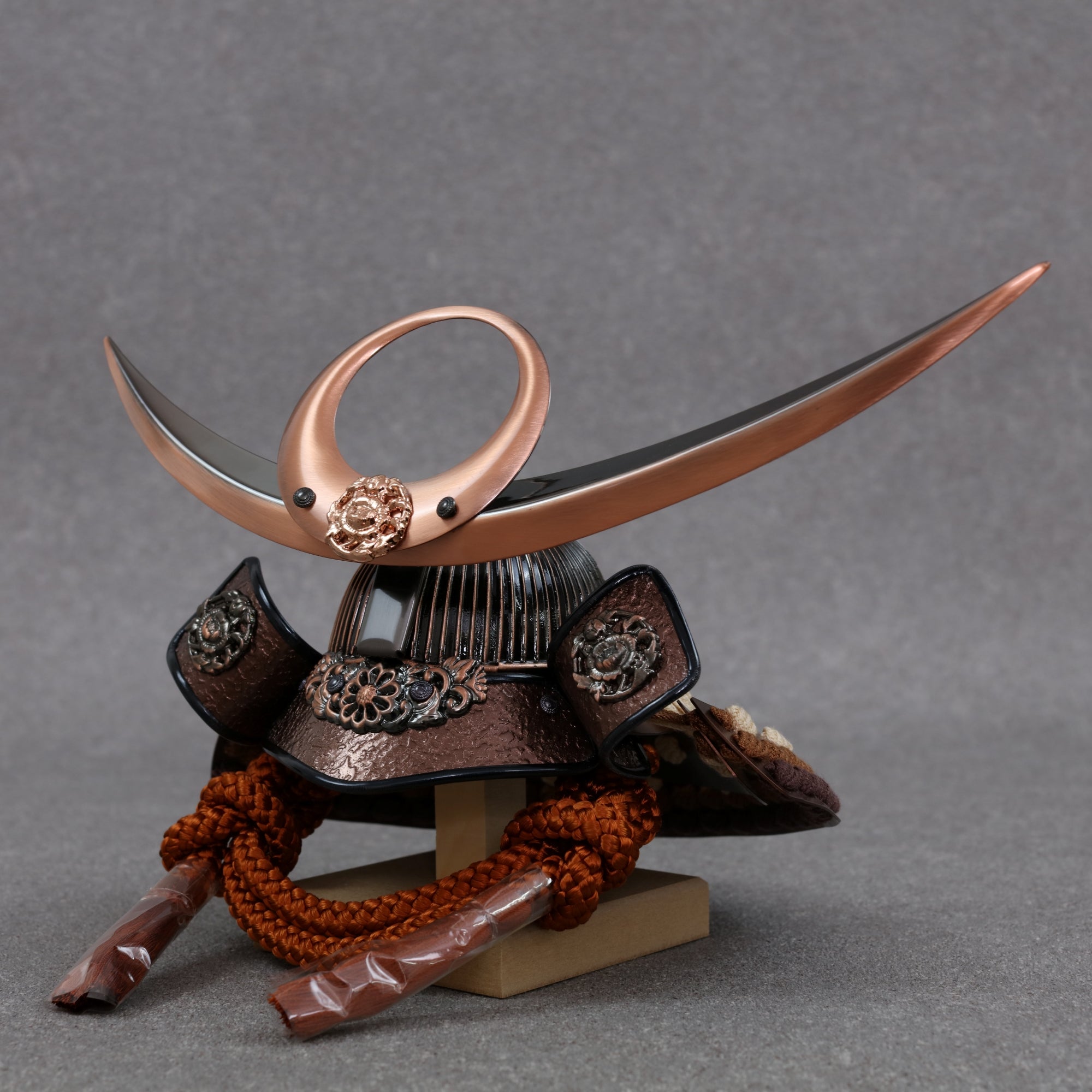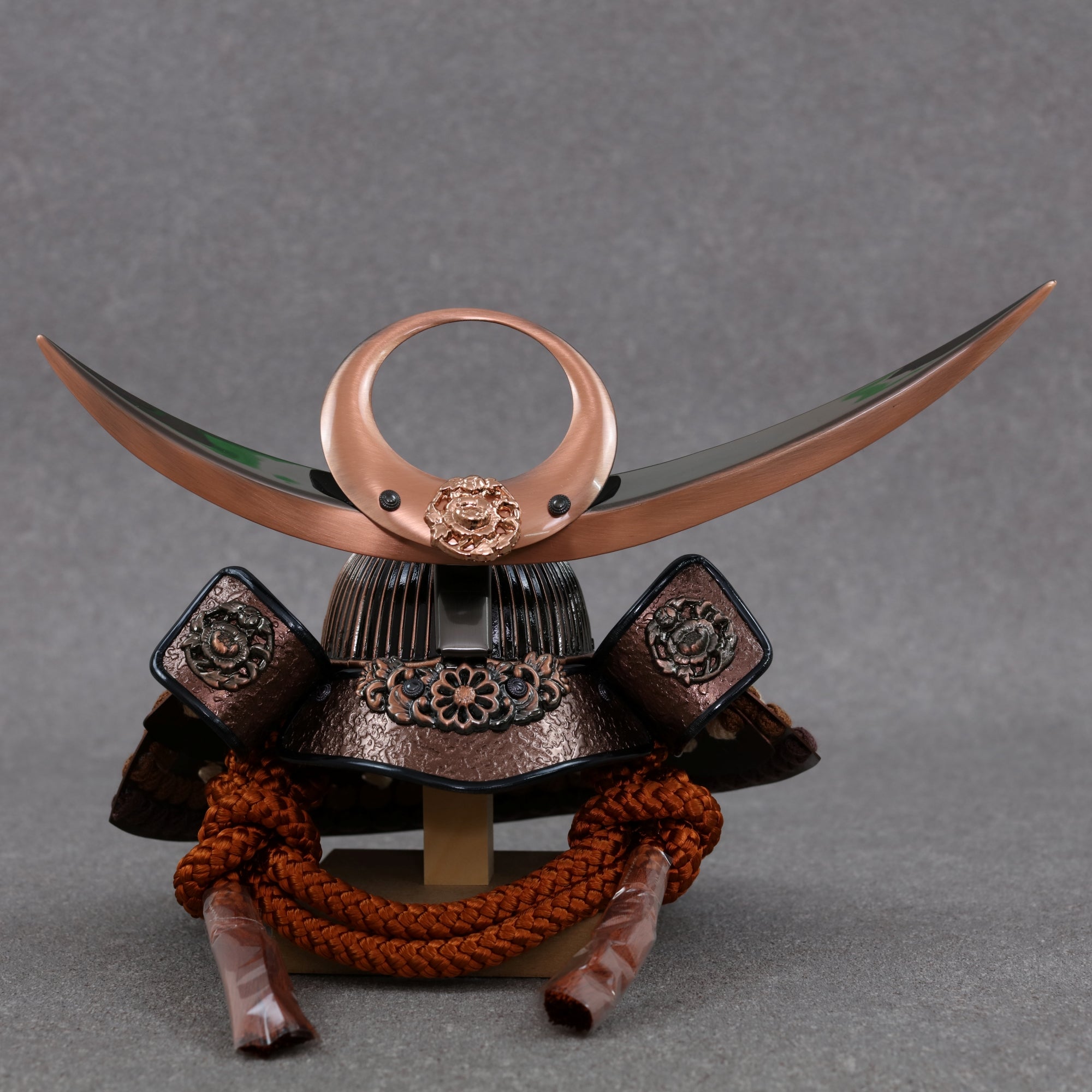 戦国時代の英雄・上杉謙信公が愛用した兜をベースに、豪華な銅色で仕上げた一品です。 特徴的な三日月型の前立は、上杉謙信の儀式として知られ、力強さと気品を捉えたデザインが魅力的な色です。