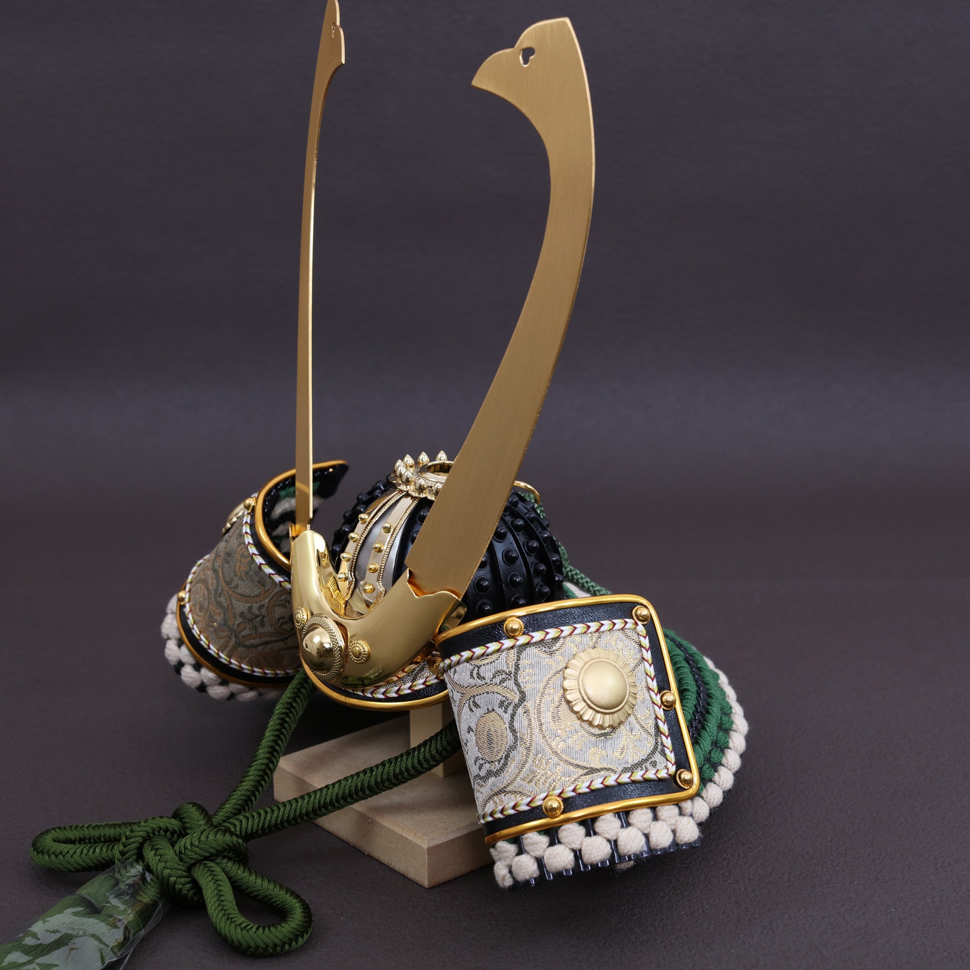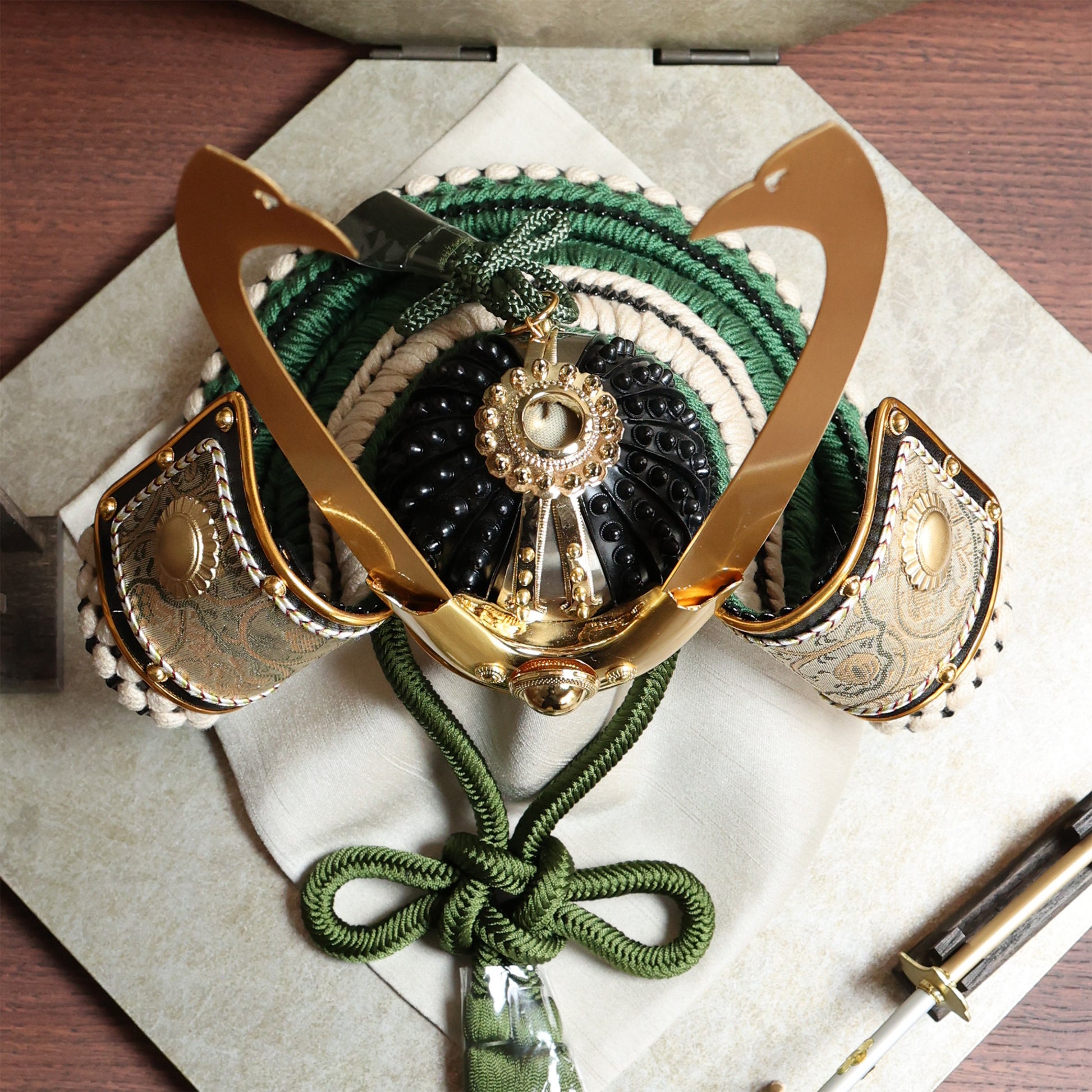 上品な金の輝きは、深い緑の組紐と重なることで落ち着いた重厚感に。