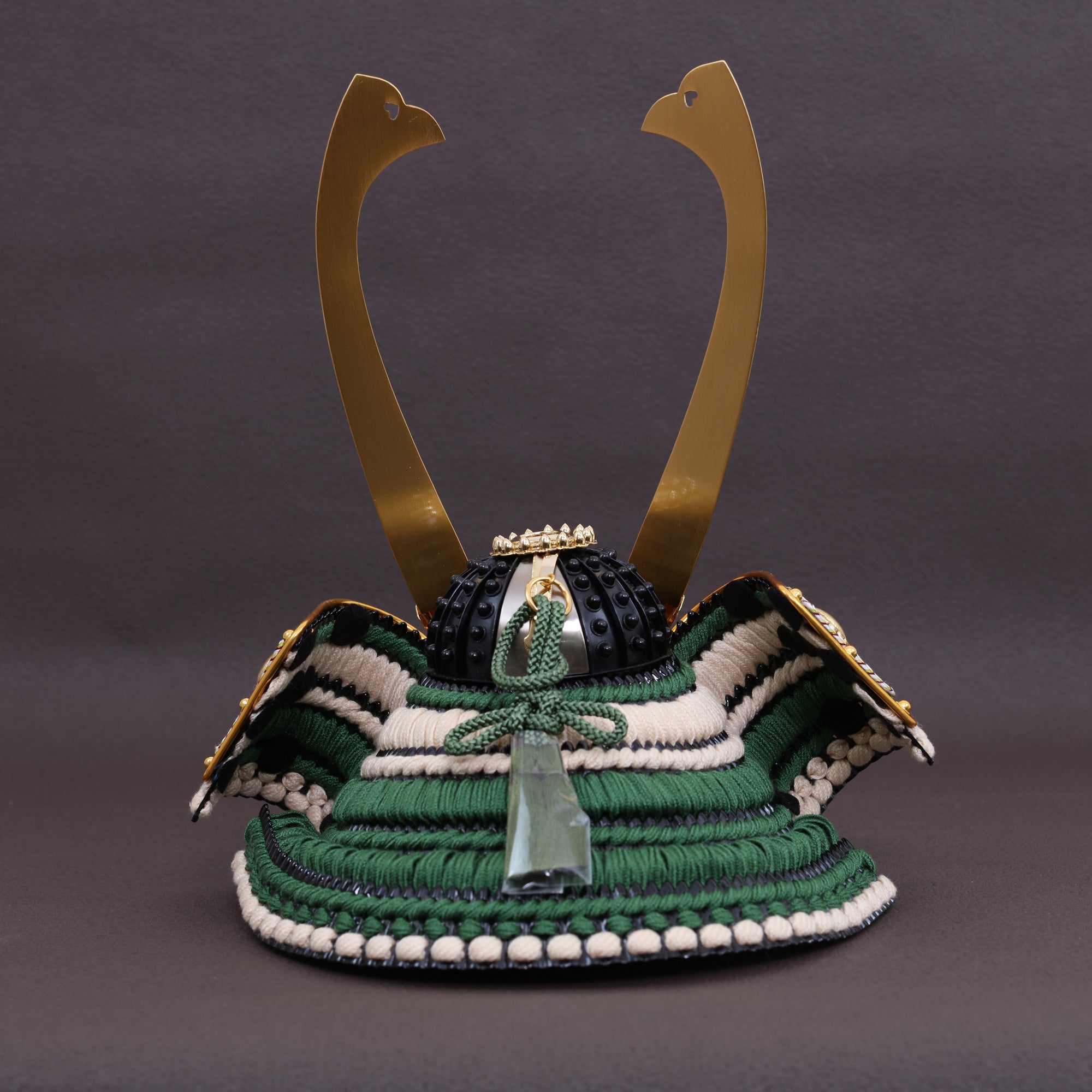 しなやかに反り上がる二本鍬形が、兜に凛とした迫力と高さを与えます。