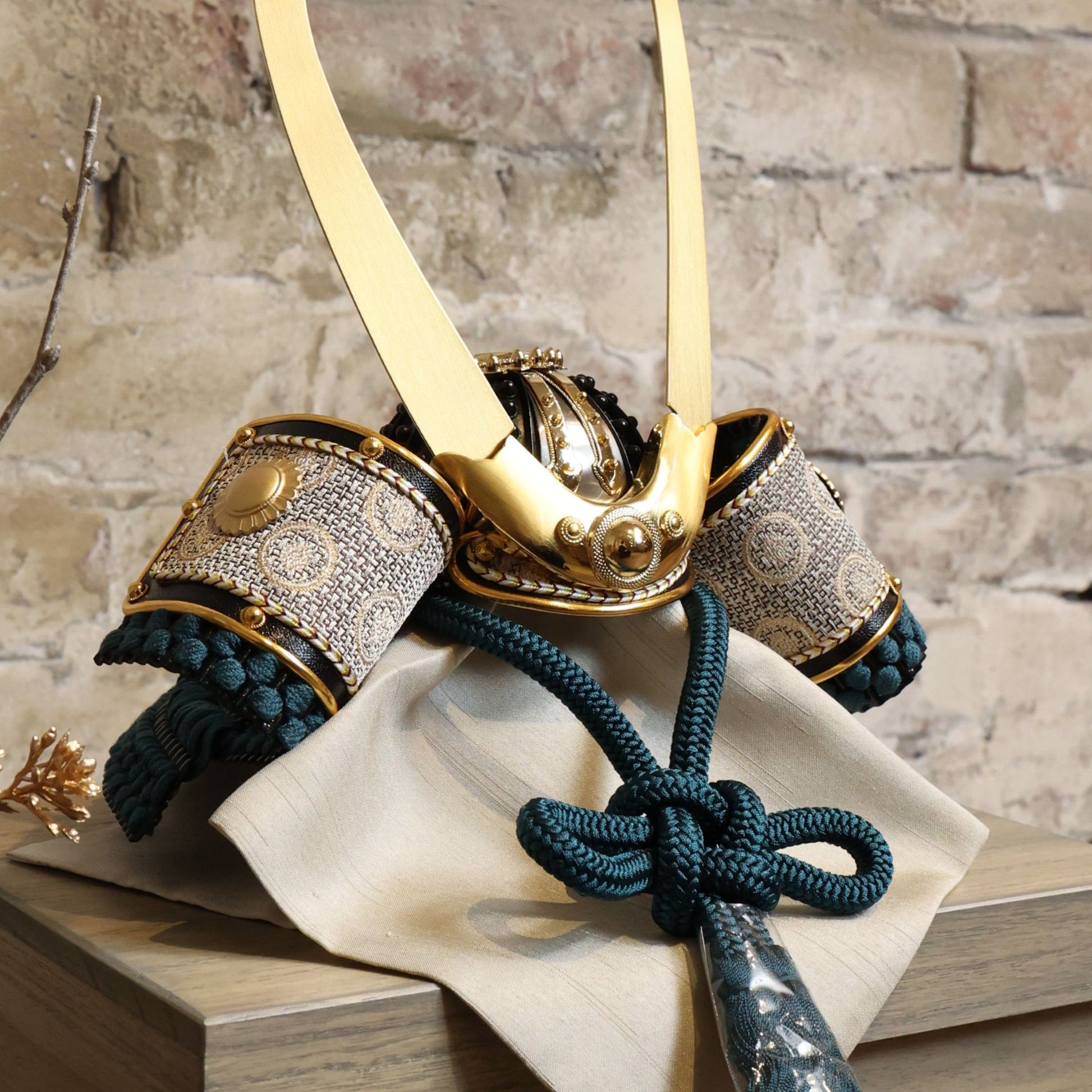柔らかな金の輝きは主張しすぎず、深い青緑の組紐と重なることで落ち着いた存在感に。