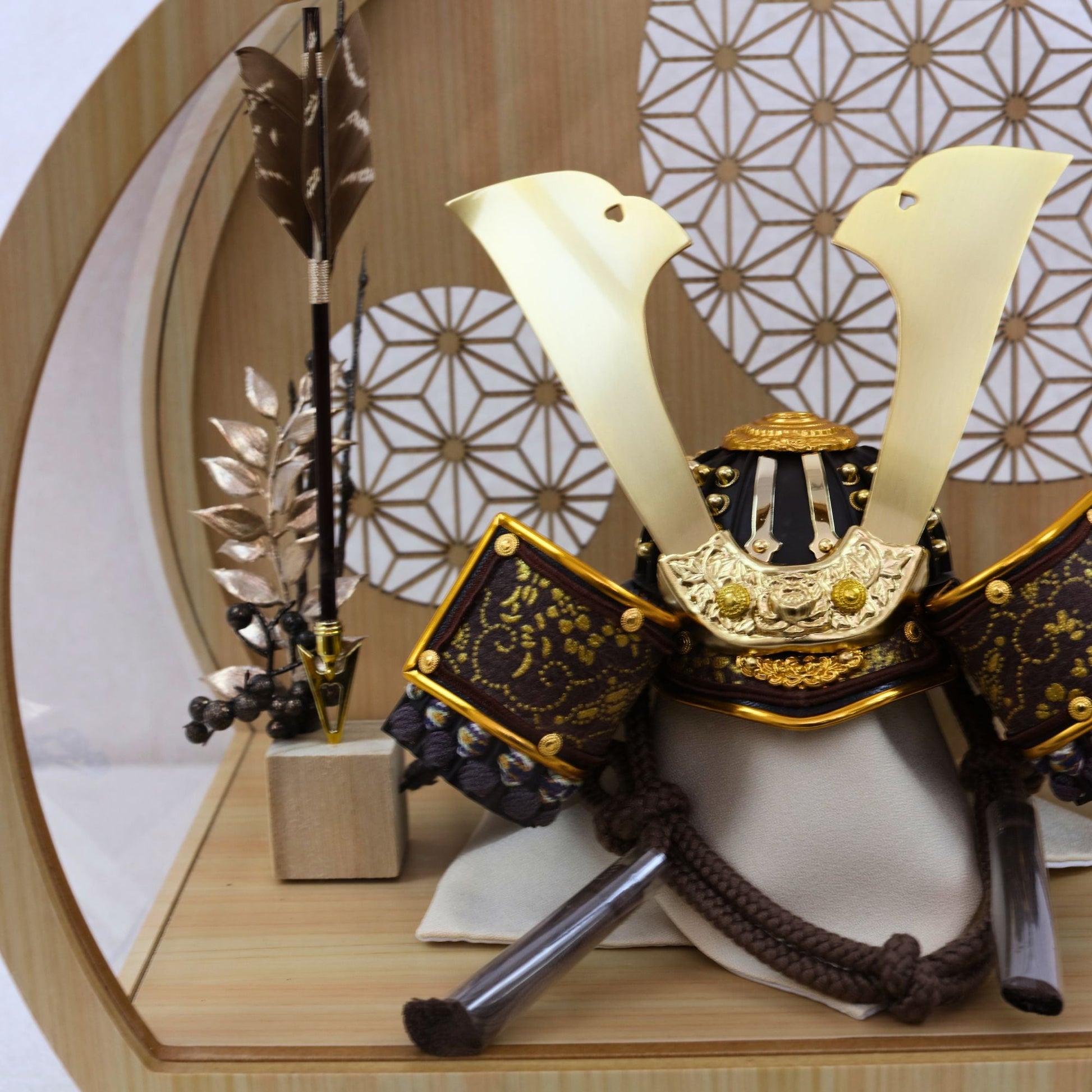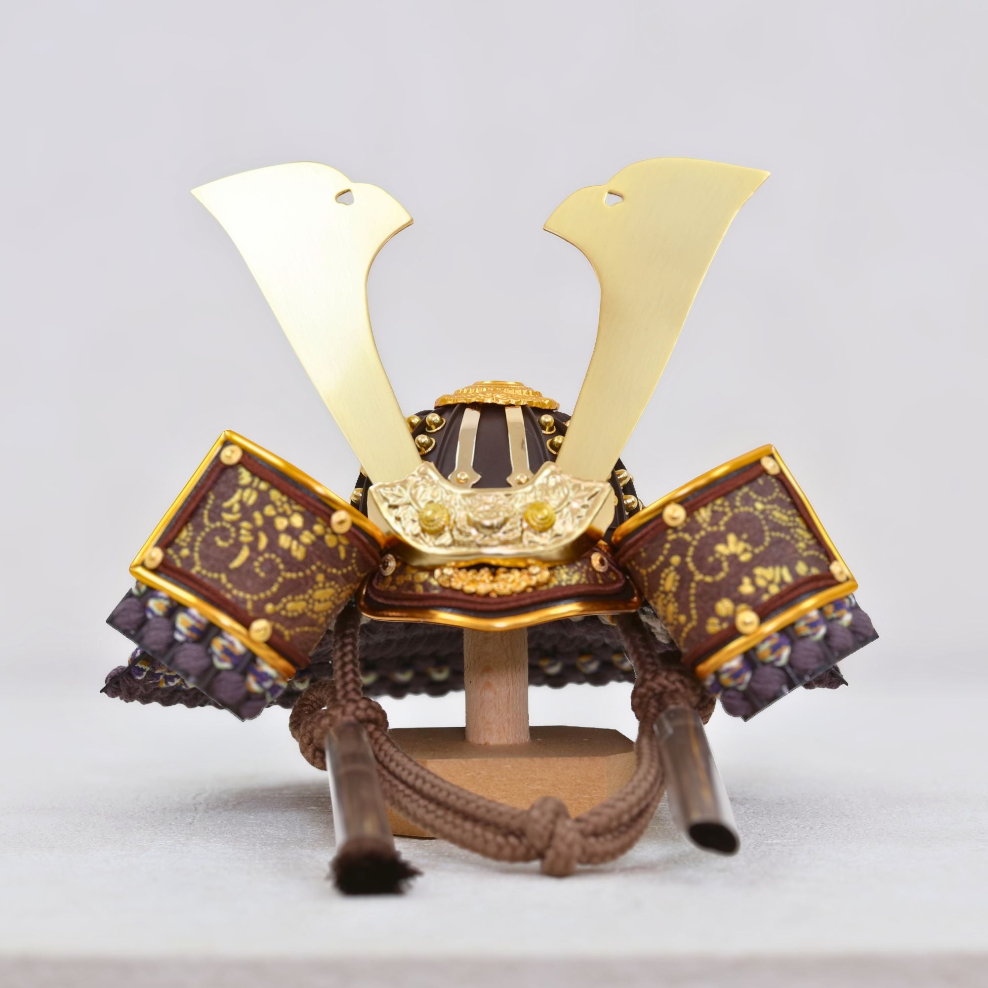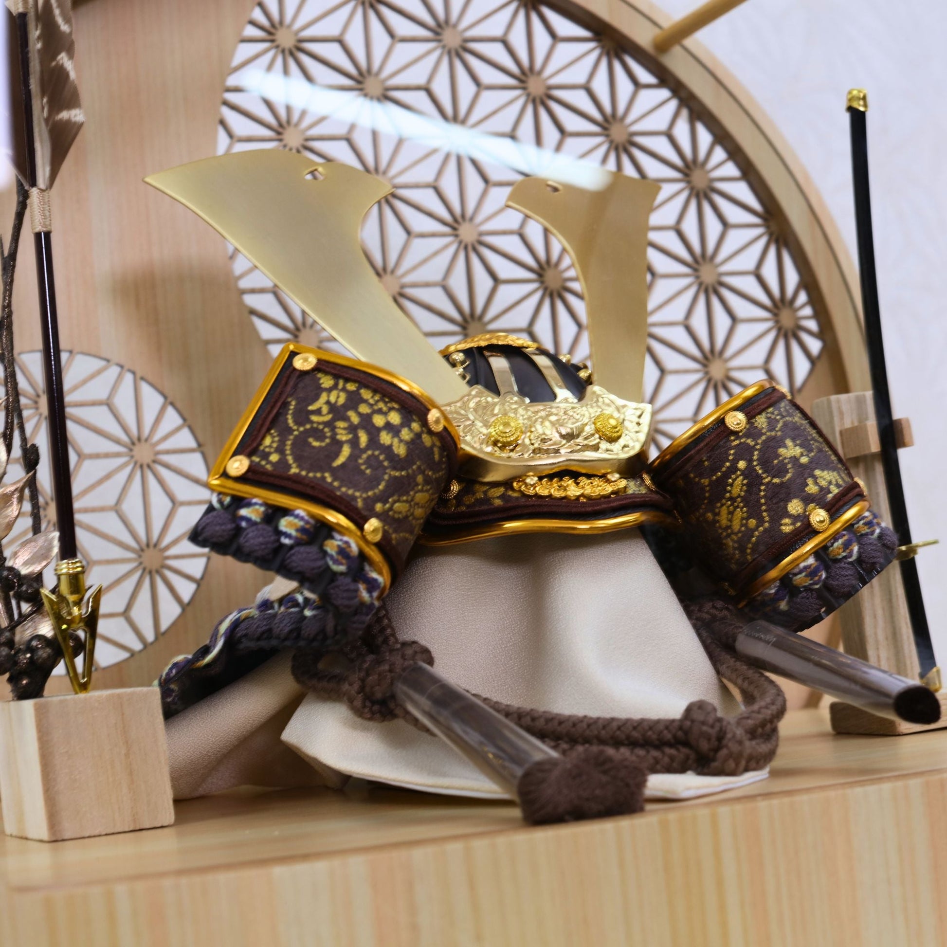 抑えの効いた金色の鍬形は、過度な装飾を避けた端正な形状で、兜全体を引き締めています。