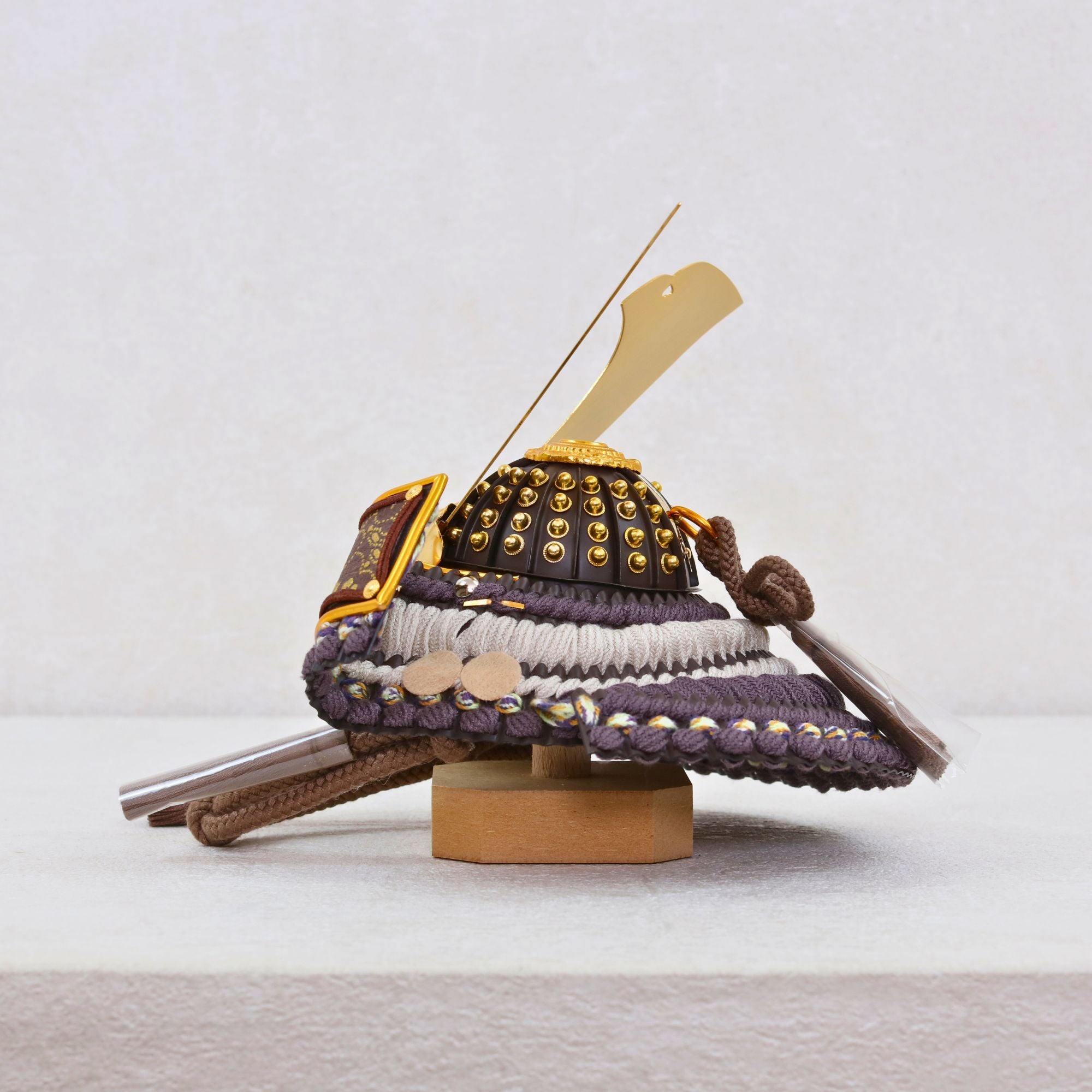 金具には、やや落ち着いた色味の金色を使用しています。強く光りすぎないため、吹き返しや威し糸の色と自然に馴染み、兜全体に統一感をもたらします。