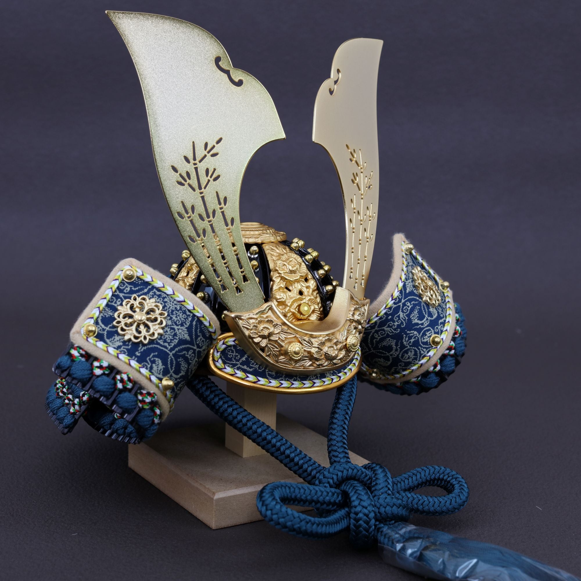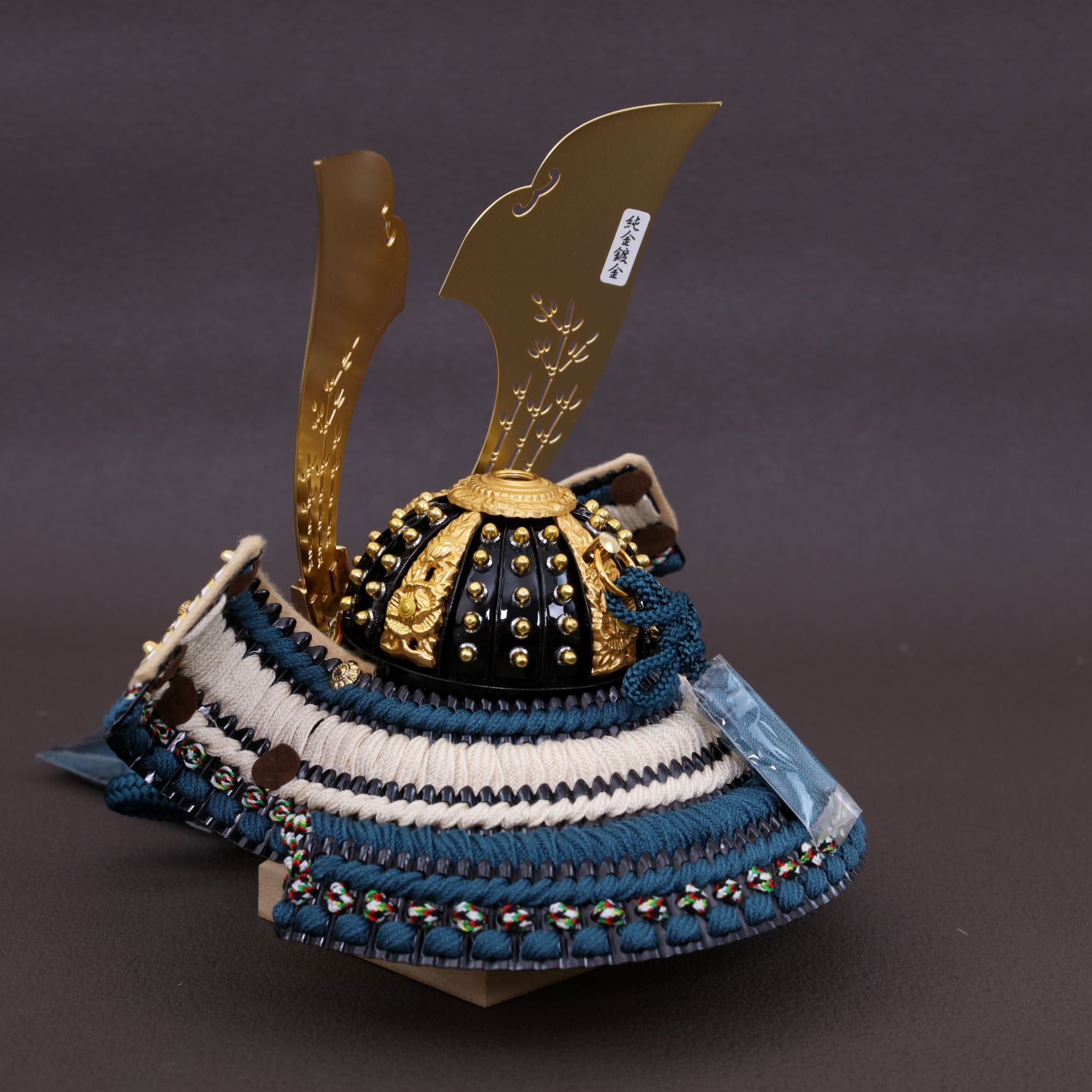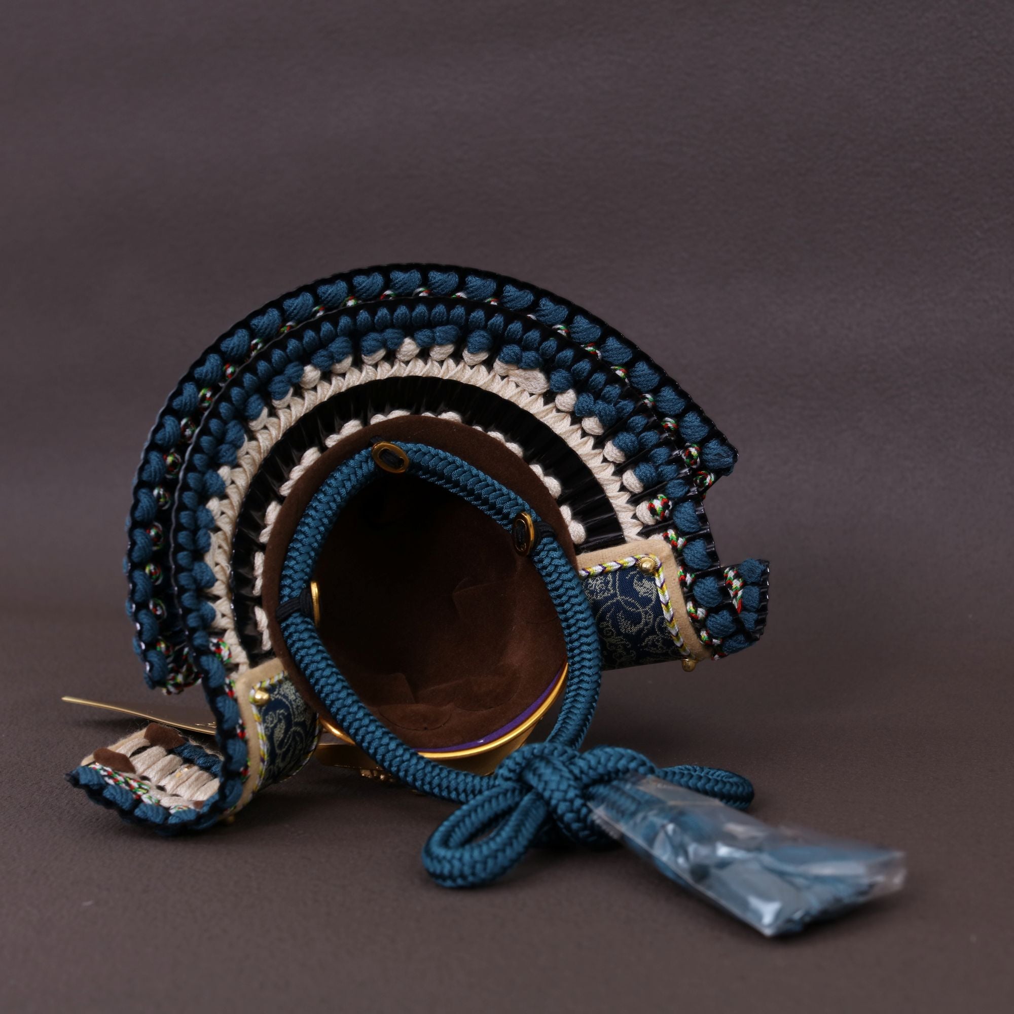 兜の後ろ姿には、青藍色の威し糸が丁寧に施されており、伝統と気品を感じさせる仕上がりとなっています。この深みのある色合いの糸が、兜全体に落ち着いた華やかさを添え、背面からも美しい印象を与えます。細部までこだわった職人の技が光る後ろ姿は、見る人の心を惹きつける存在感を放っています。