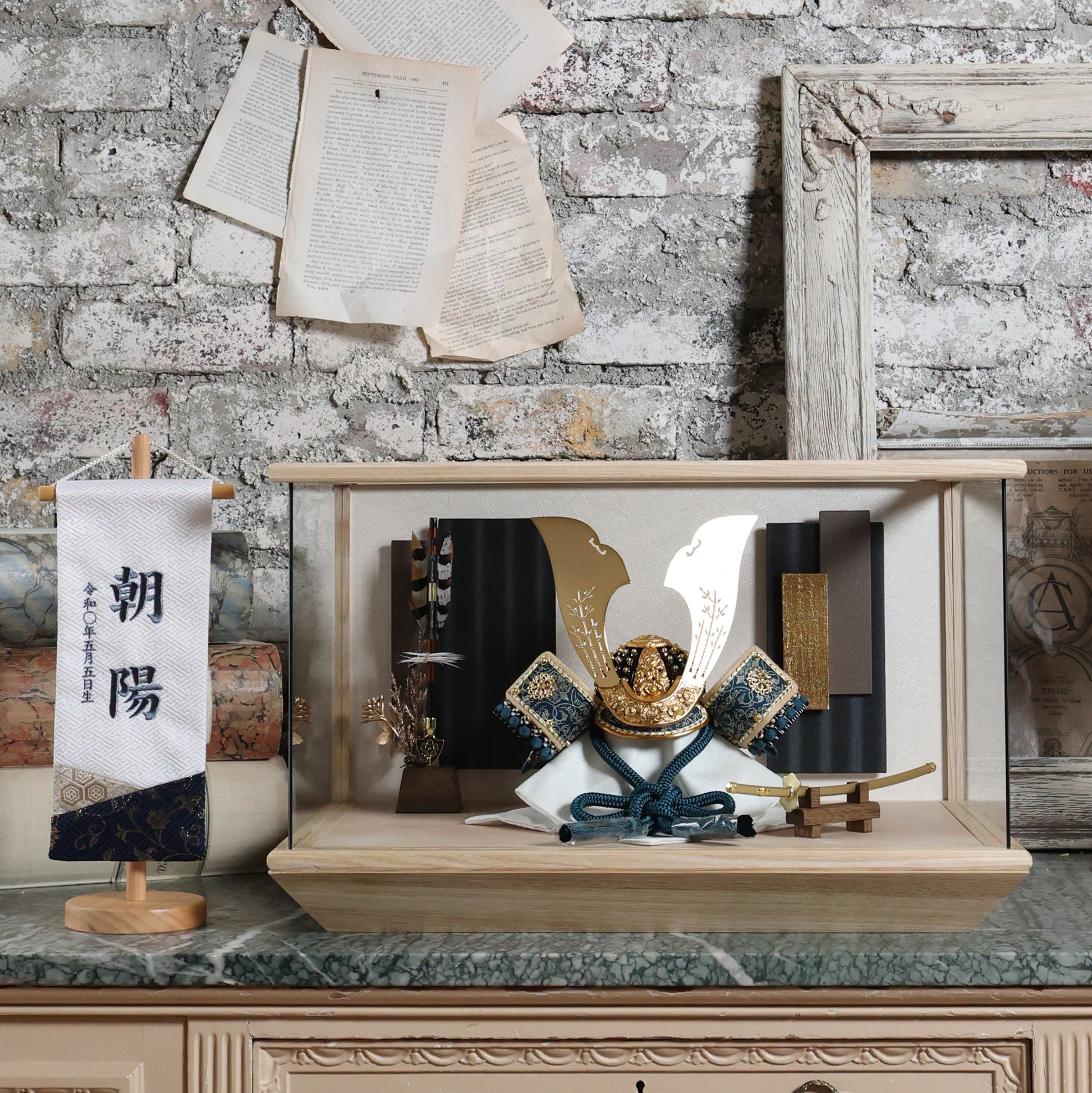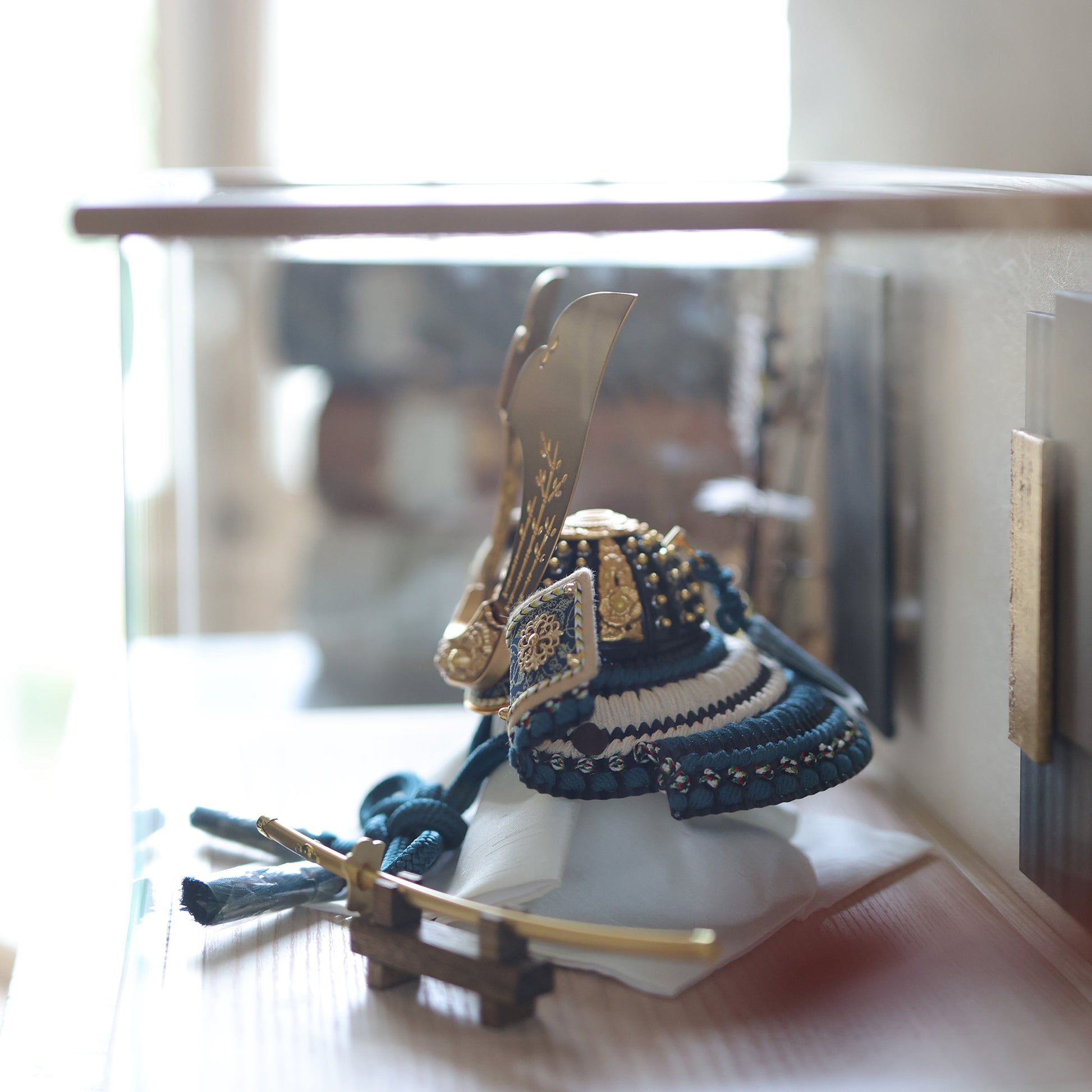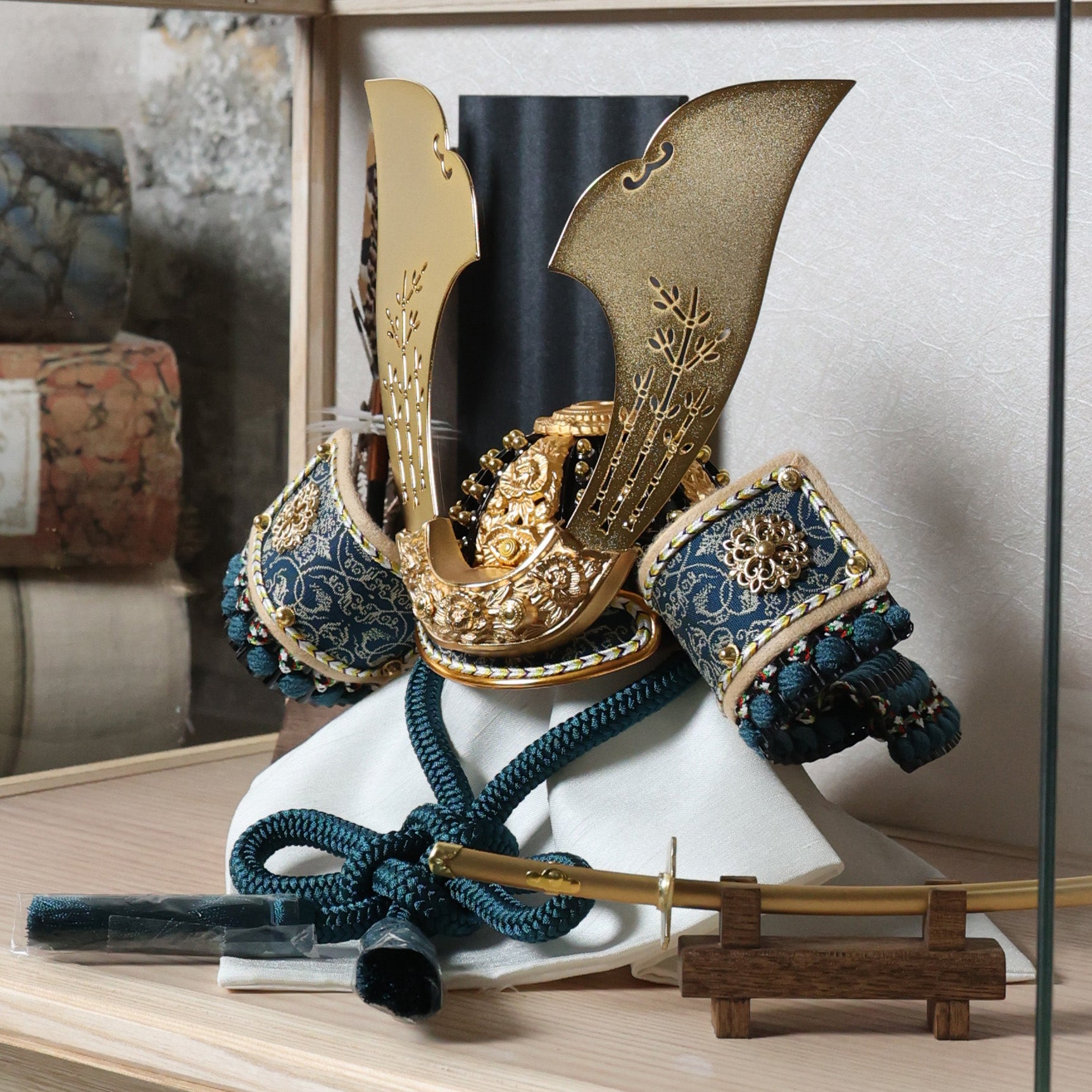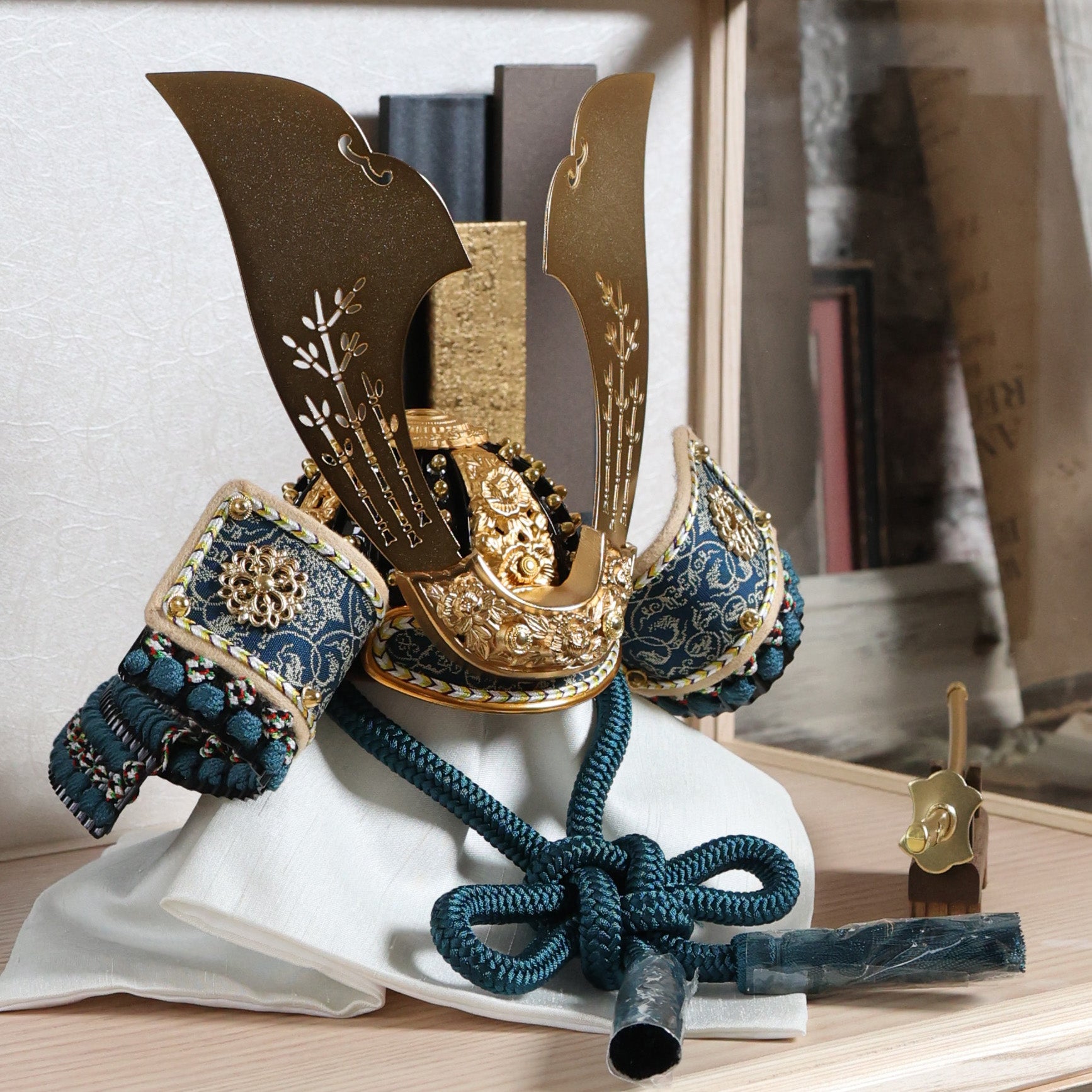 兜の後ろ姿には、青藍色の威し糸が丁寧に施されており、伝統と気品を感じさせる仕上がりとなっています。この深みのある色合いの糸が、兜全体に落ち着いた華やかさを添え、背面からも美しい印象を与えます。細部までこだわった職人の技が光る後ろ姿は、見る人の心を惹きつける存在感を放っています。