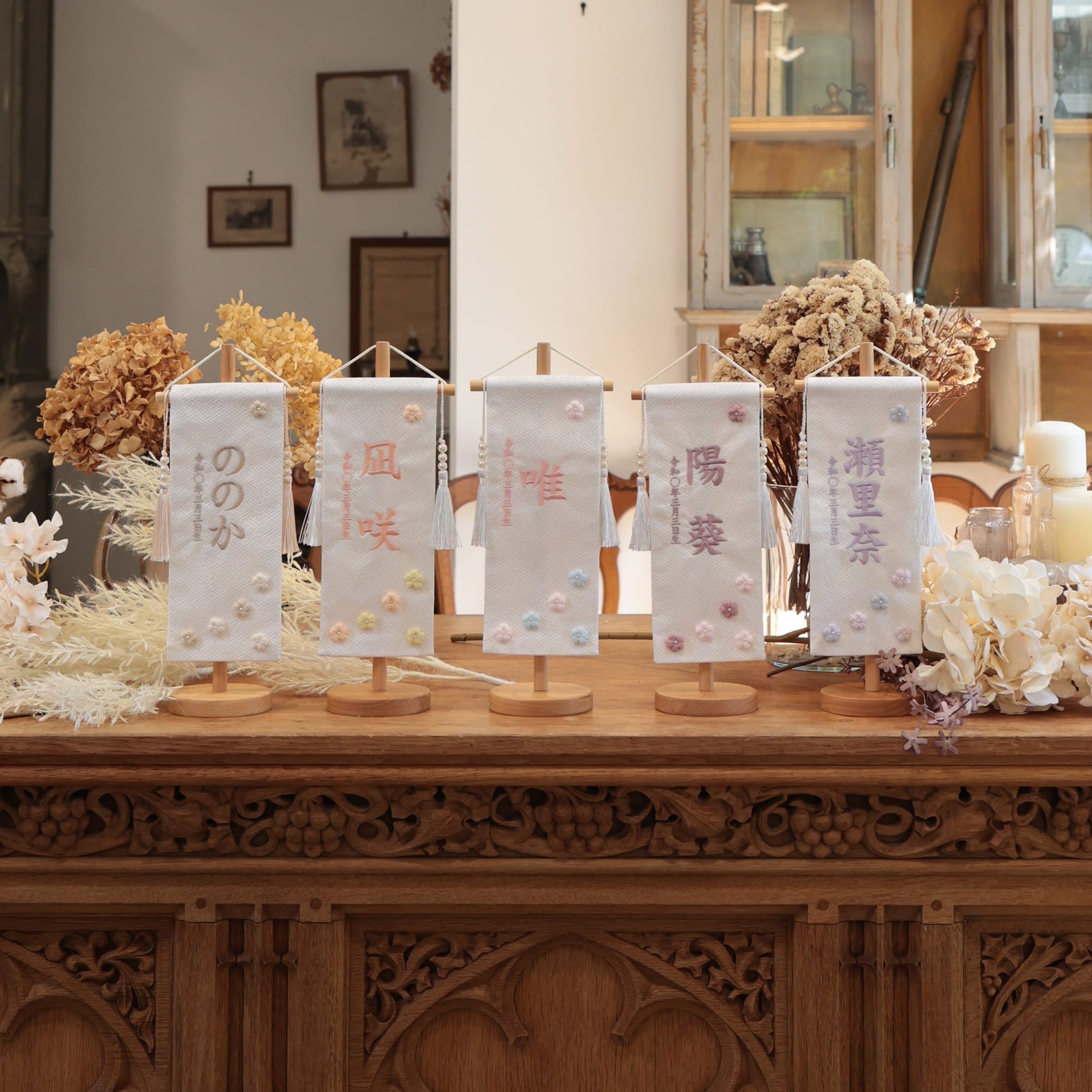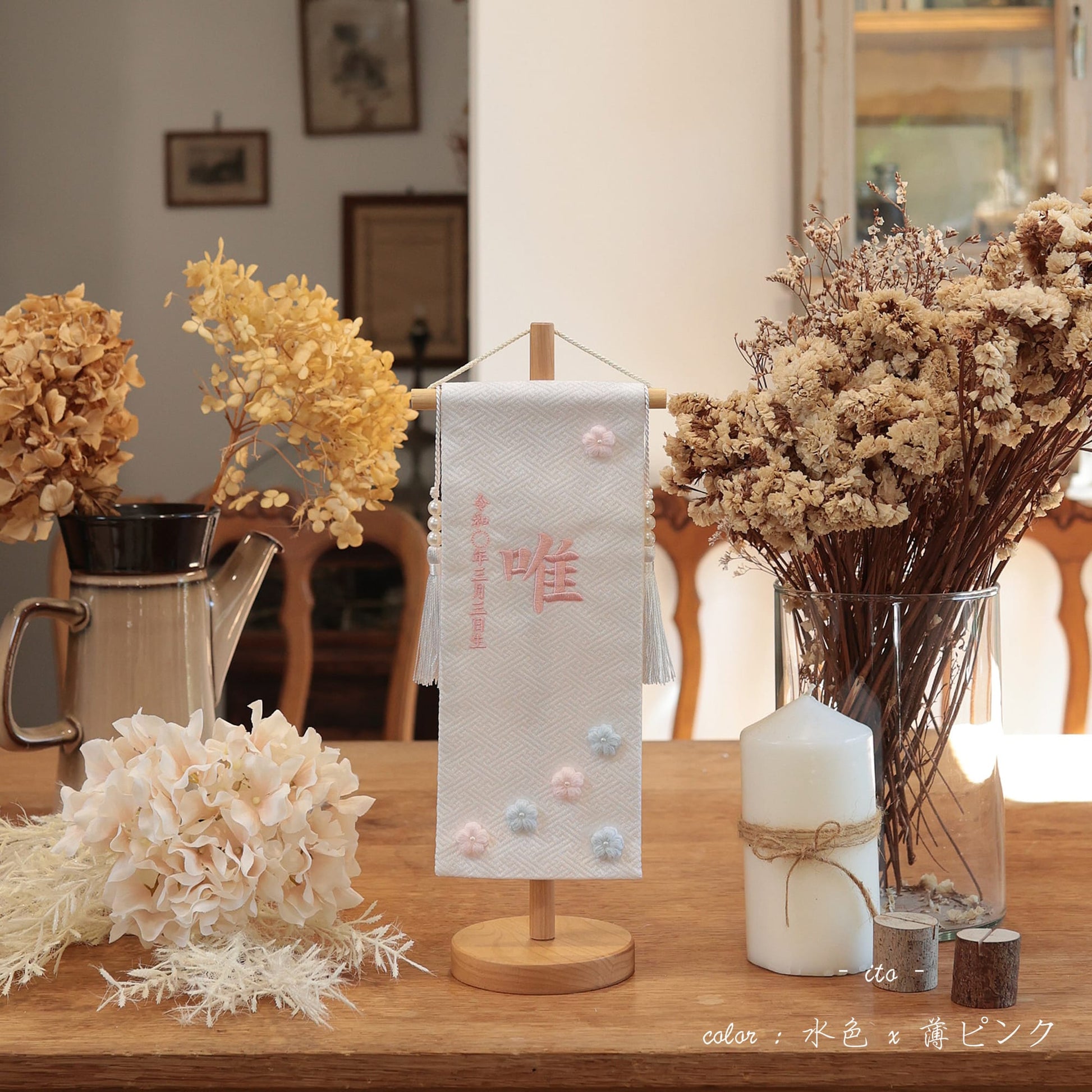 名前旗のデザインには、日本の伝統色を引き立てる洗練された美しさが込められています。祈りと願いを込めたデザイン設計は、祈デザイナーによって細部にまで丁寧に考案されています。生地選びから刺繍糸の色合わせに至るまで、すべてがこだわり抜かれ、ひとつひとつの要素が調和することで、特別な名前旗が完成します。