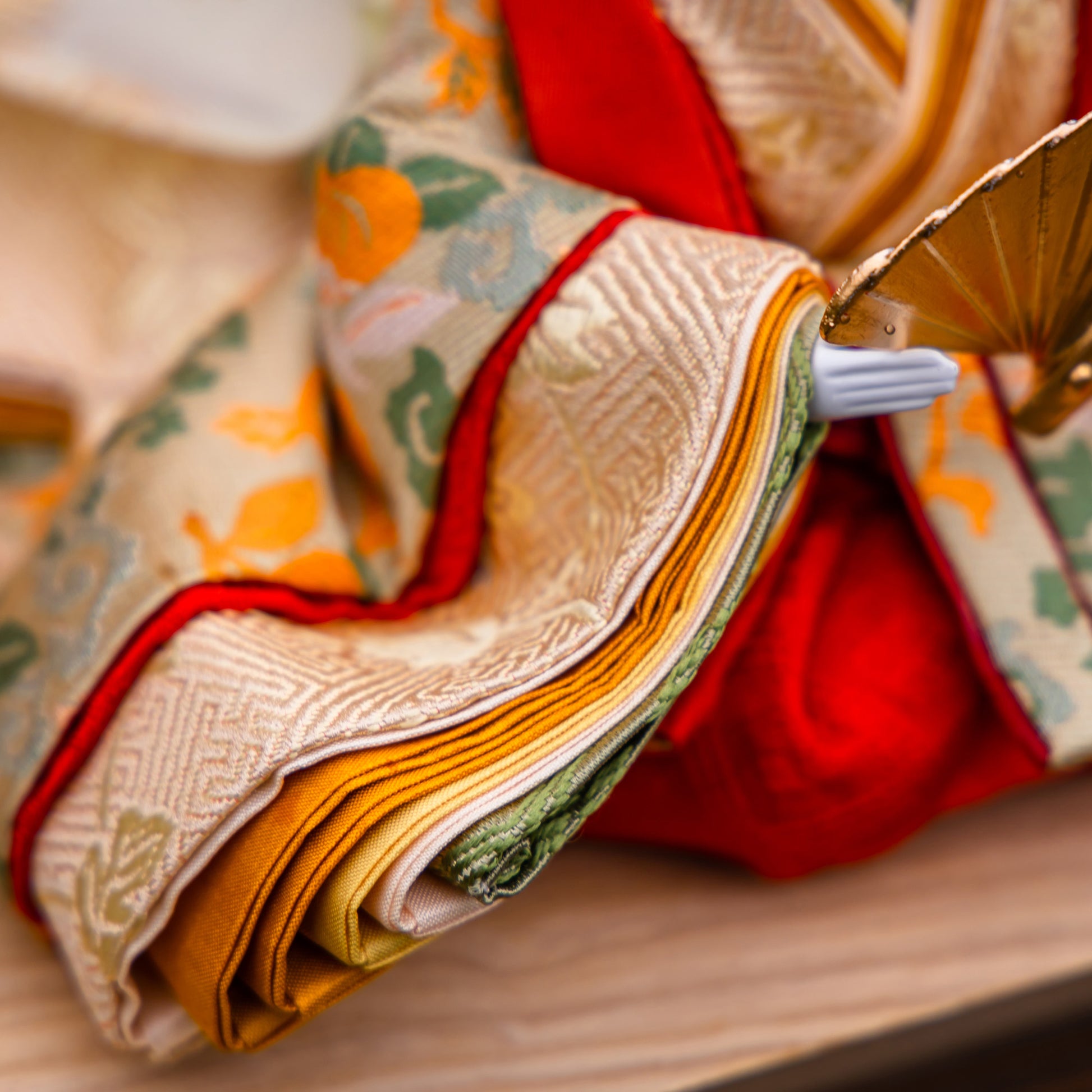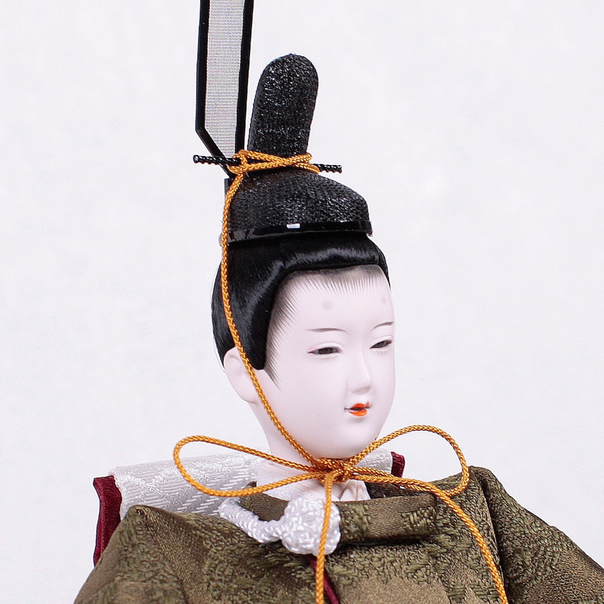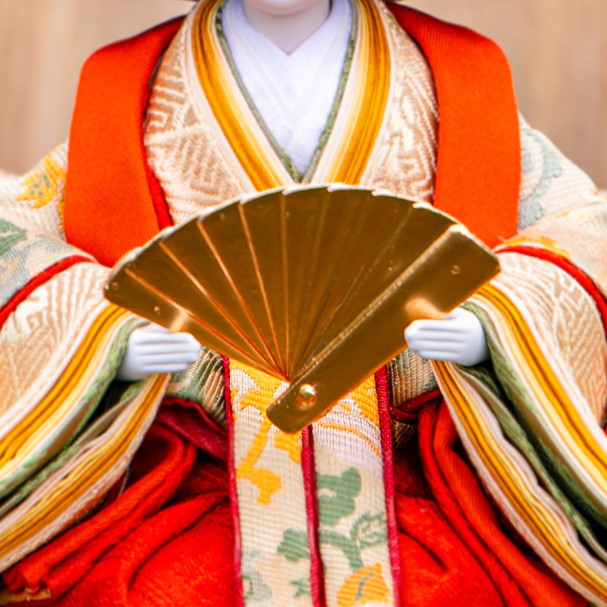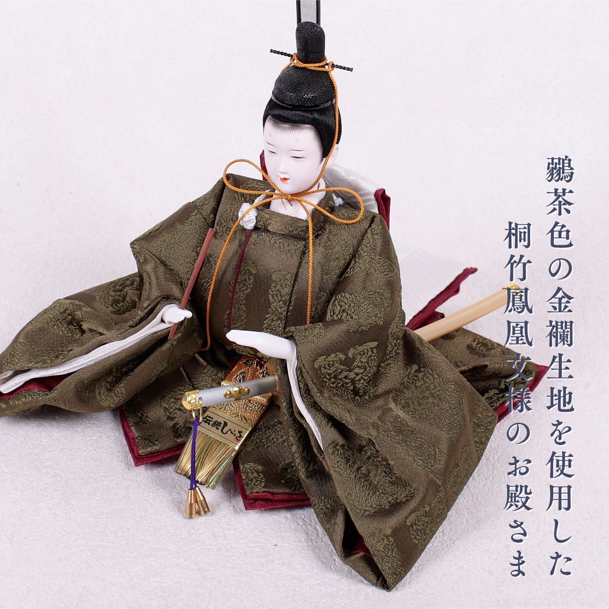 殿は鶸茶色の金襴に桐竹鳳凰文様を織り込み、天皇家の紋章や吉祥の象徴である桐と鳳凰で高貴さと未来の飛躍を祈ります。姫は亜麻色の正絹に唐花文様を施し、古くから花のように健やかに育つことを願った伝統的なお衣装です。