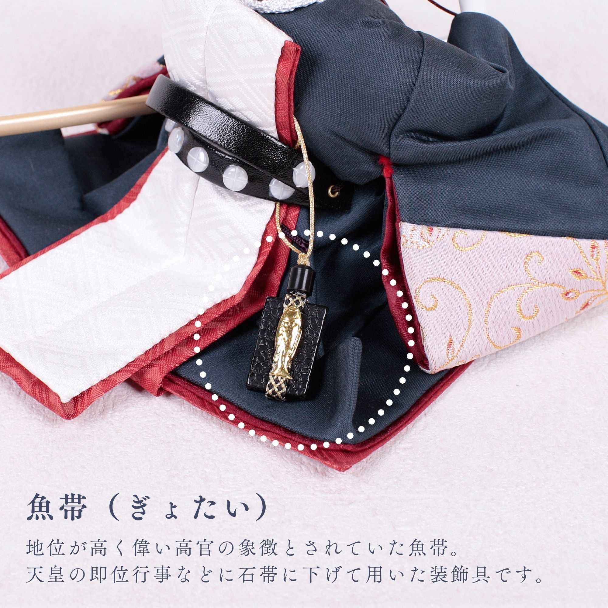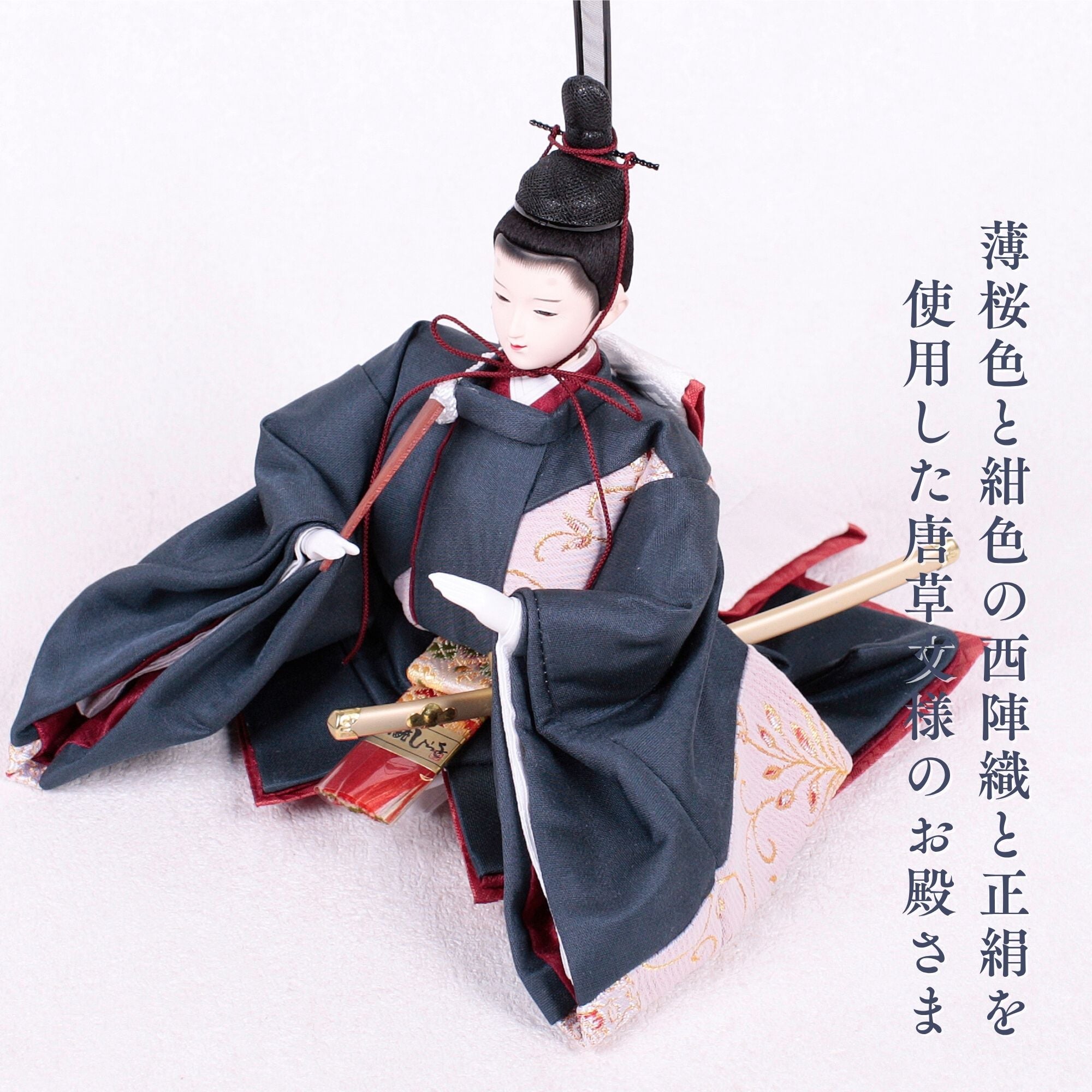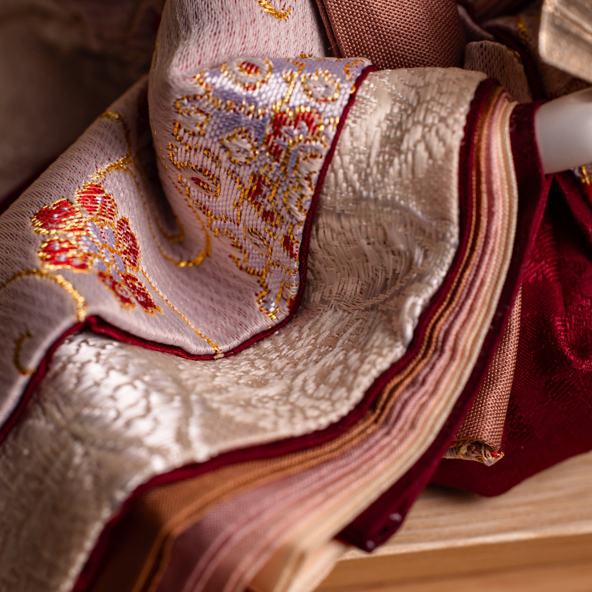 殿は薄桜色と紺色の西陣織に唐草文様を配し、穏やかで豊かな人生を願います。姫も薄桜色の西陣織に唐草文様を施し、花のように健やかで可憐な成長を祈った、古典と現代を繋ぐお衣装です。