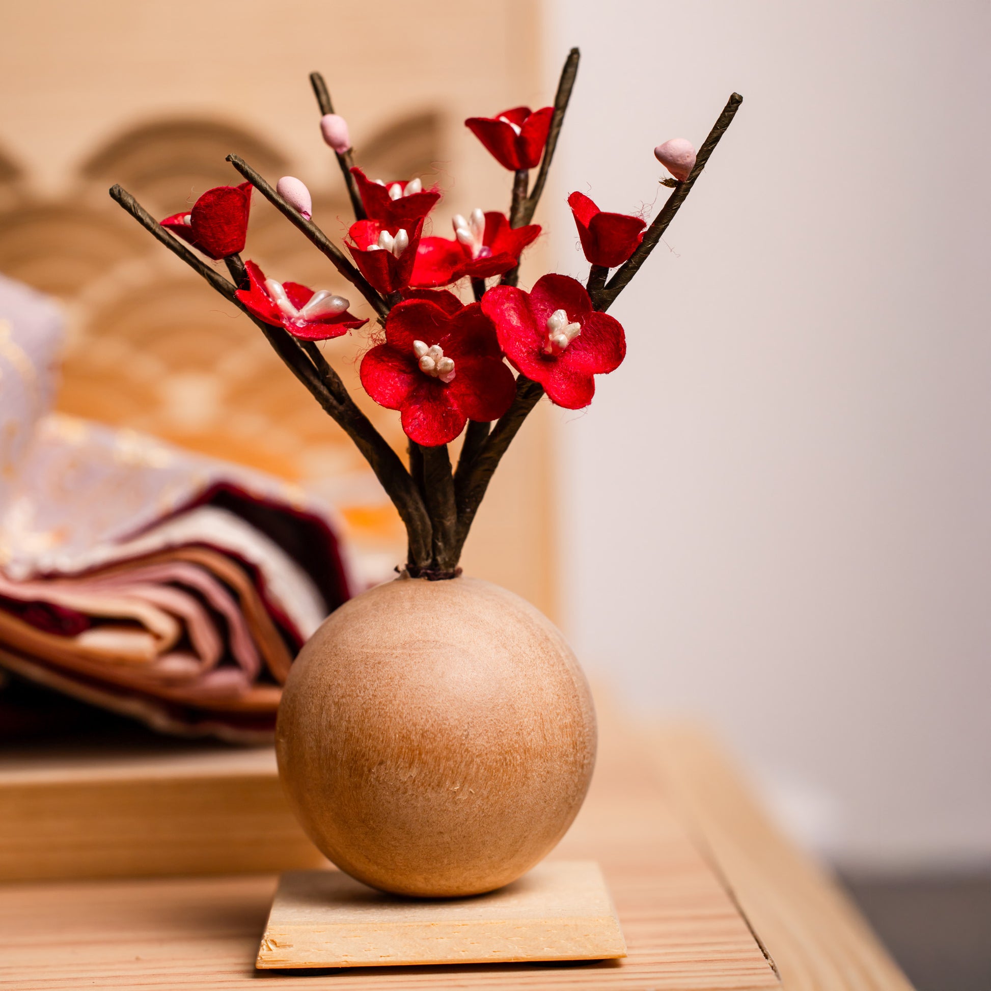 枝の流れを整え、さらに和紙を巻き付けて塗装することで、梅の木の自然な質感を丁寧に表現しています。丸く削り出した木の花器が、やわらかでかわいらしい印象を添える一品です。