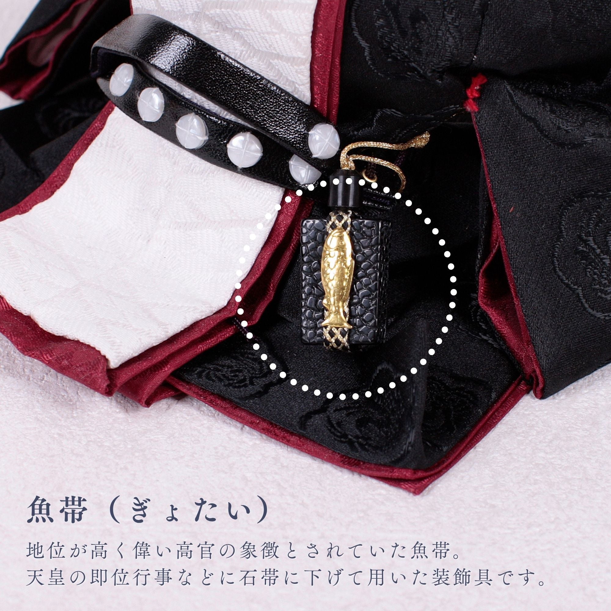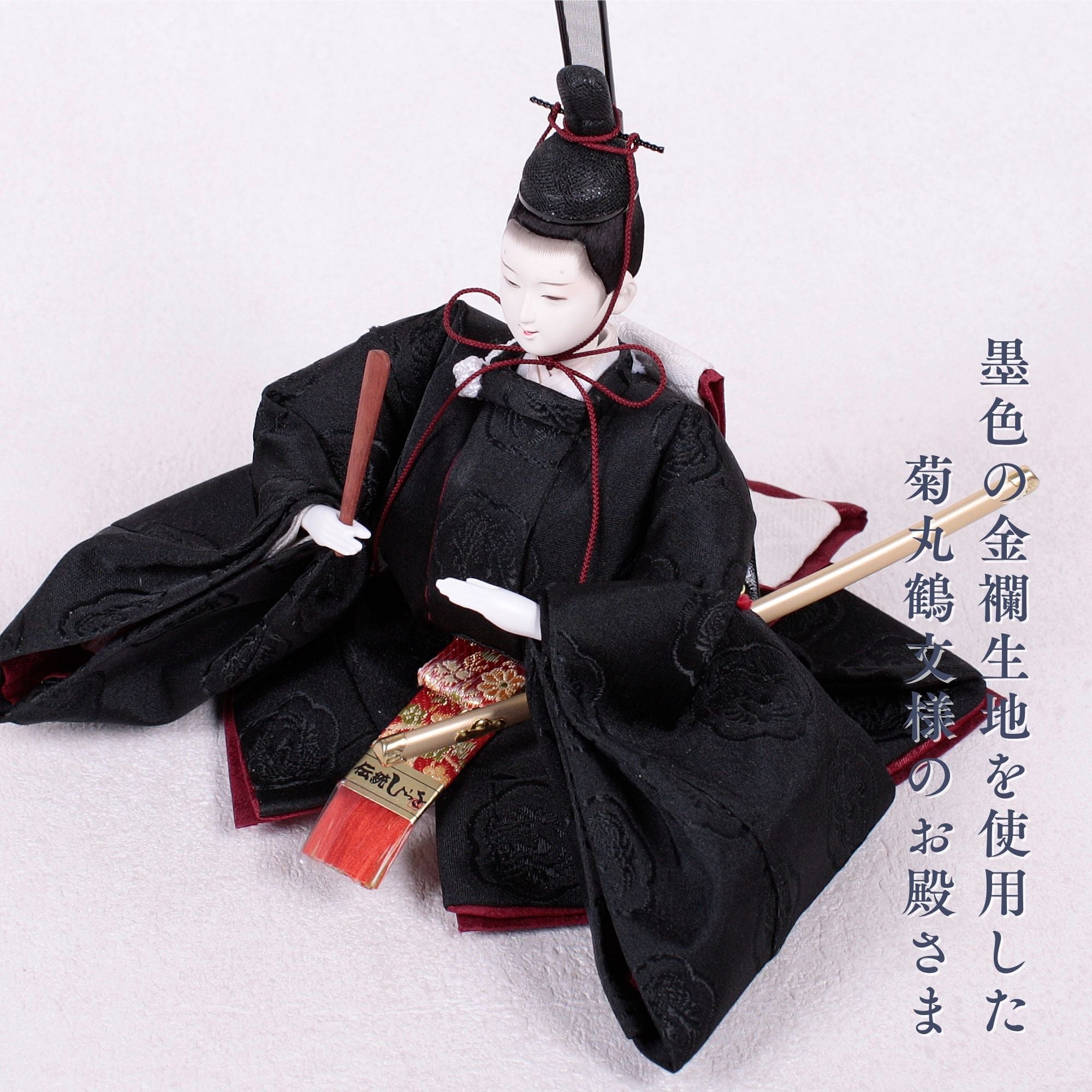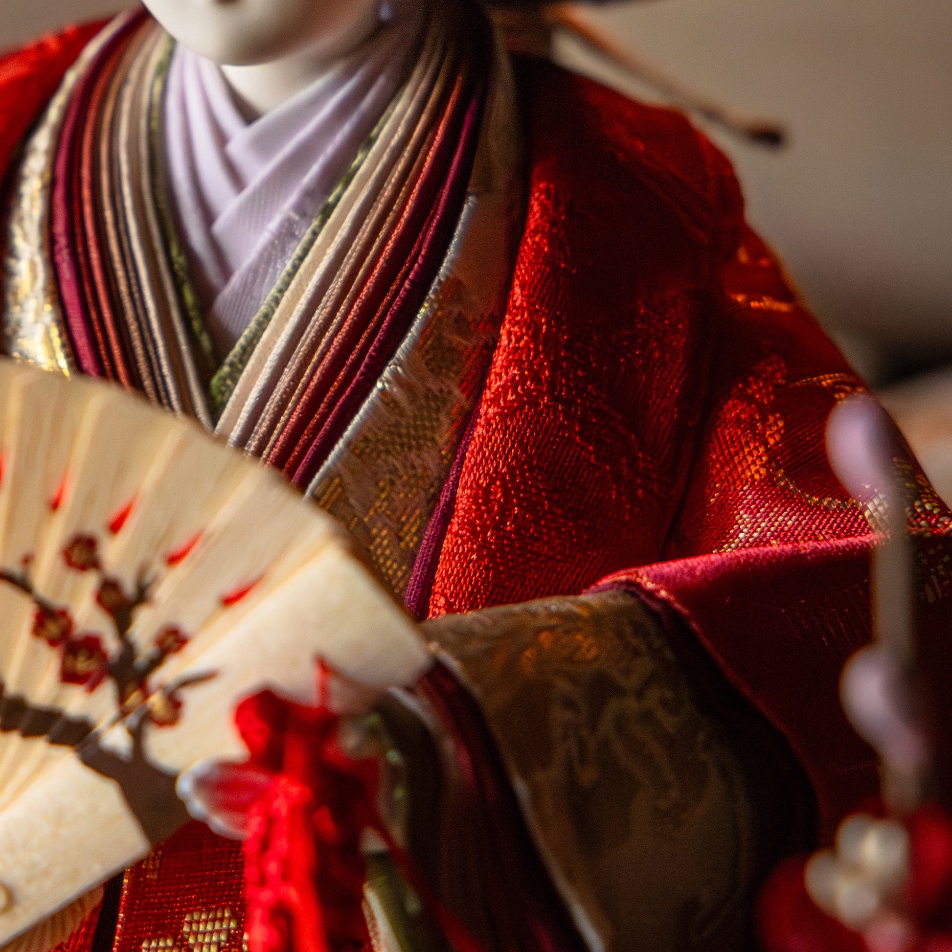 殿は墨色の金襴に菊丸鶴文様をあしらい、古来より長寿と高貴さの象徴とされた鶴と菊の組み合わせで、子どもの健やかな成長と人生の安泰を祈ります。姫は紅赤色の華頂錦二丁生地に小花散らしを施し、江戸時代より祝いの色とされる紅をまとい、明るく華やかに育つことを願ったお衣装です。