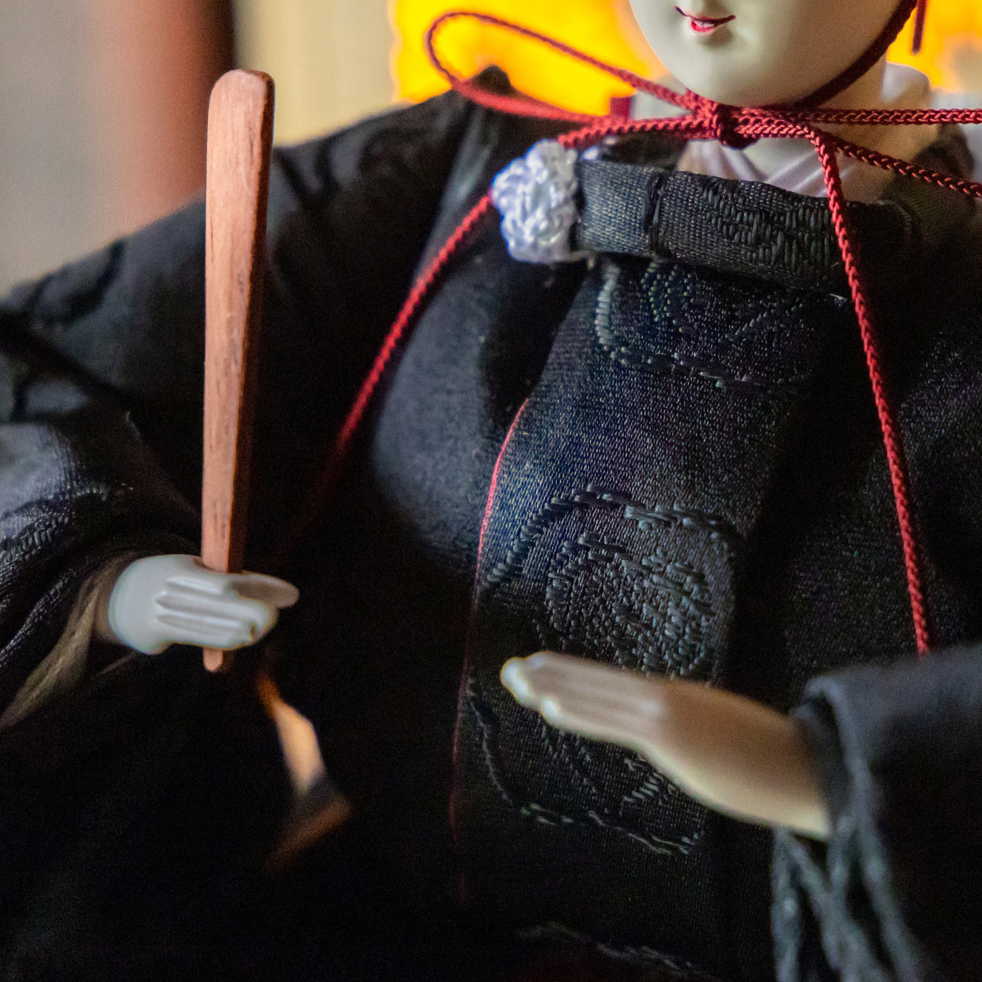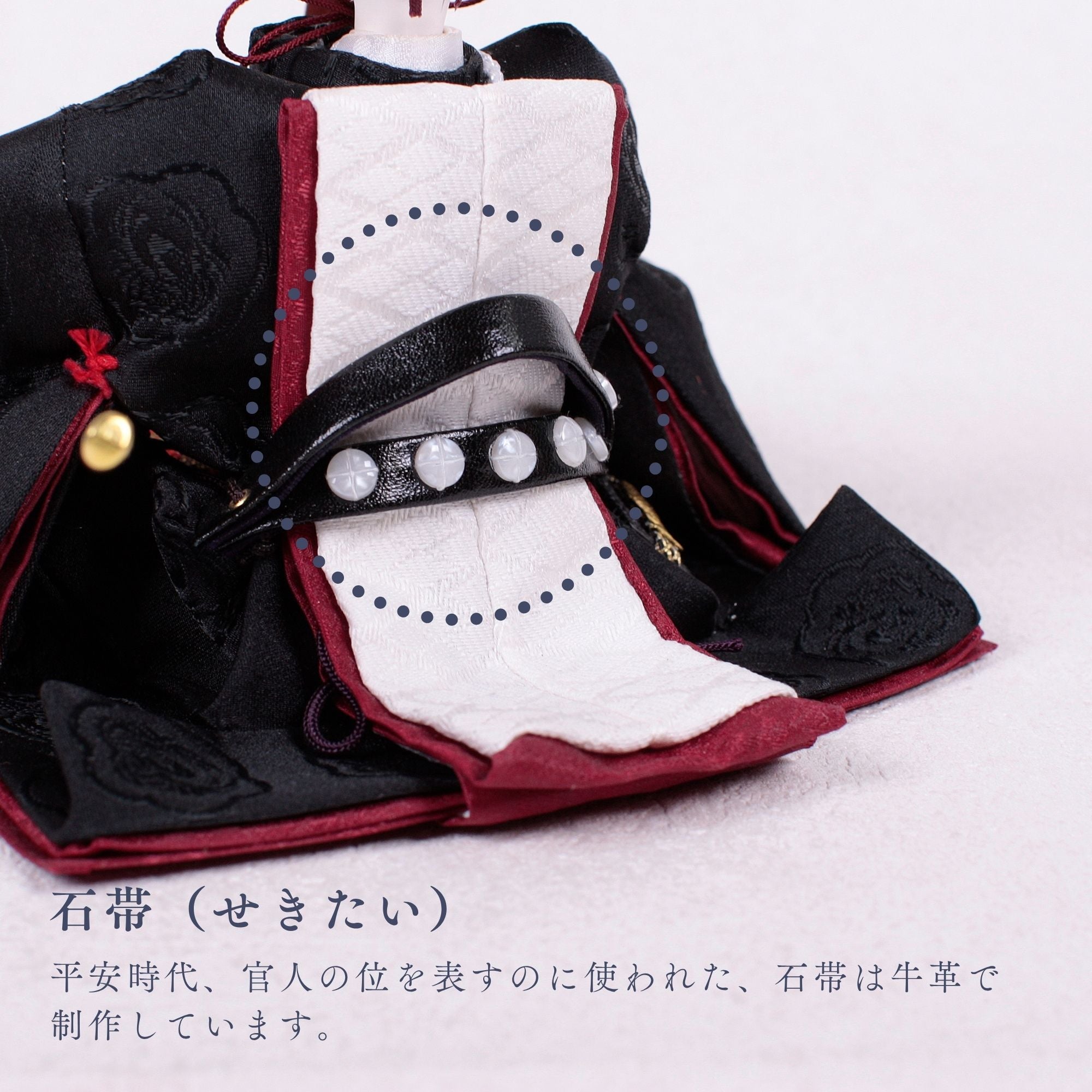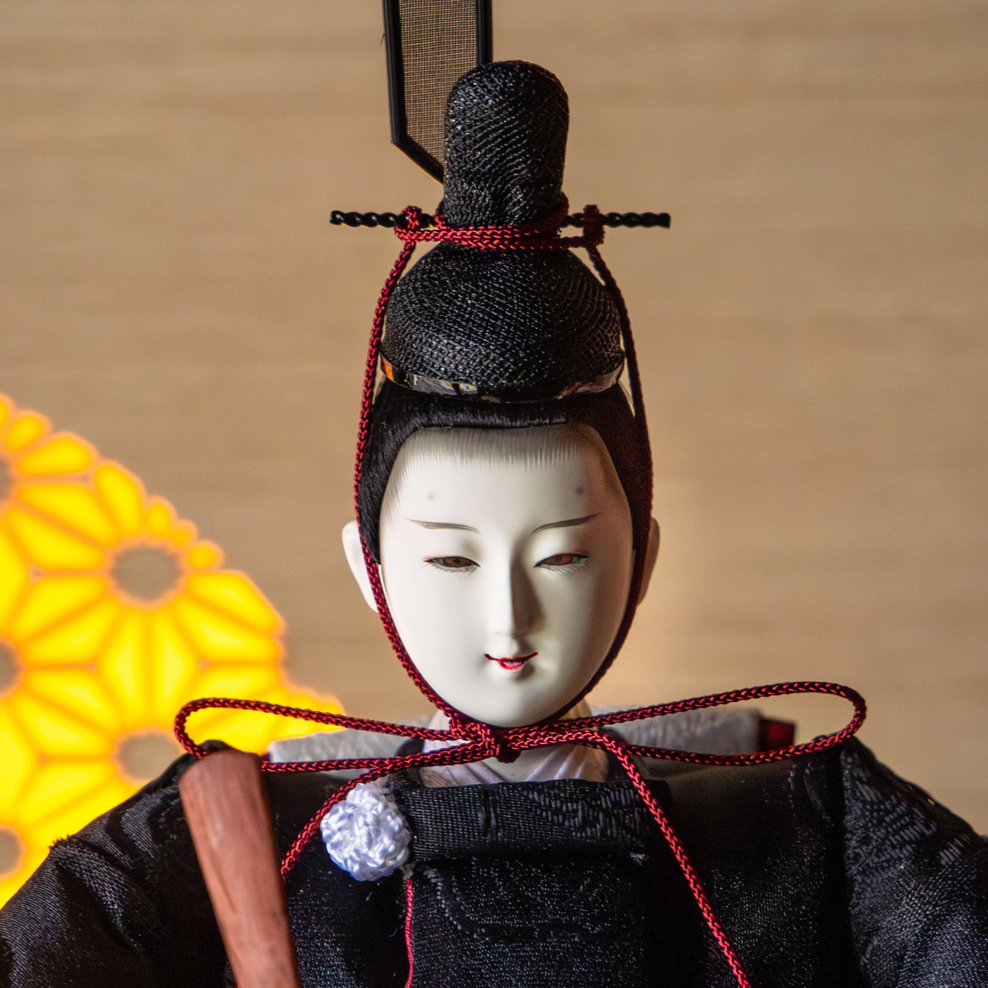 殿は墨色の金襴に菊丸鶴文様をあしらい、古来より長寿と高貴さの象徴とされた鶴と菊の組み合わせで、子どもの健やかな成長と人生の安泰を祈ります。姫は紅赤色の華頂錦二丁生地に小花散らしを施し、江戸時代より祝いの色とされる紅をまとい、明るく華やかに育つことを願ったお衣装です。