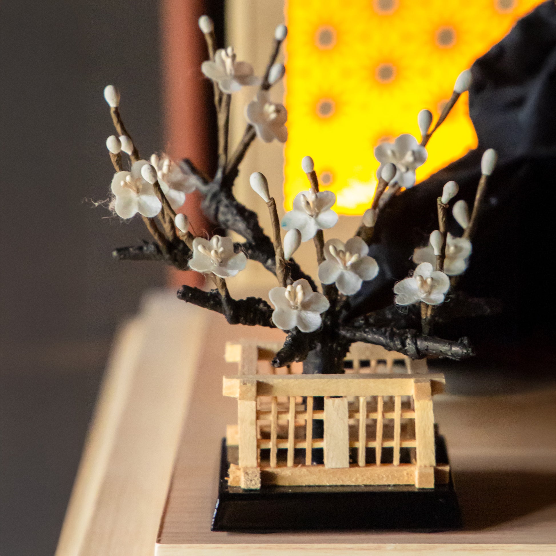 紅白の梅をあしらった飾りです。花器の台には漆を施し、上品な艶を添えました。梅の花びらやつぼみは、一つひとつ手作業で細かく再現。枝は上から和紙を巻いて塗装することで、本物の梅木のような自然な風合いに仕上げています。