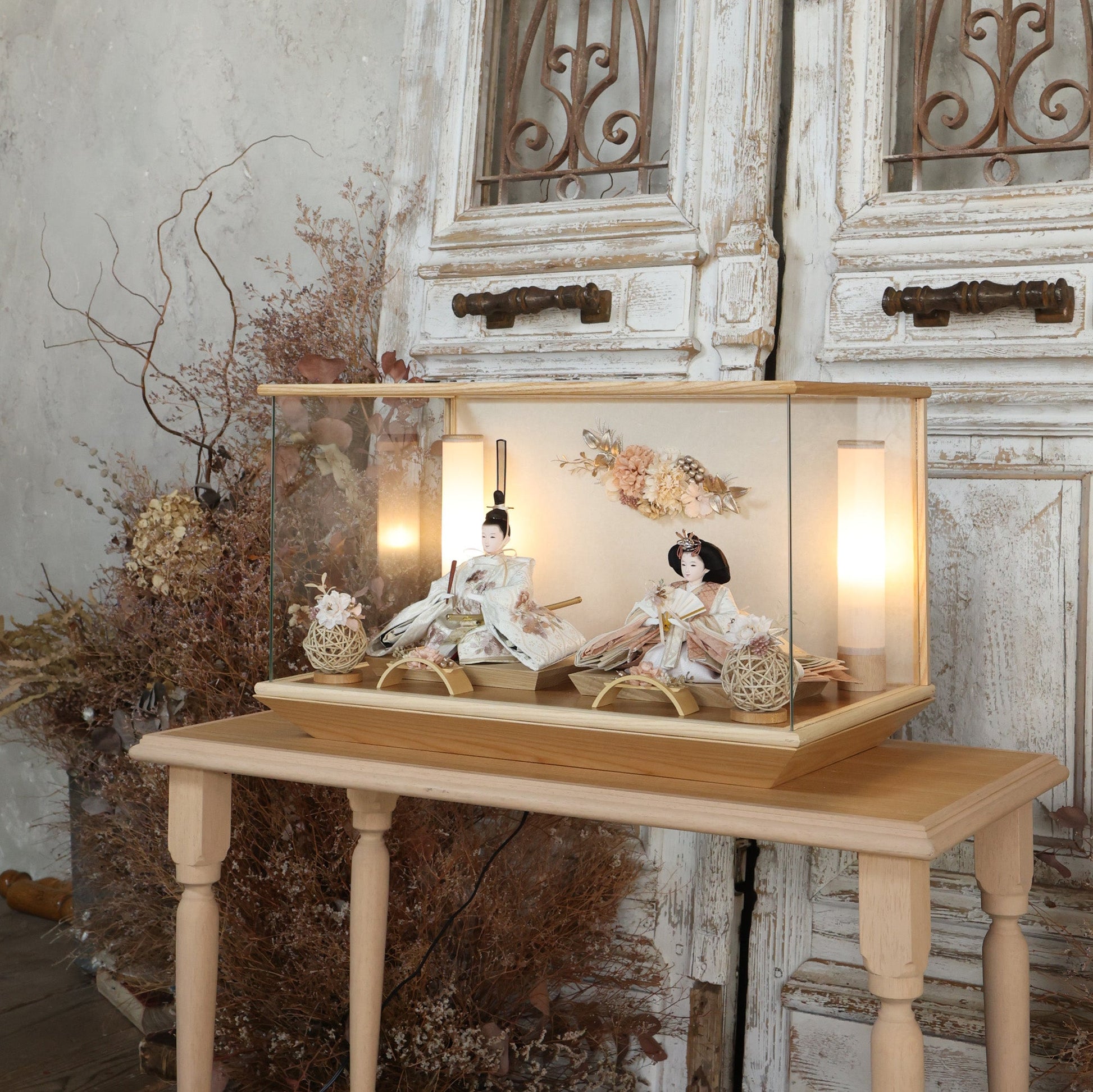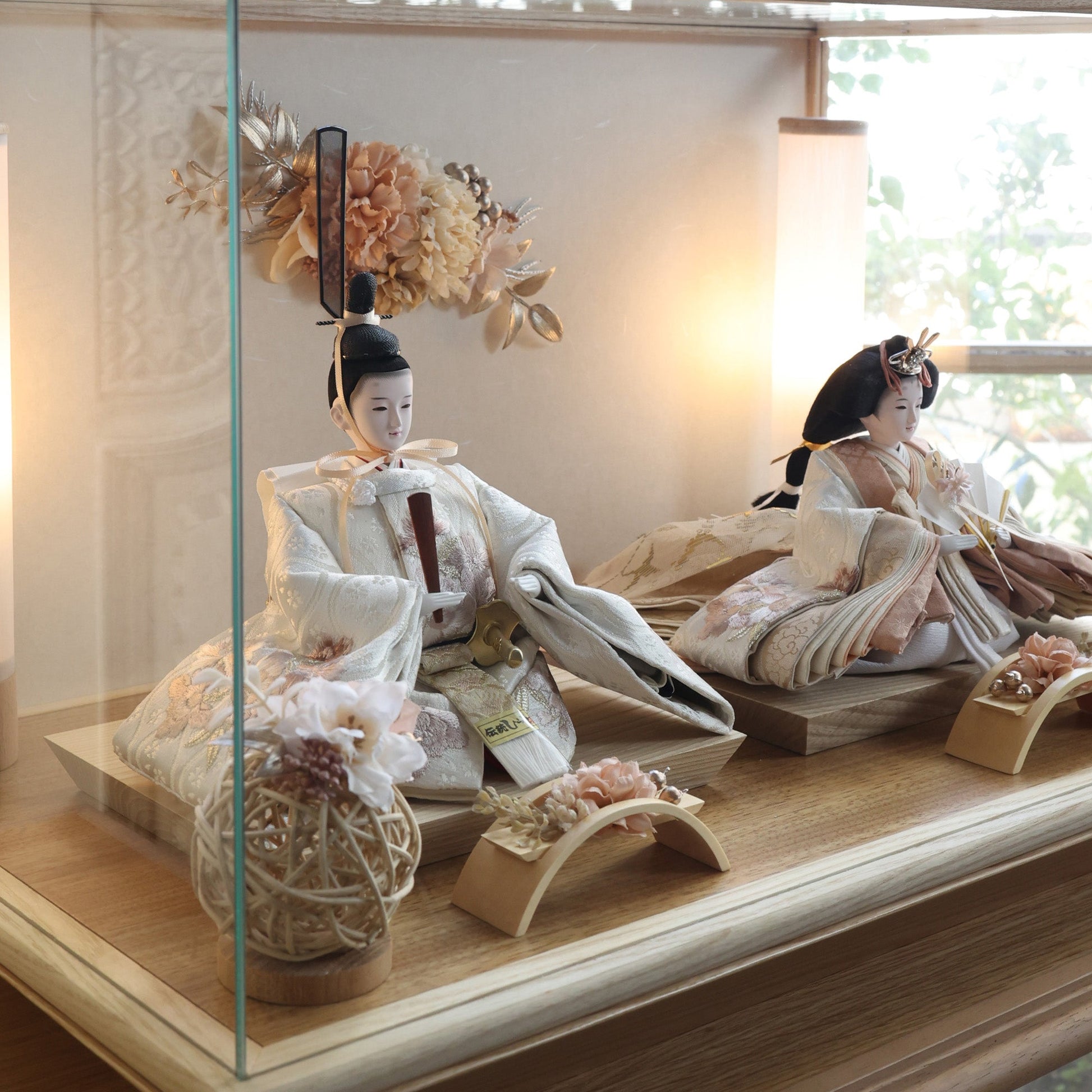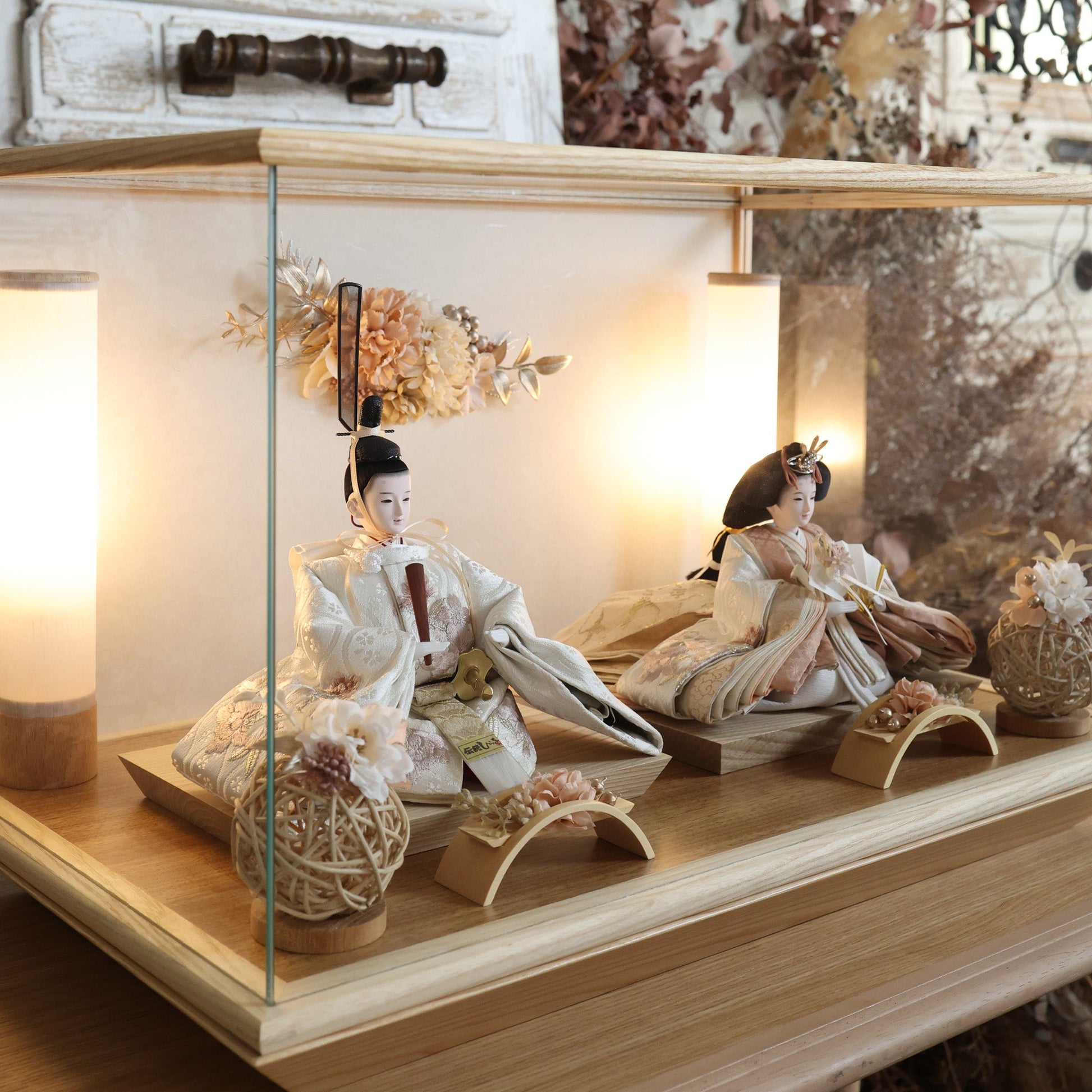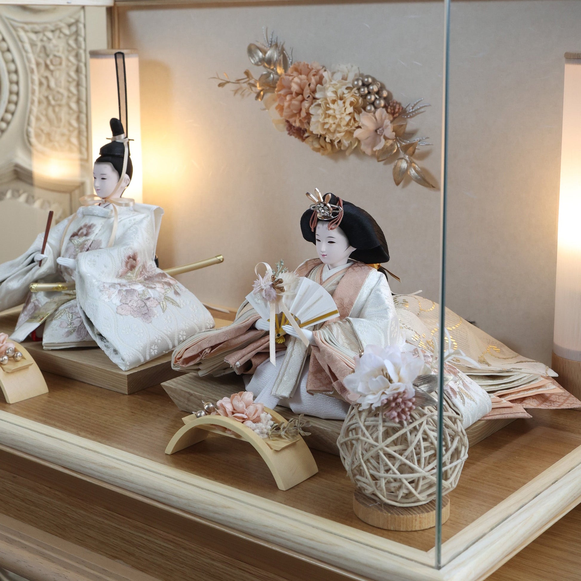 通常2mm厚が一般的な中、当店ではより高品質なAGC製3mmガラスを採用しています。厚みが増すことで強度と安全性が高まり、透明度の高いクリアな美しさを保ちます。大切な雛人形を守りながら、高級感のある見栄えを実現しています。