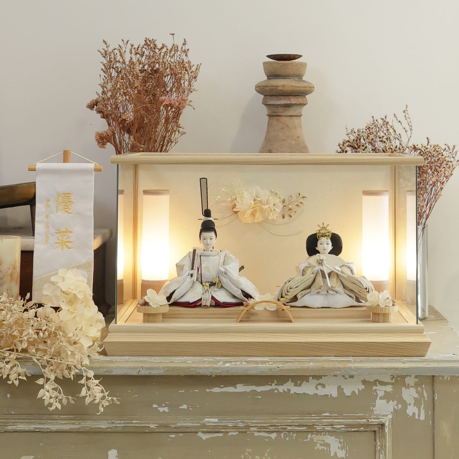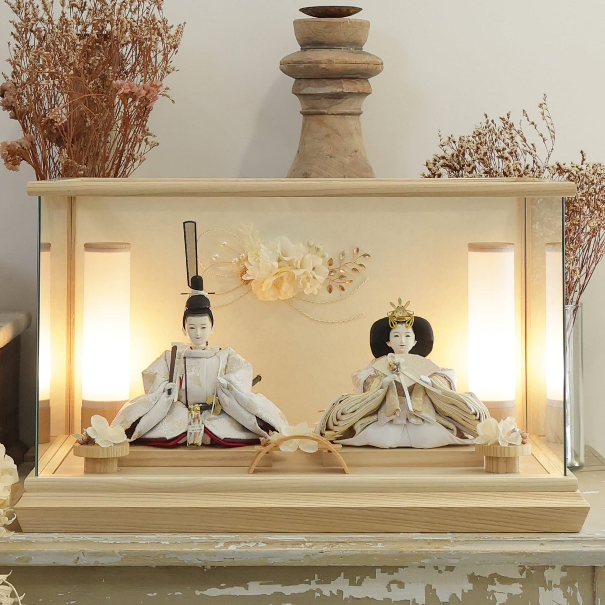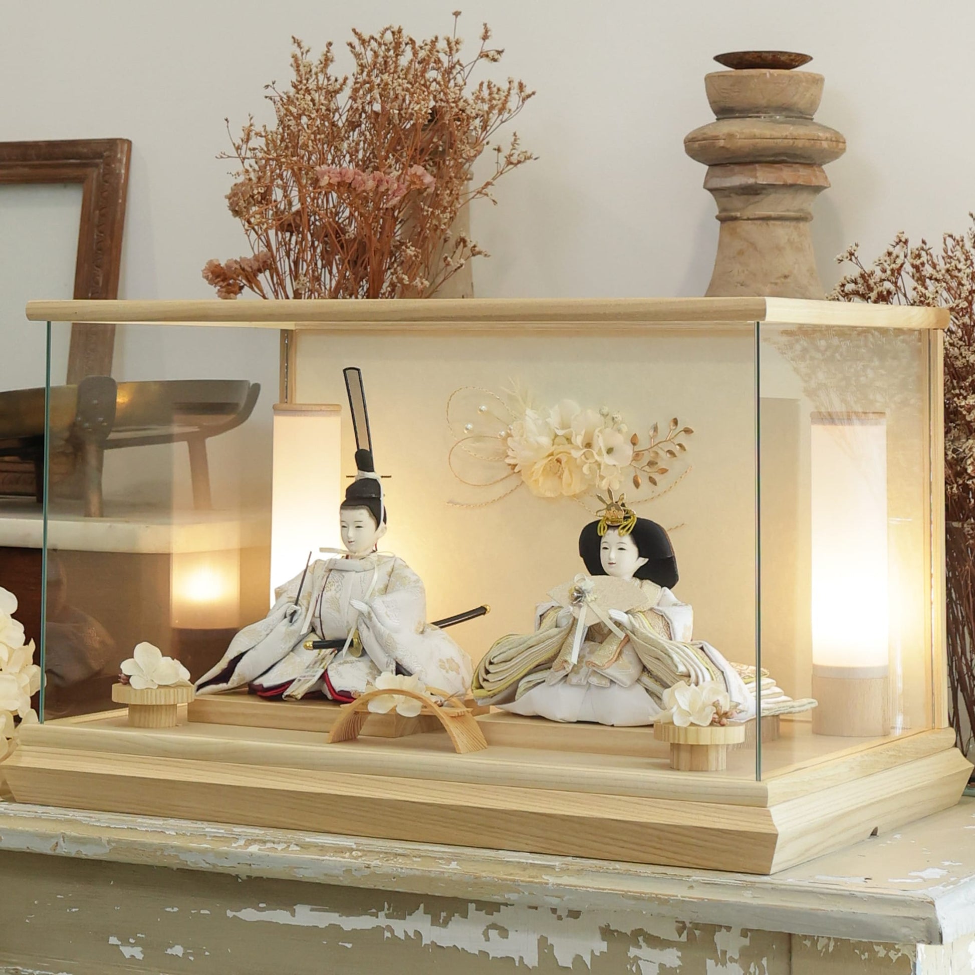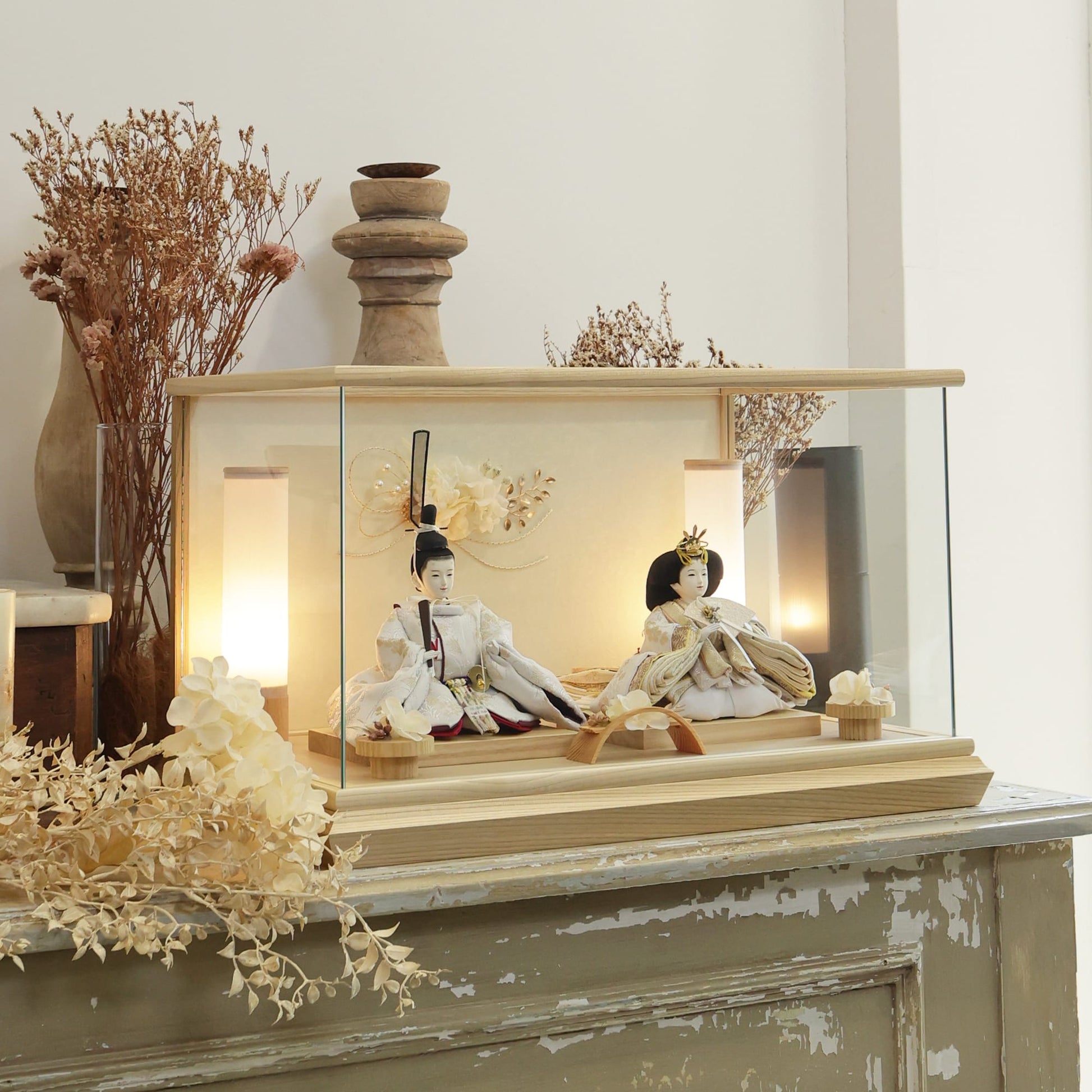 通常2mm厚が一般的な中、当店ではより高品質なAGC製3mmガラスを採用しています。厚みが増すことで強度と安全性が高まり、透明度の高いクリアな美しさを保ちます。大切な雛人形を守りながら、高級感のある見栄えを実現しています。