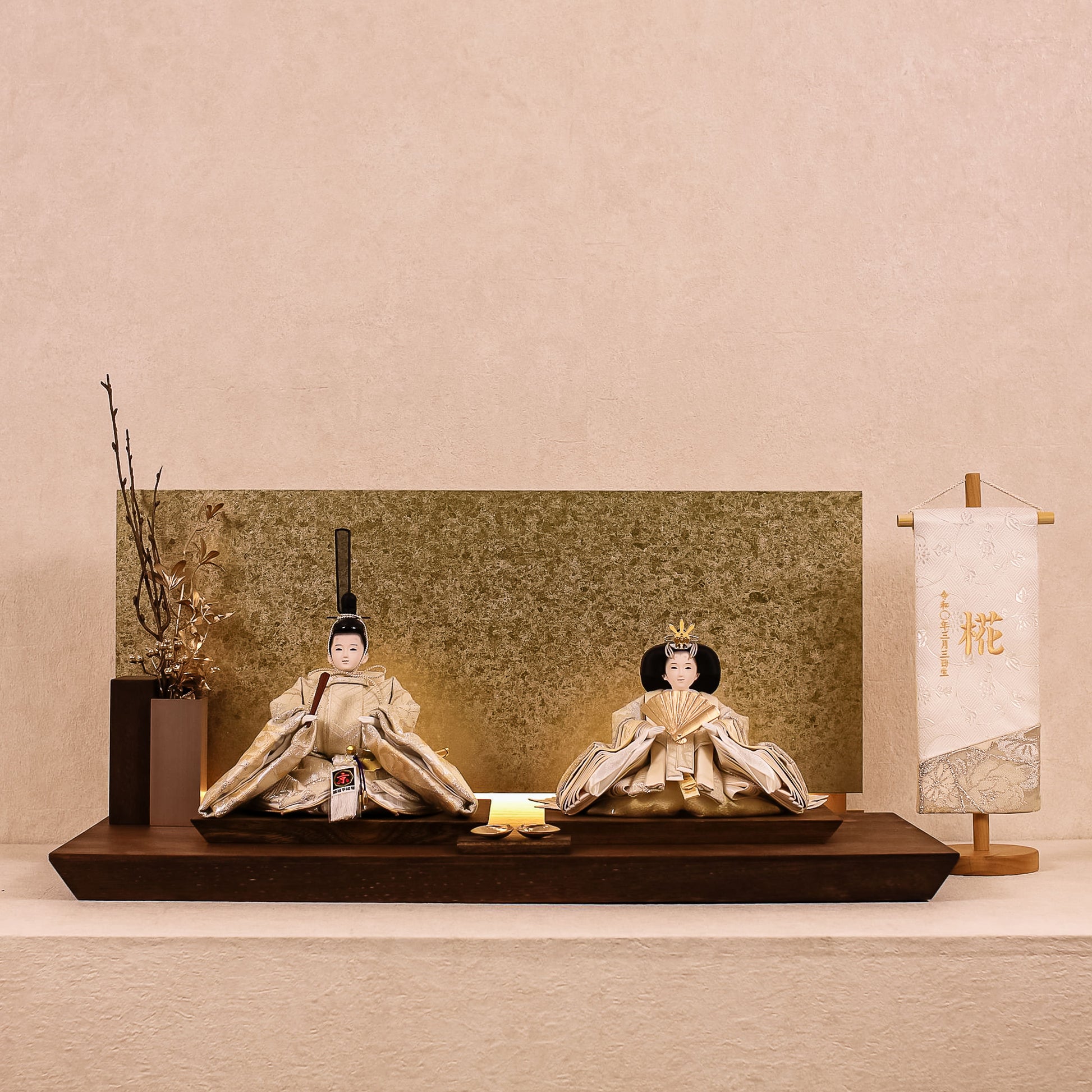 箔押しのお屏風は光を受けて輝き、お雛様の姿をそっと映し出します。