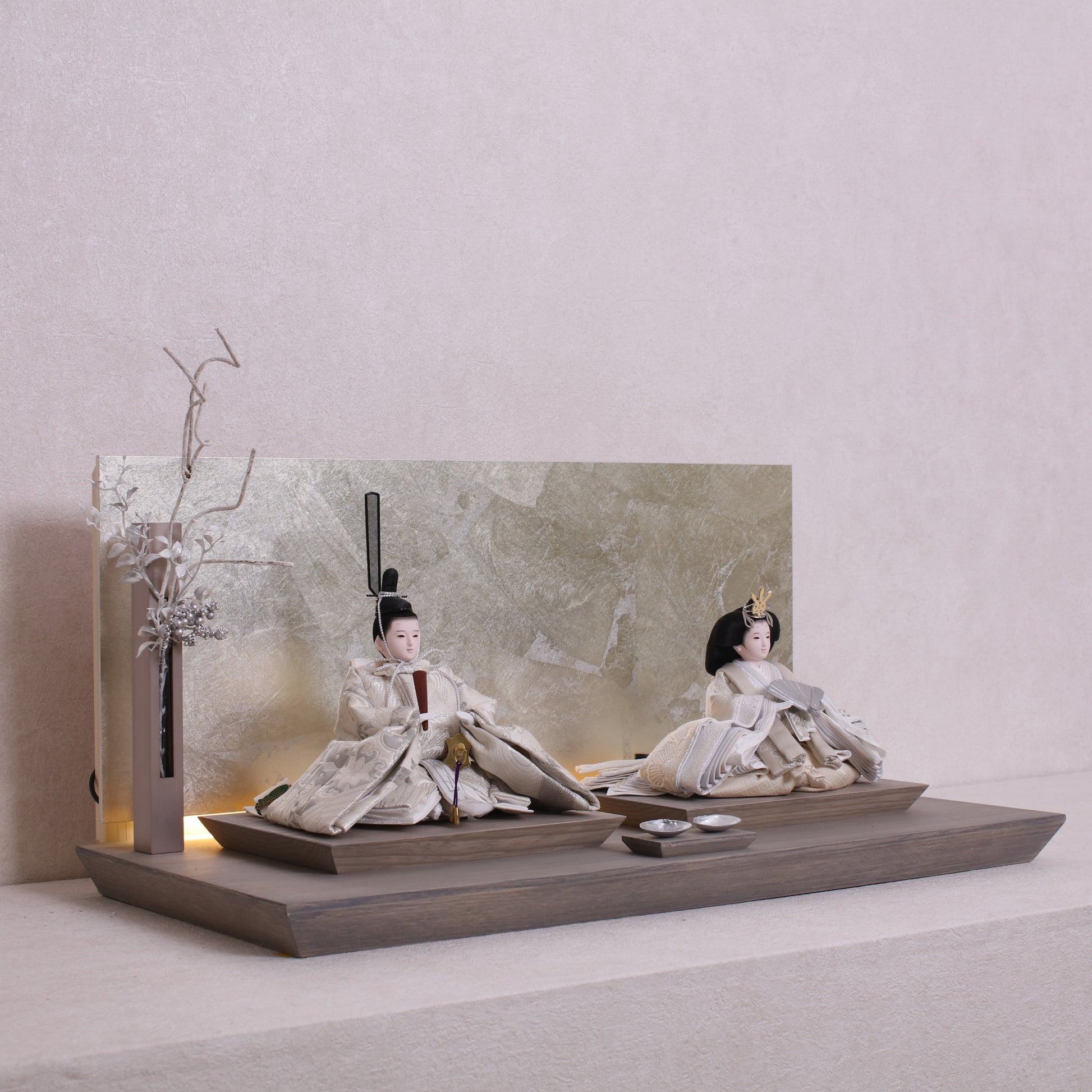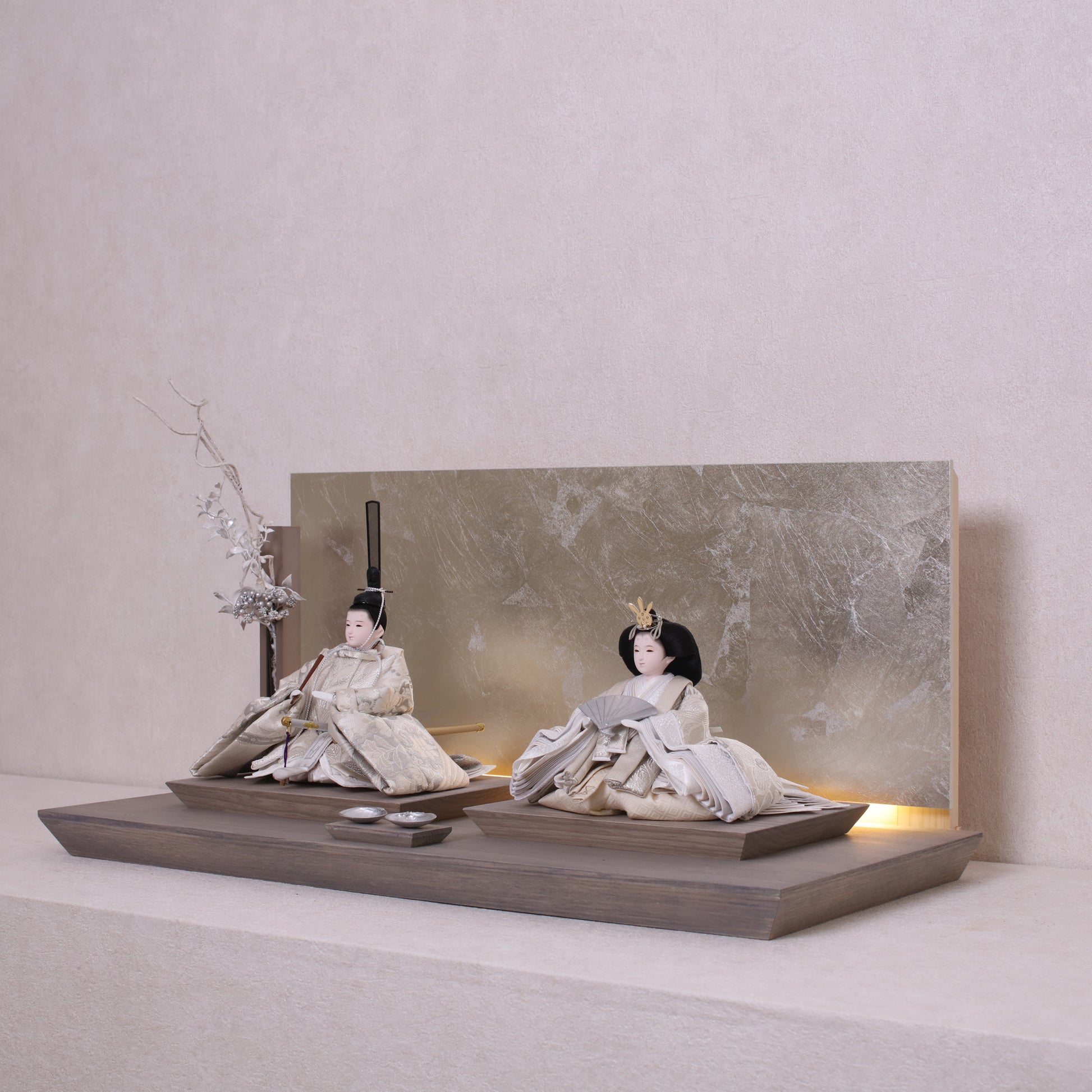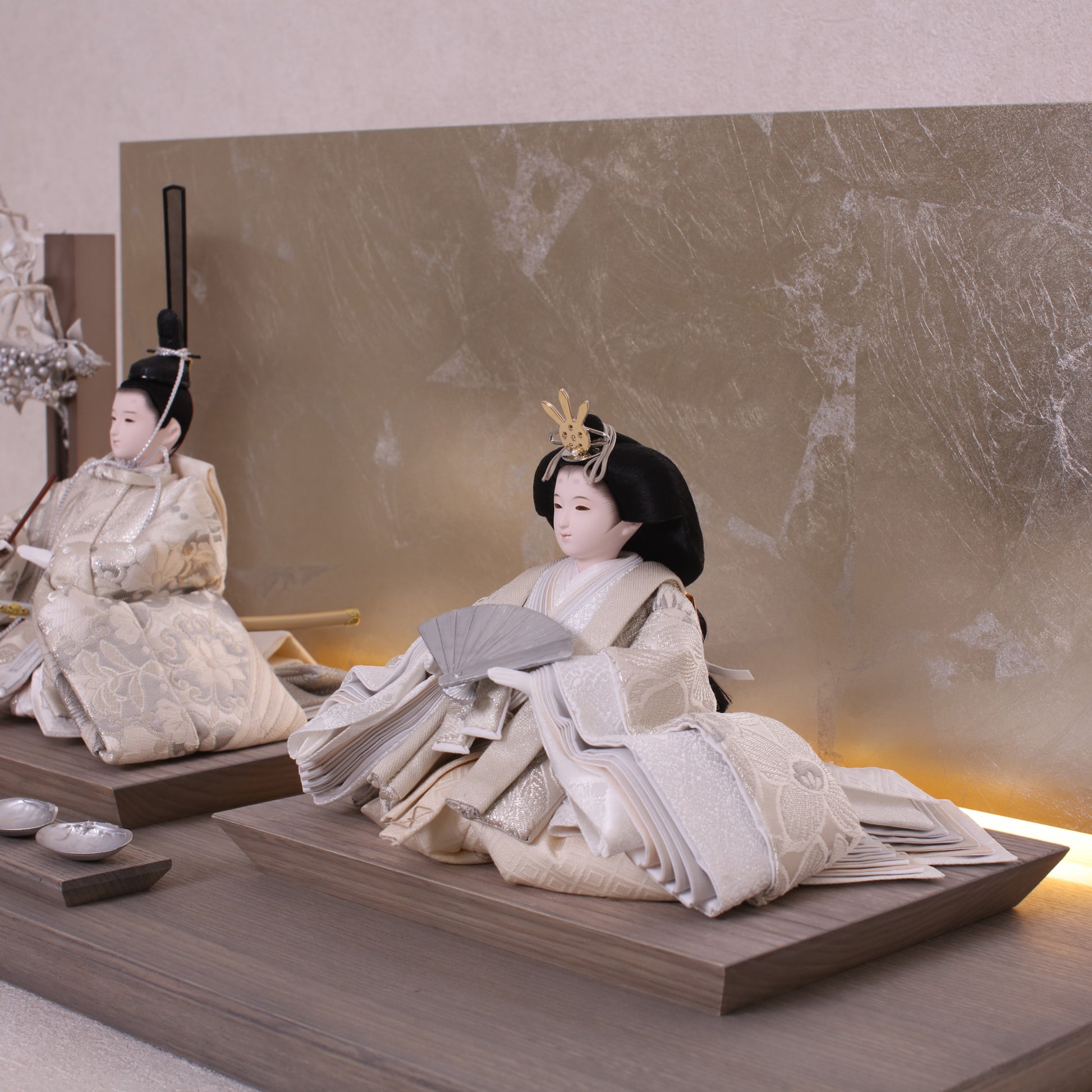 お屏風の下からは柔らかなライトがともり、実物と映る姿が重なって飾り全体がいっそう華やかで、美しい世界が生まれます。