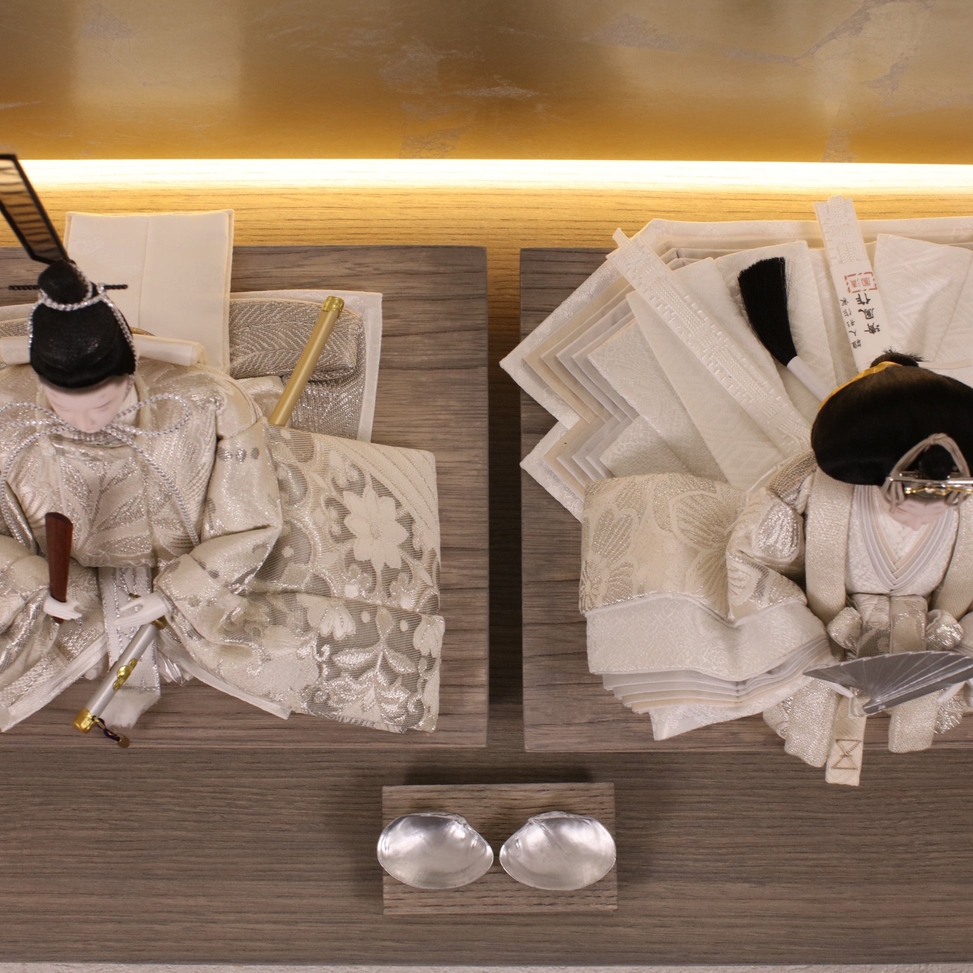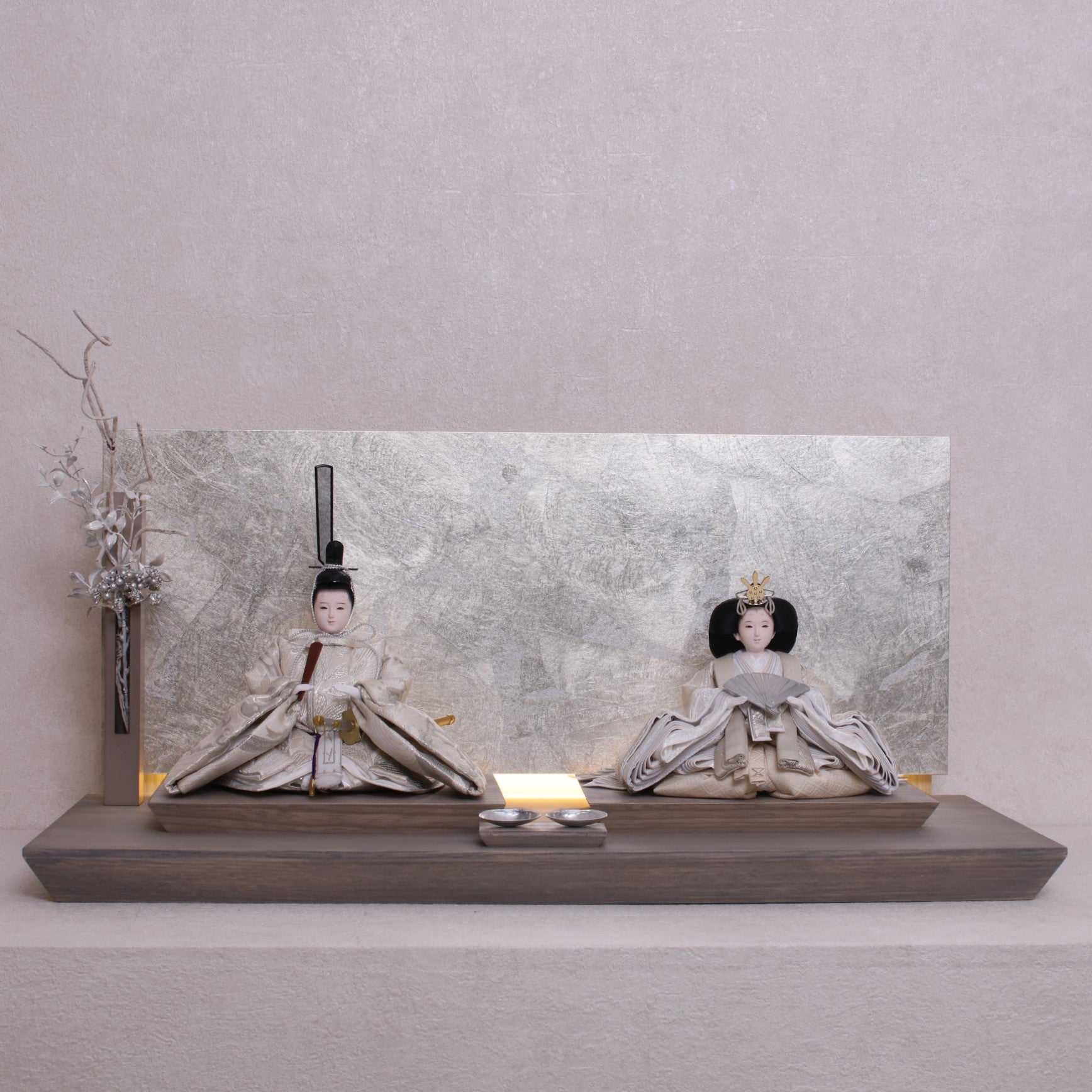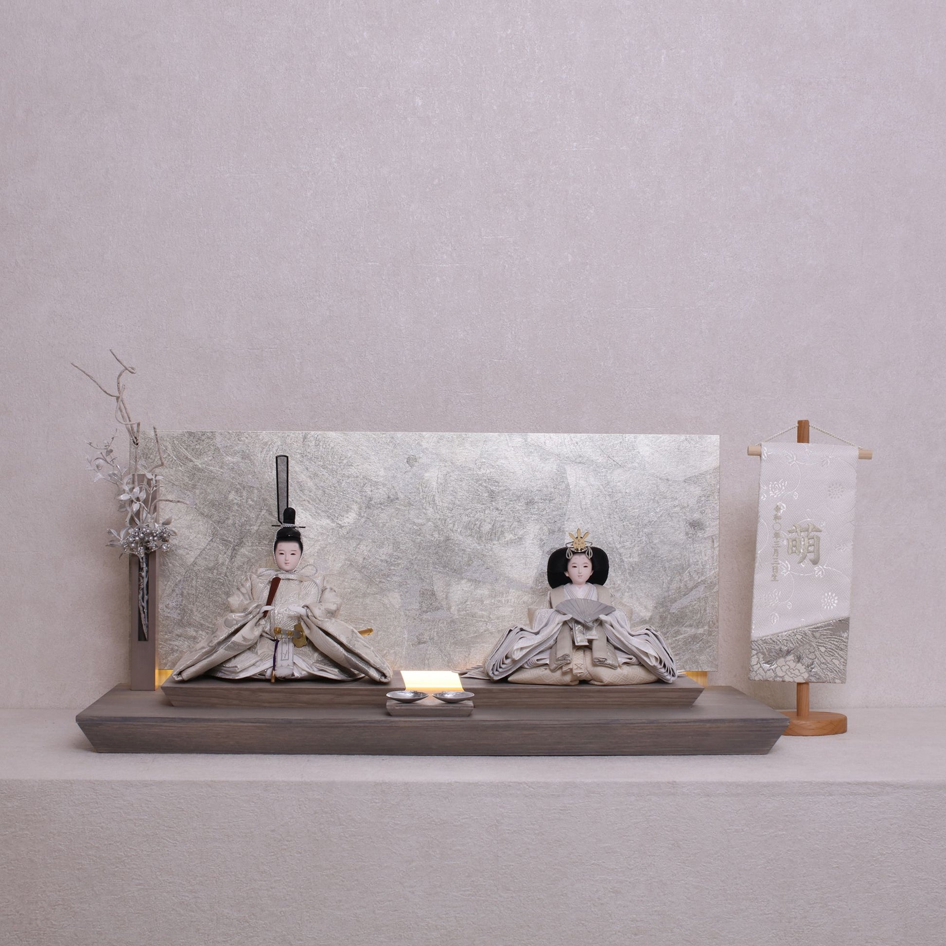 お屏風の下からは柔らかなライトがともり、実物と映る姿が重なって飾り全体がいっそう華やかで、美しい世界が生まれます。