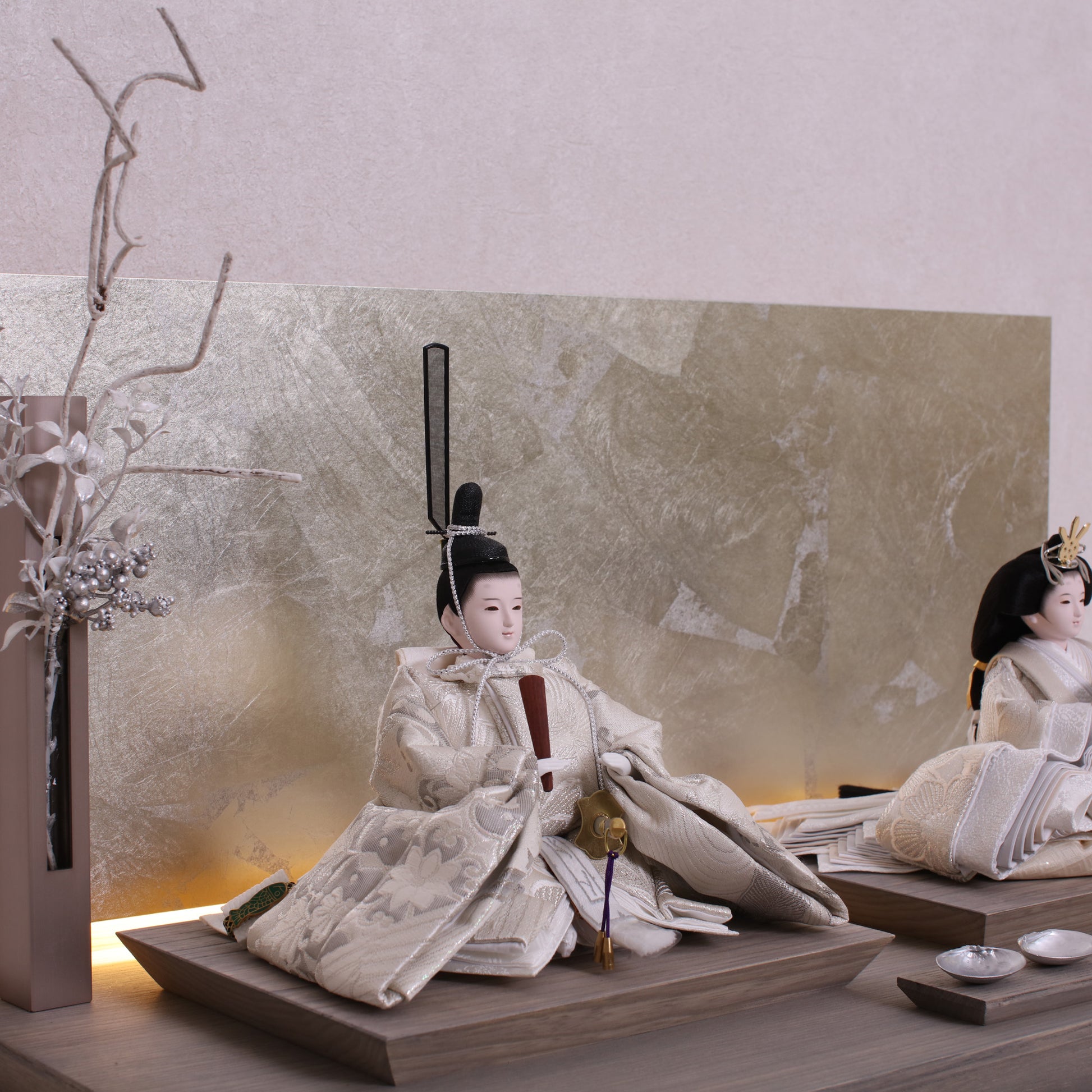 箔押しのお屏風は光を受けて輝き、お雛様の姿をそっと映し出します。