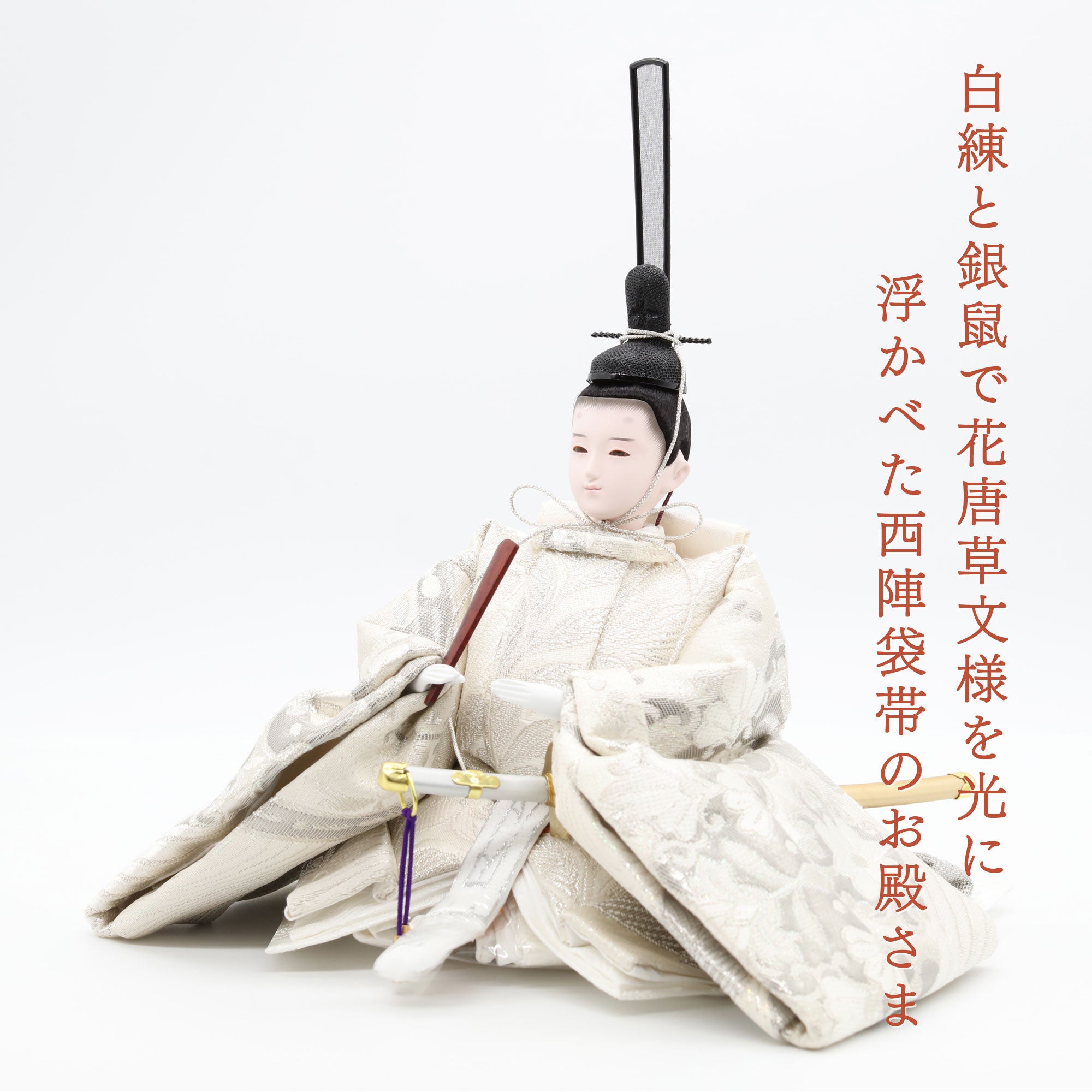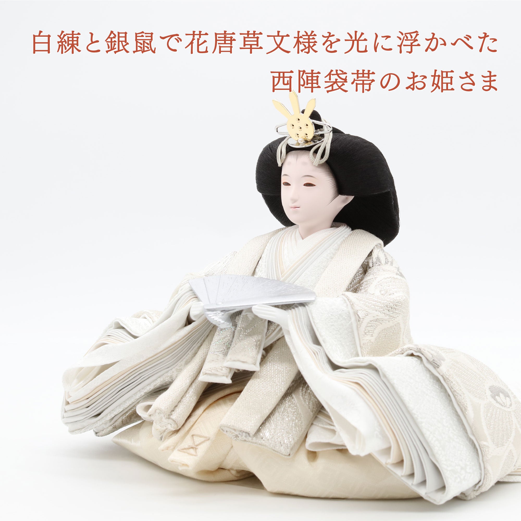 白練と銀鼠で花唐草文様を光に浮かべた西陣袋帯のお姫さま