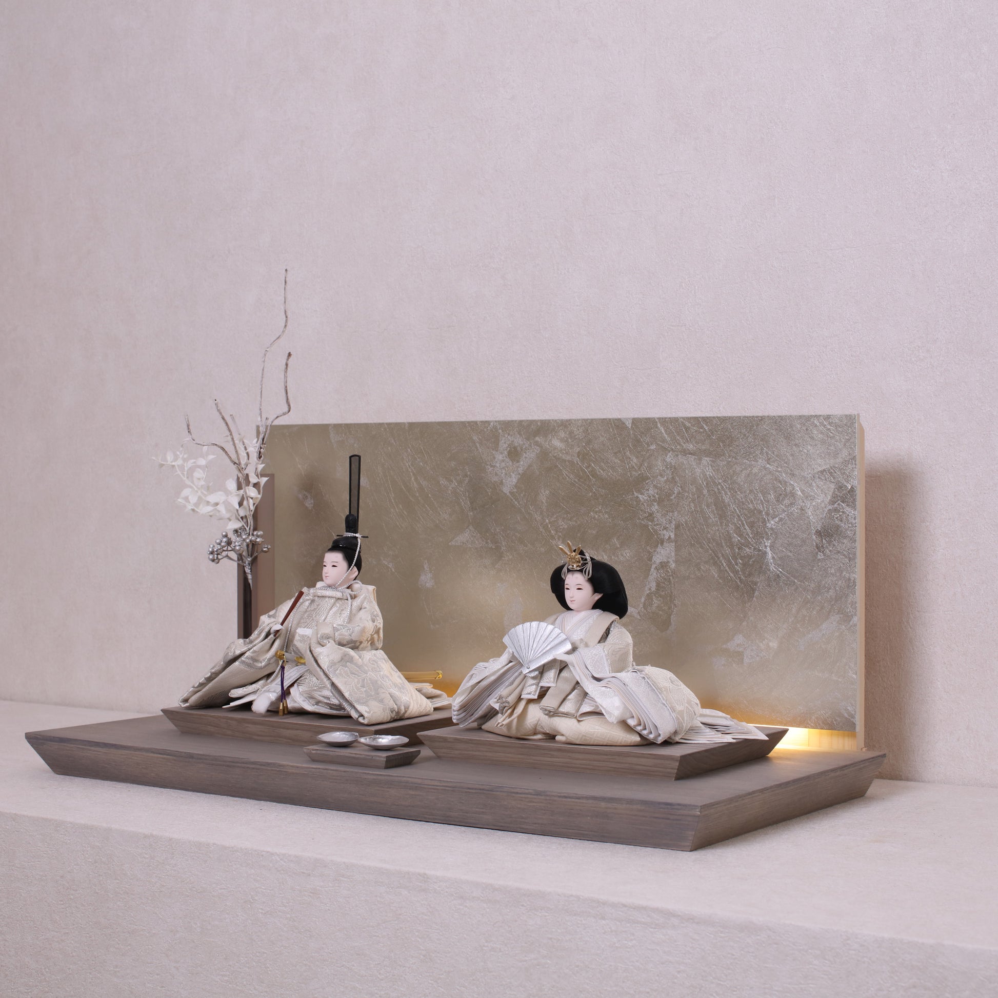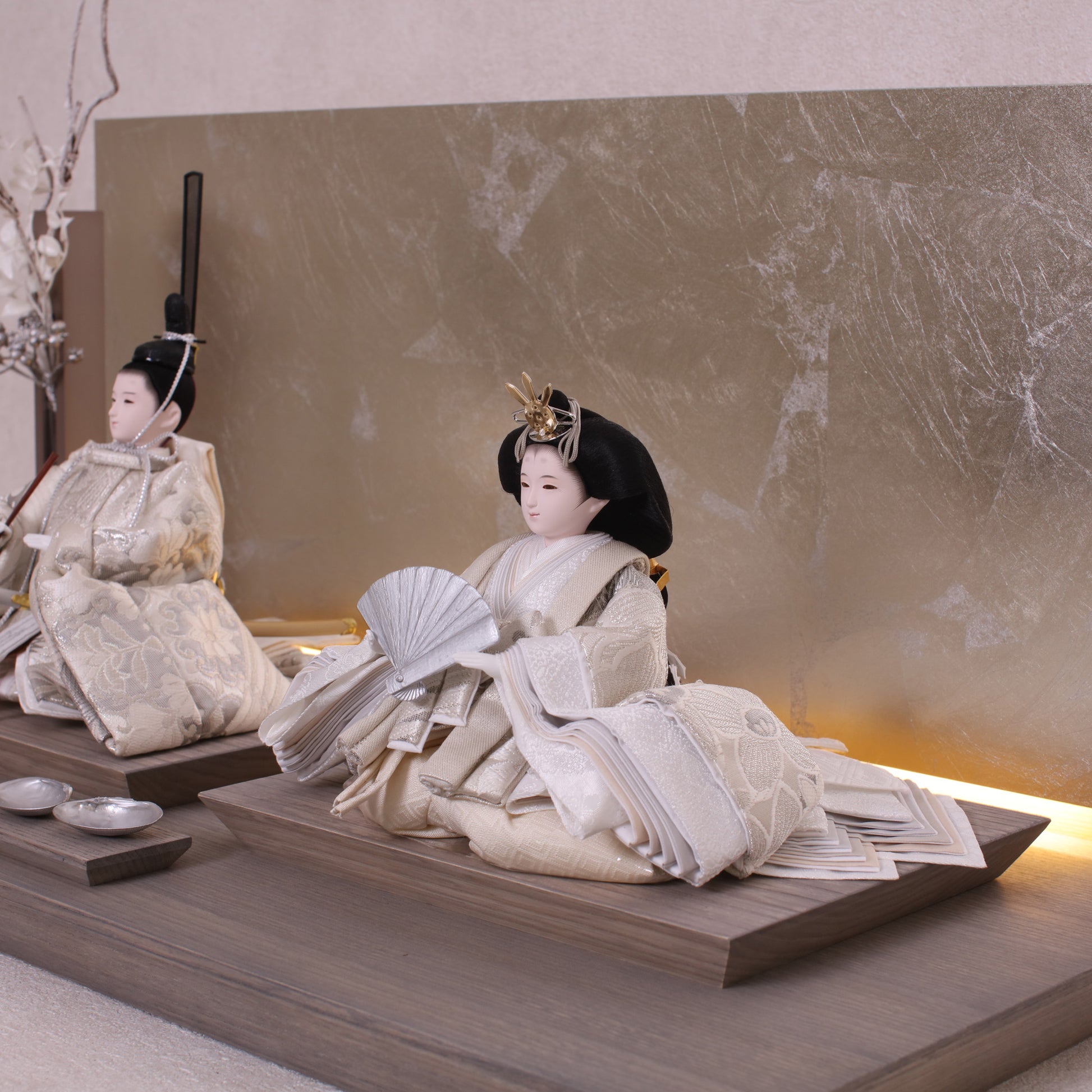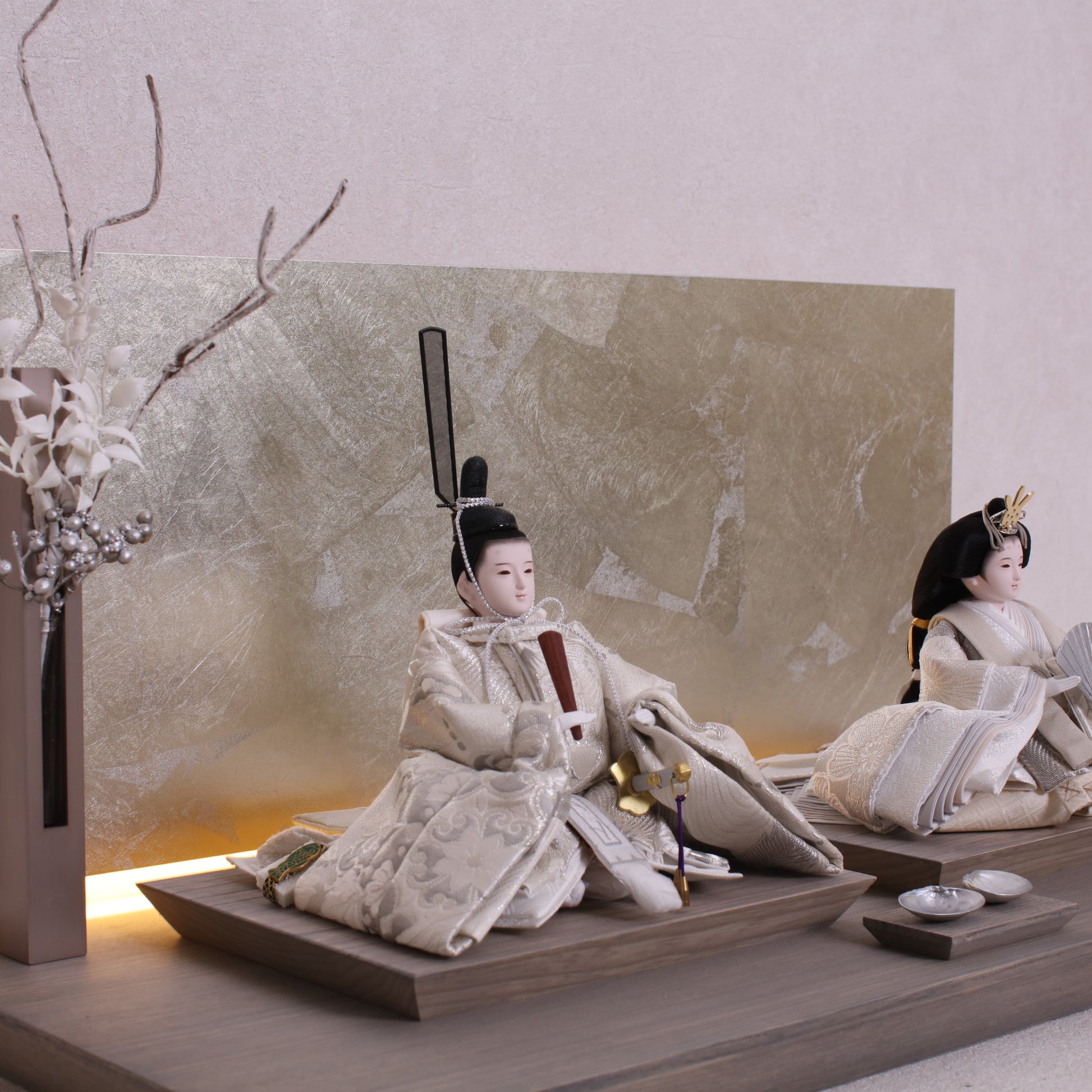 箔押しのお屏風は光を受けて輝き、お雛様の姿をそっと映し出します。