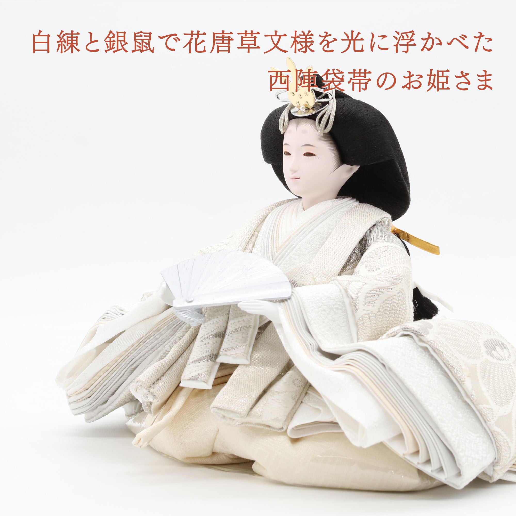白練と銀鼠で花唐草文様を光に浮かべた西陣袋帯のお姫さま
