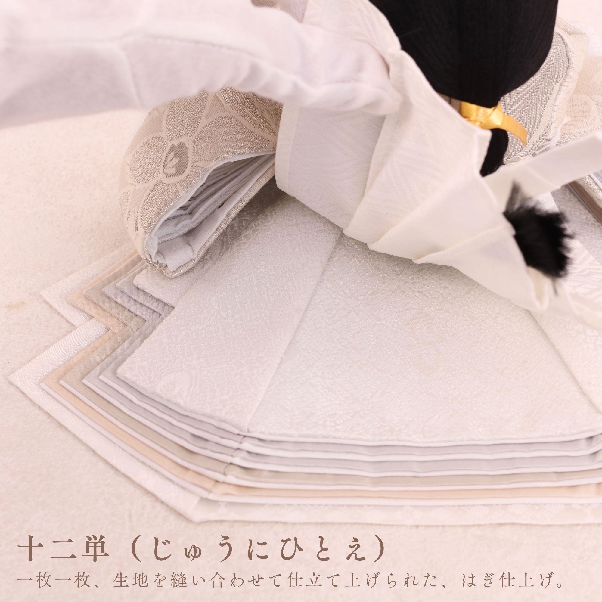 白練と銀鼠の花唐草文様を光で浮かび上がらせた西陣袋帯の殿。金銀糸の繊細な輝きが、赤ちゃんの健やかな成長と家庭の繁栄を象徴しています。