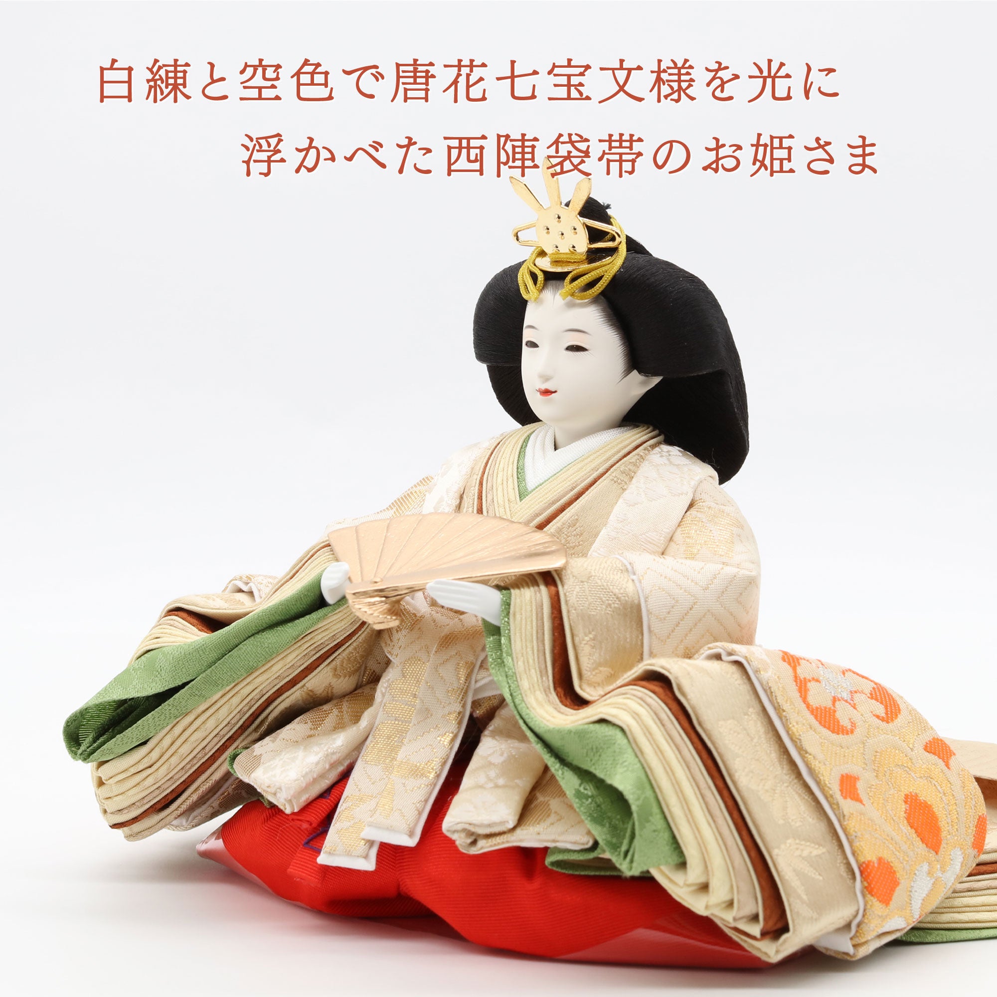 白練と空色で唐花七宝文様を光に浮かべた西陣袋帯のお姫さま