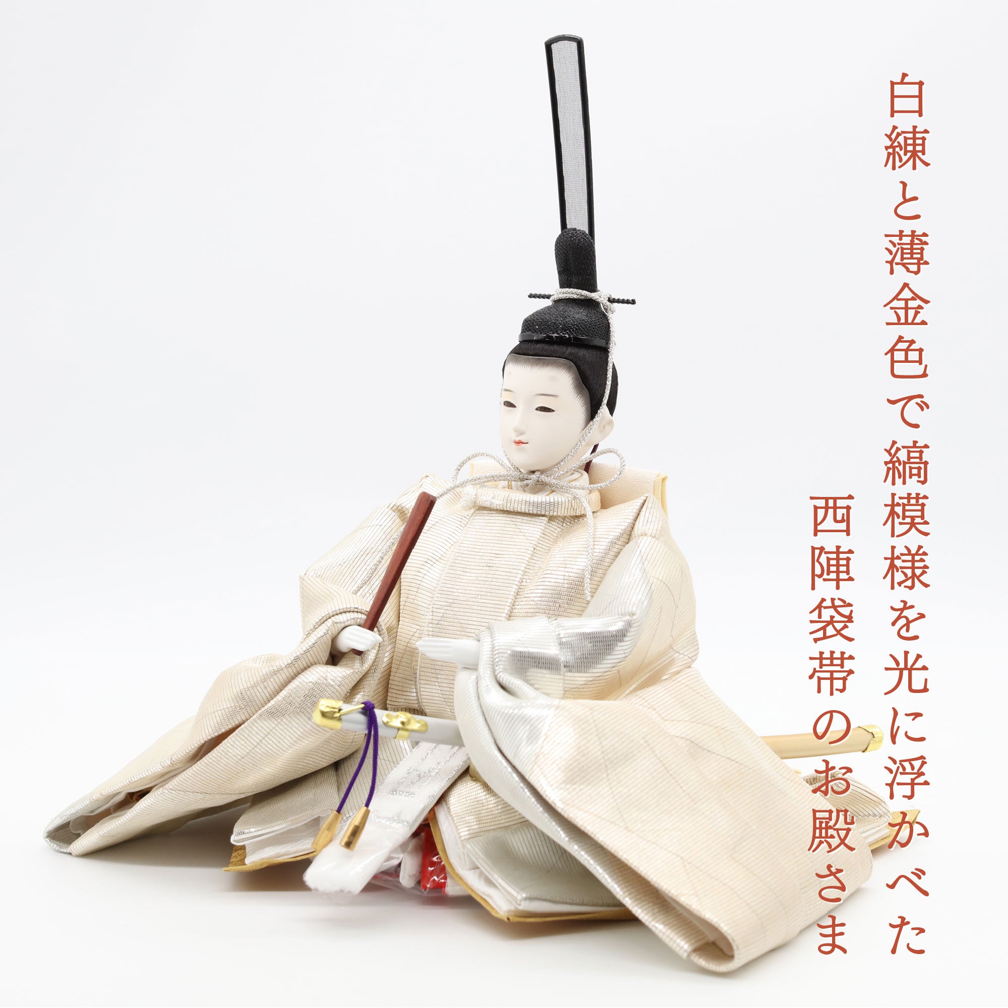 白練と薄金色の縞模様を施した西陣袋帯の殿。落ち着いた色合いの中で立体的に見える文様が、子どもの健康と末永い繁栄を象徴しています。