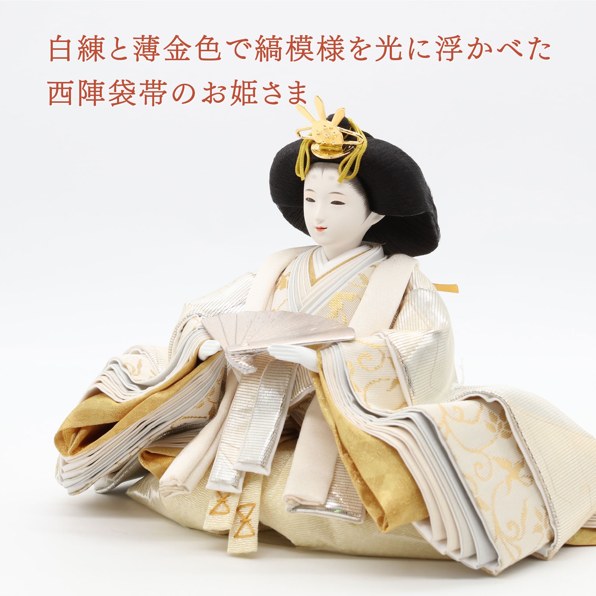 白練と薄金色で縞模様を光に浮かべた西陣袋帯のお姫さま