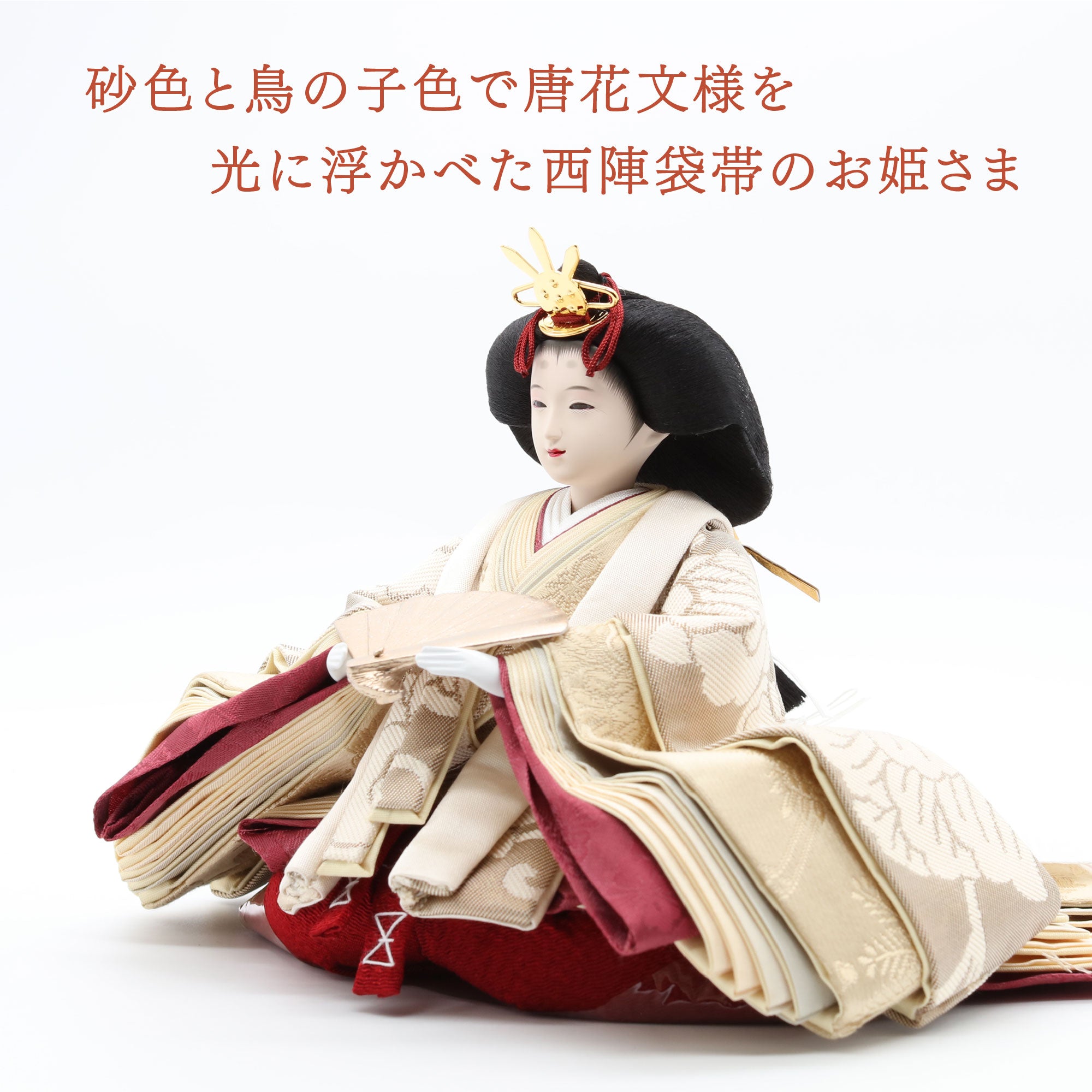砂色と鳥の子色で唐花文様を光に浮かべた西陣袋帯のお姫さま。家族と共に健やかに日々を過ごせるよう願いが込められています。