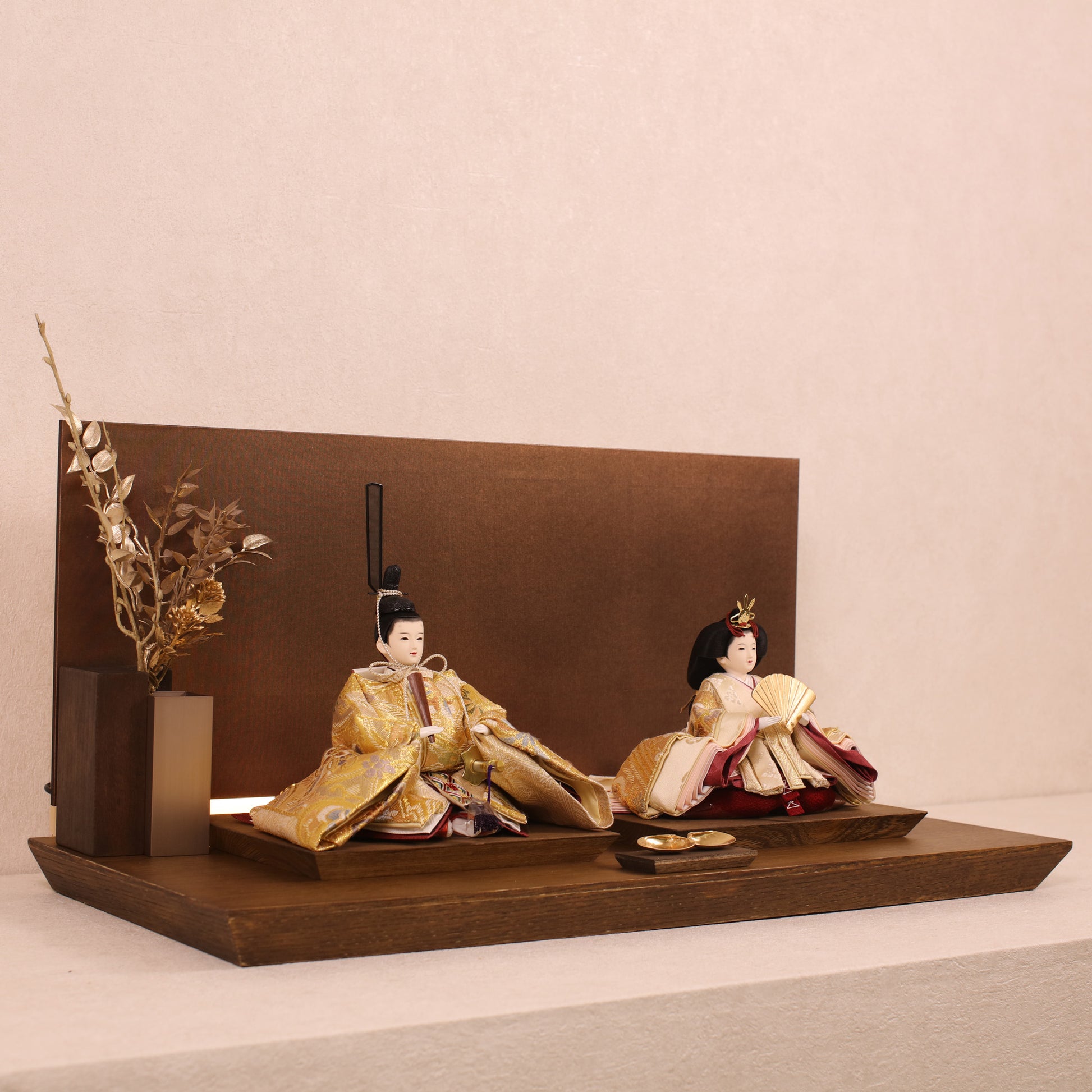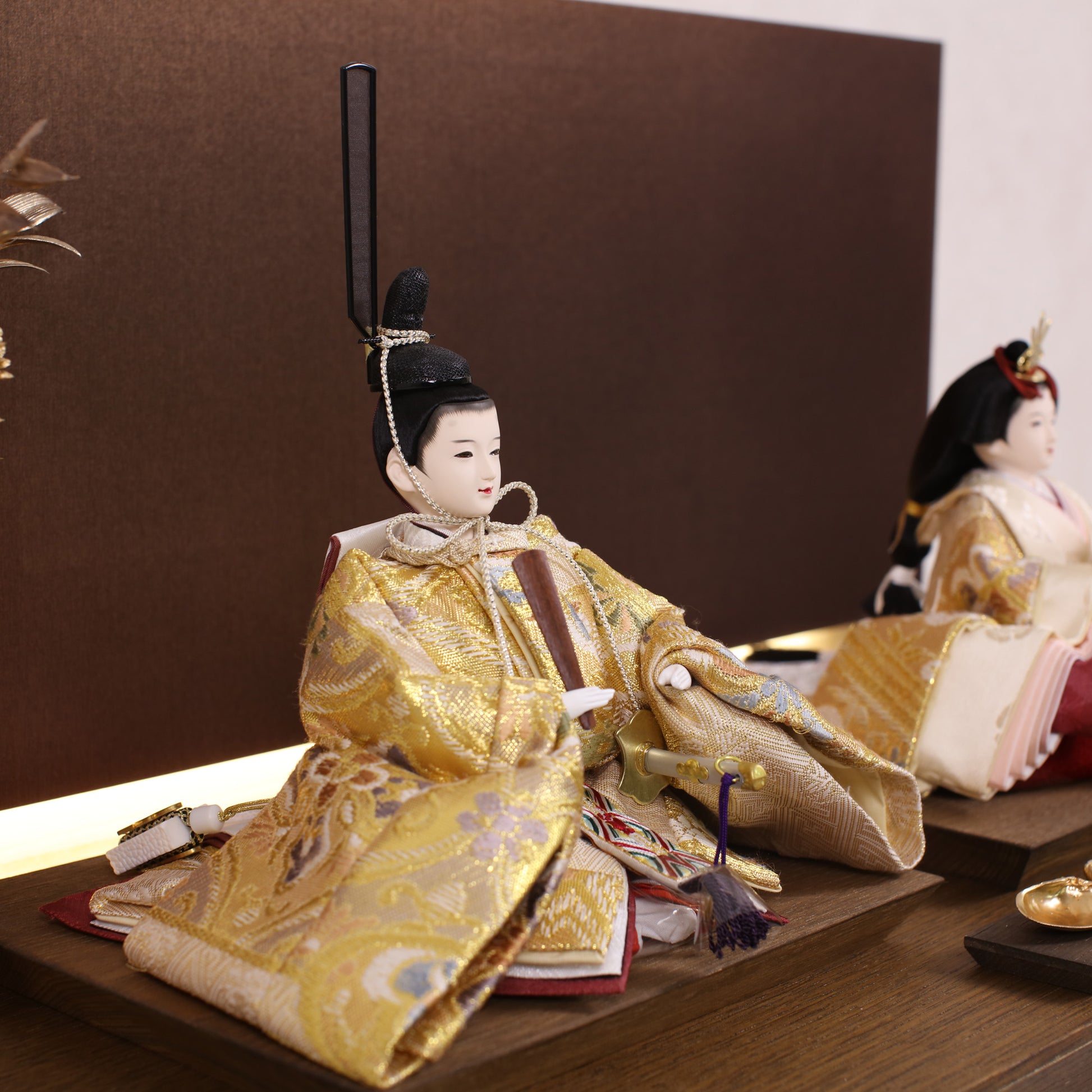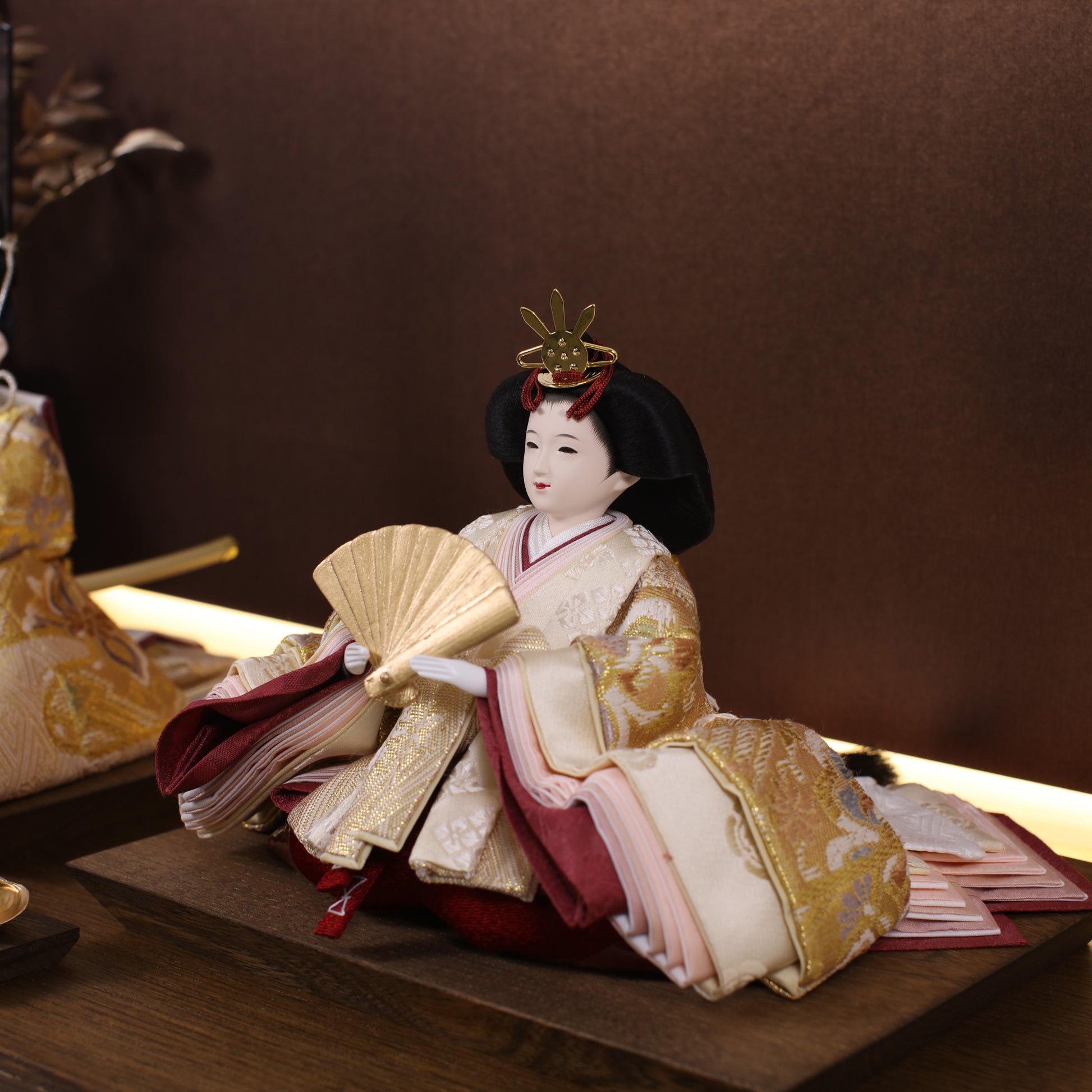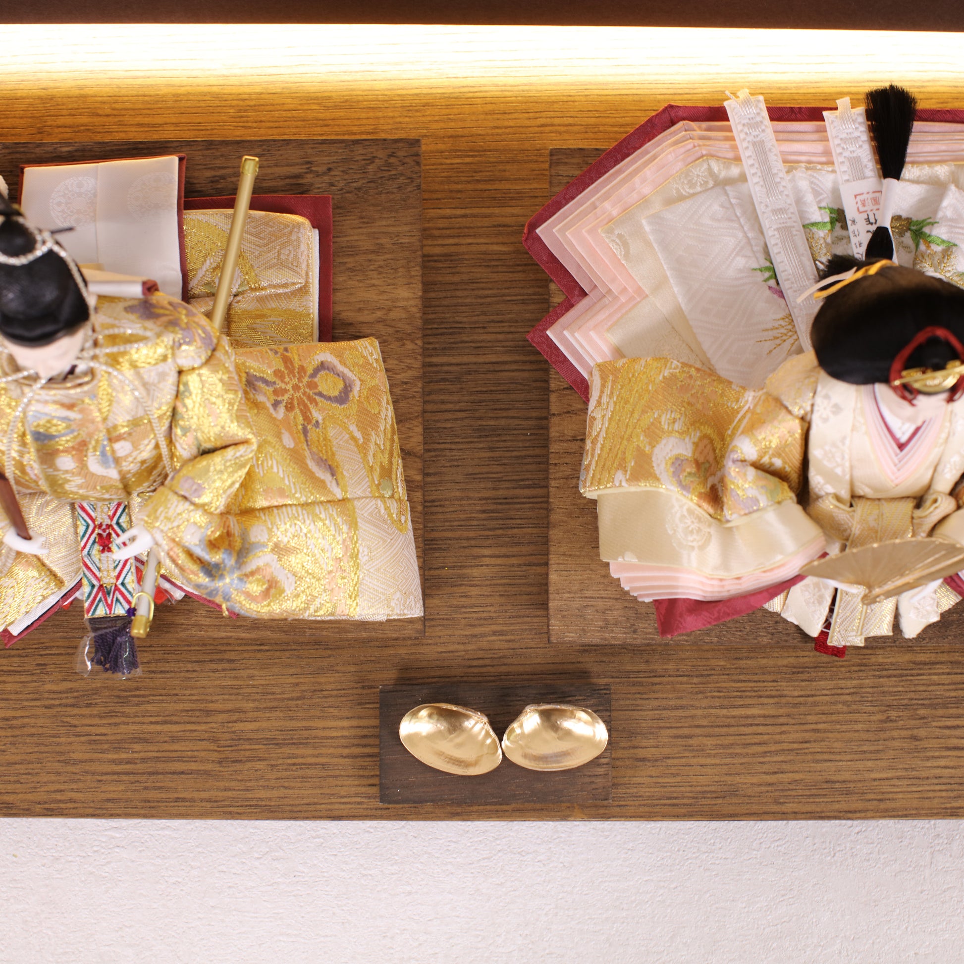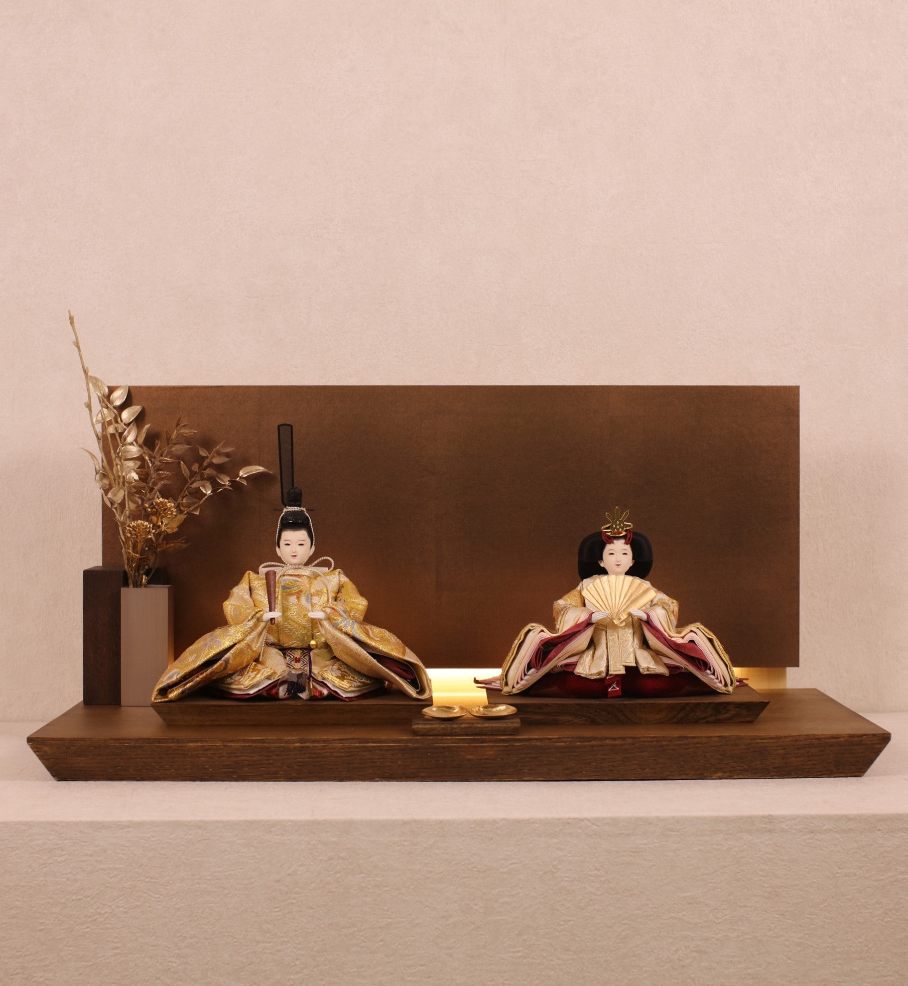 箔押しのお屏風は光を受けて輝き、お雛様の姿をそっと映し出します。