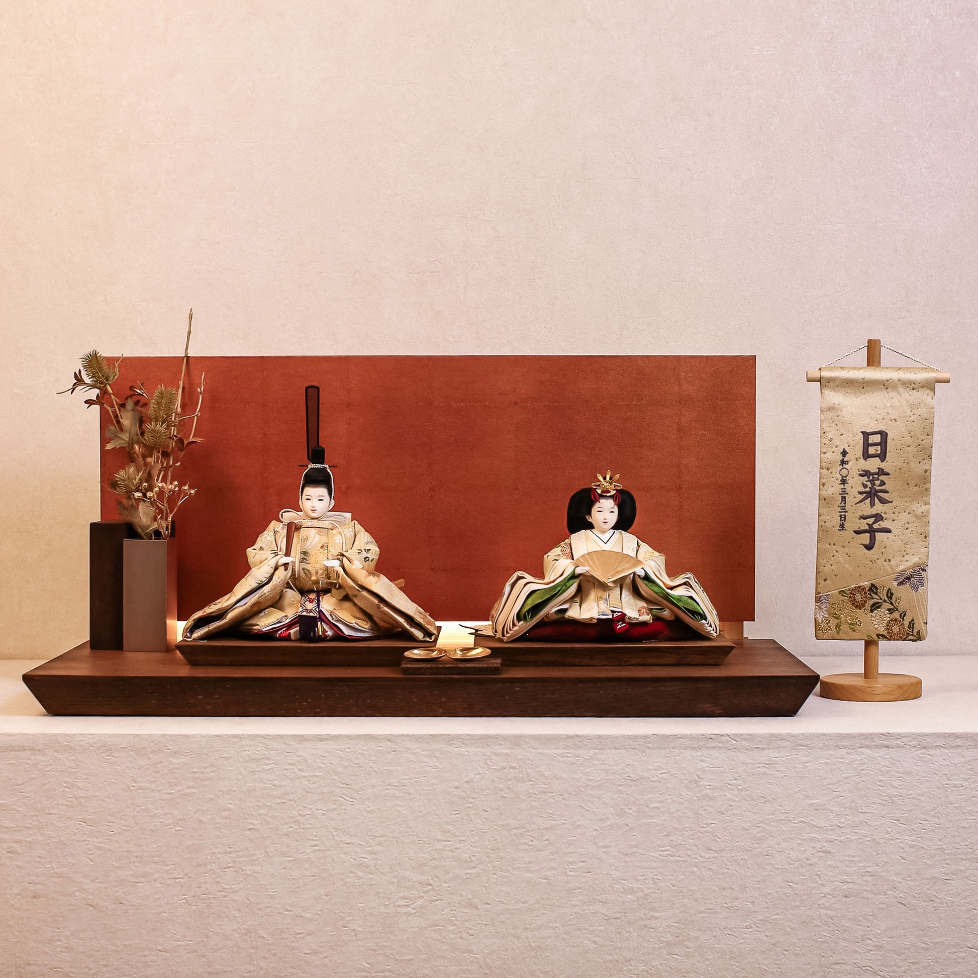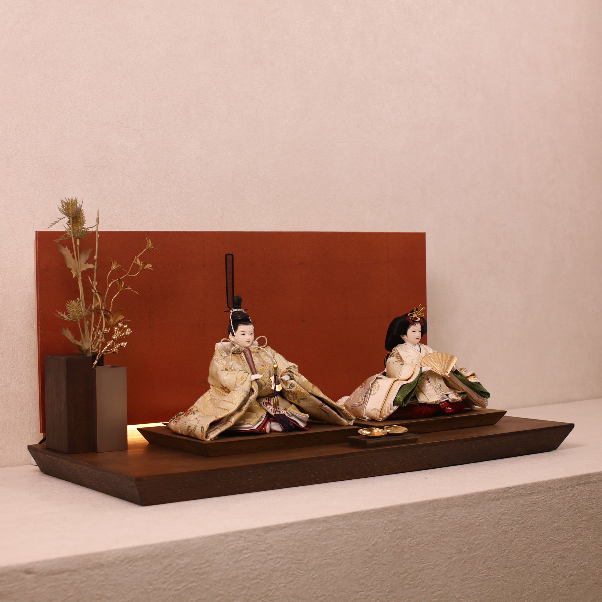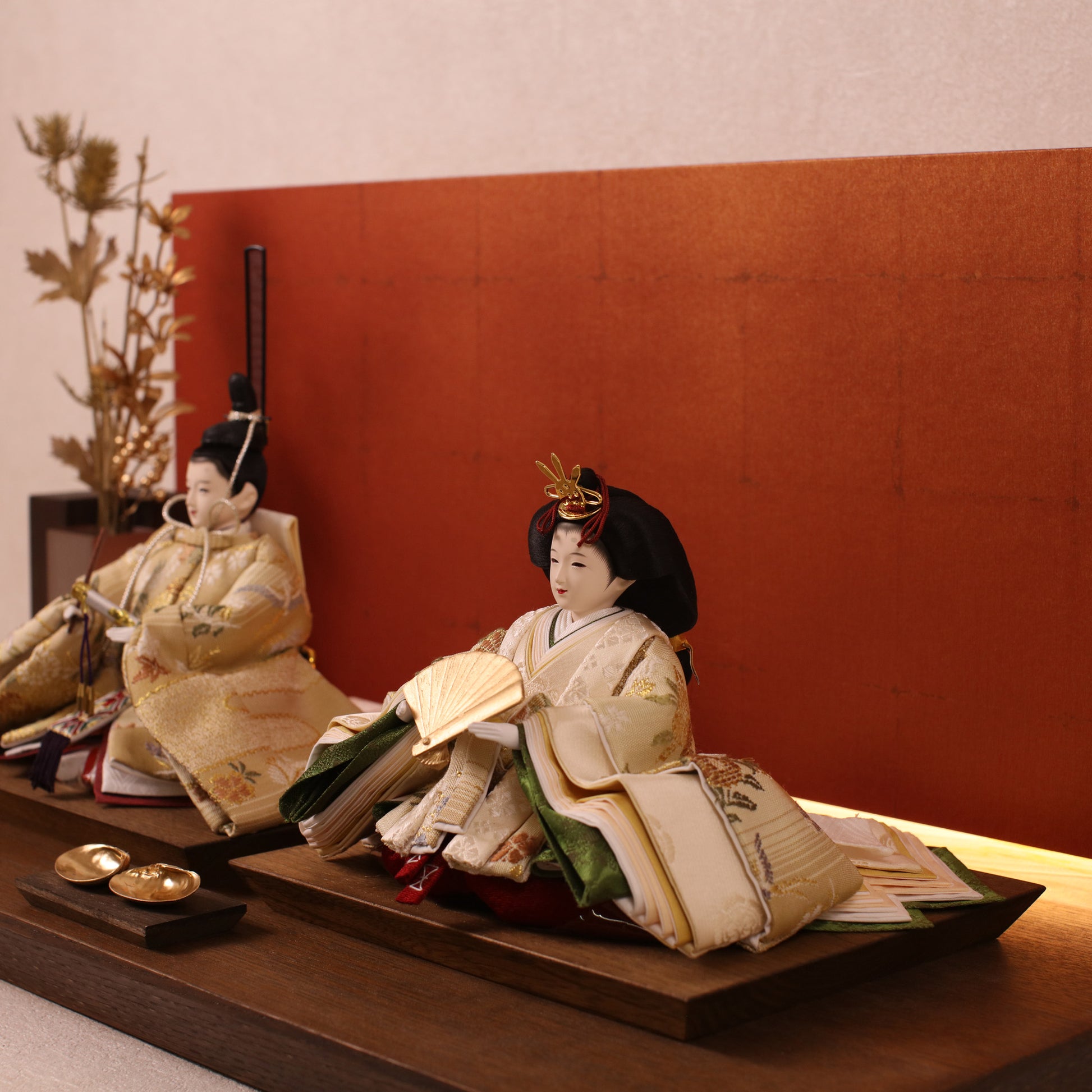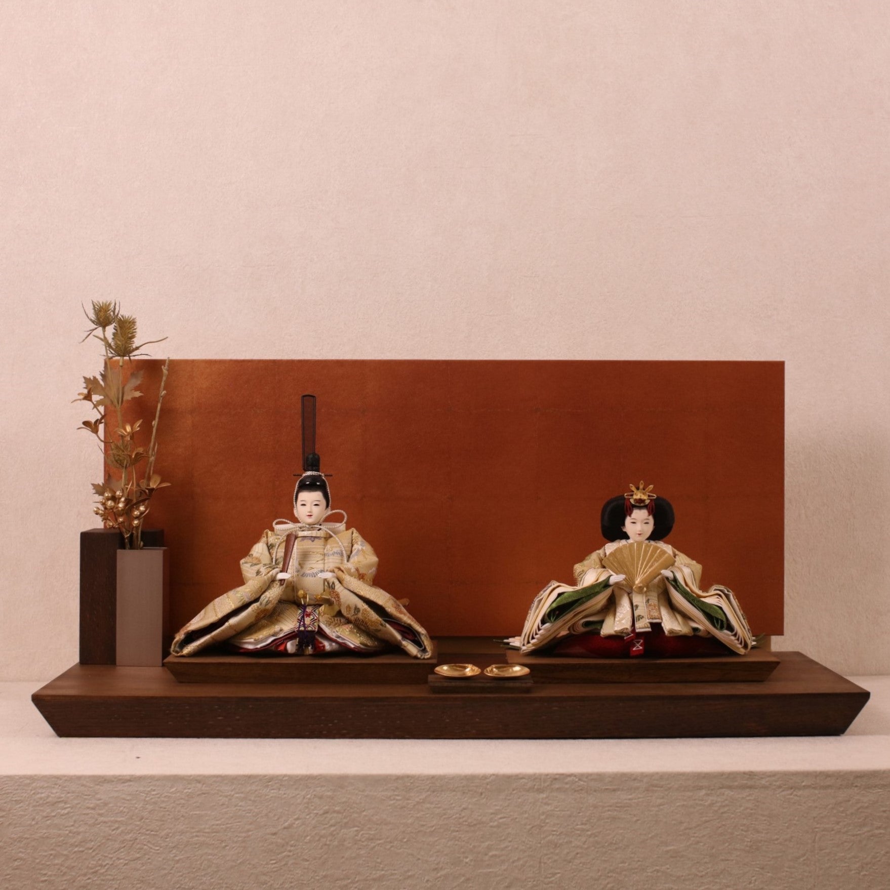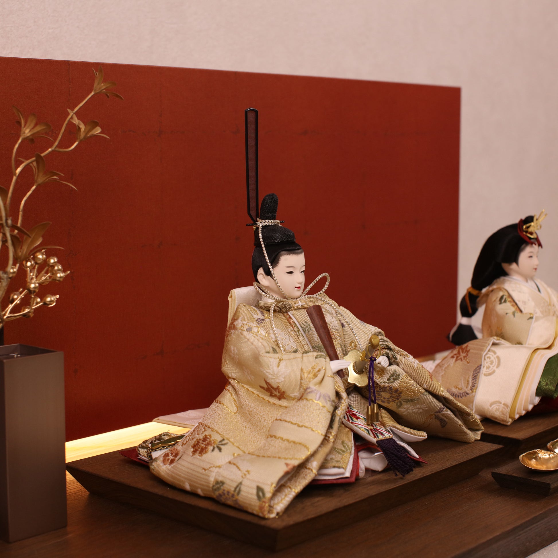 箔押しのお屏風は光を受けて輝き、お雛様の姿をそっと映し出します。