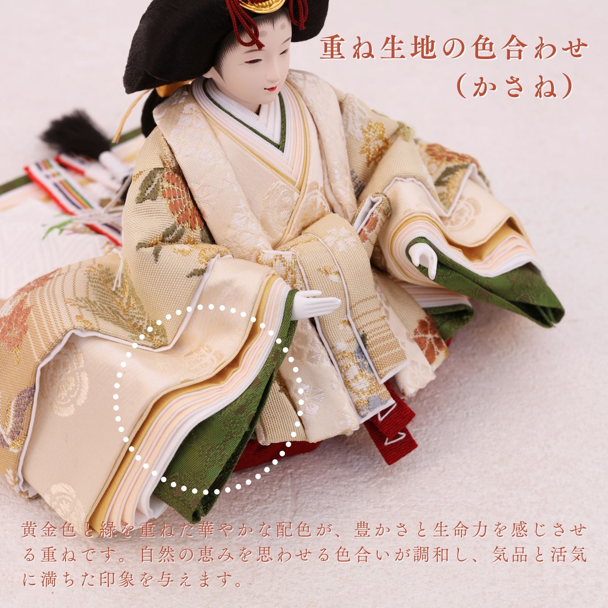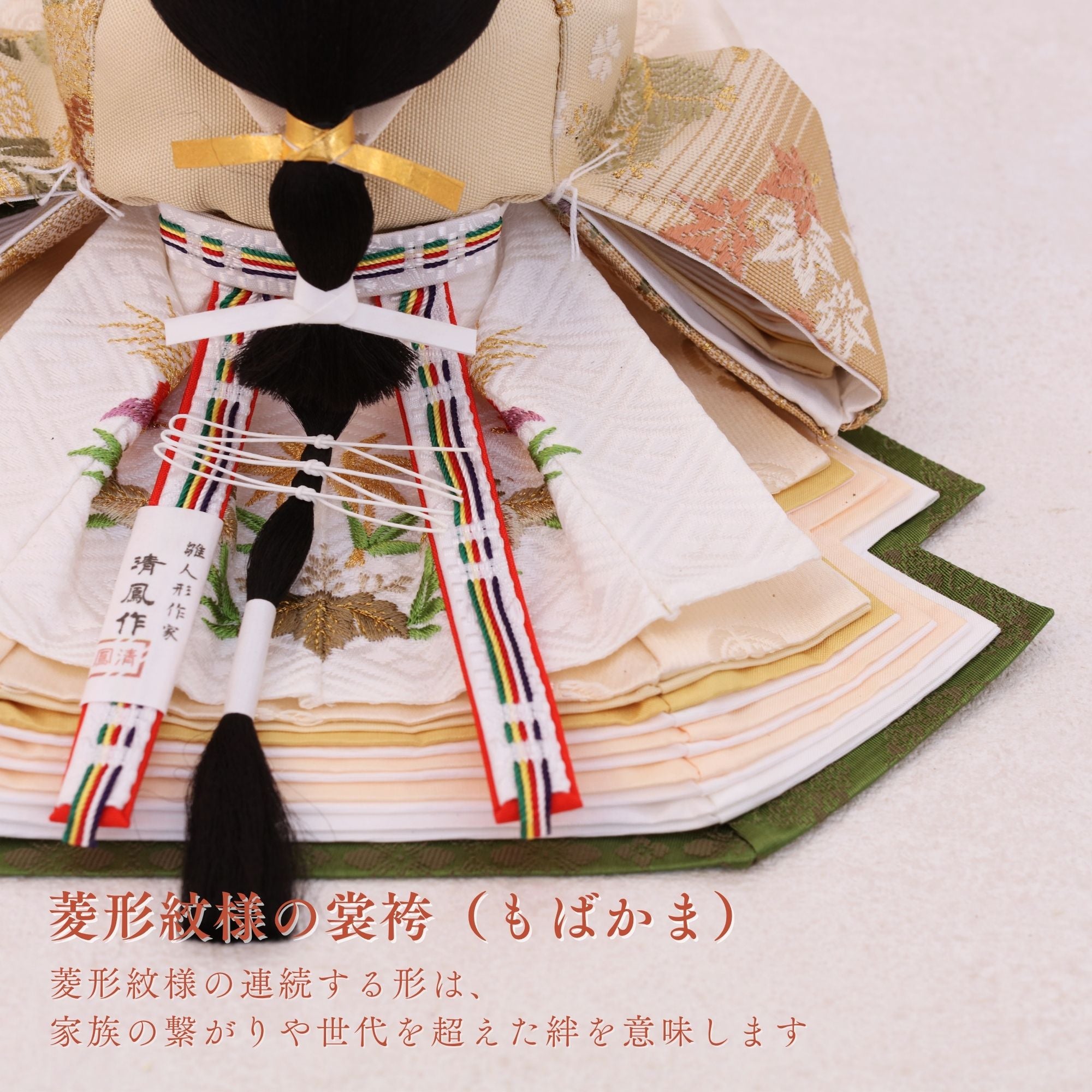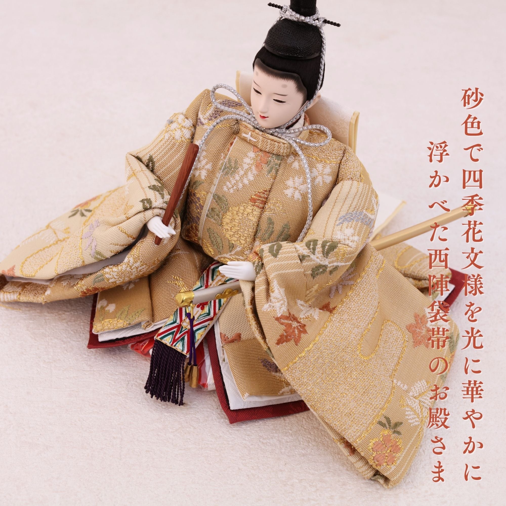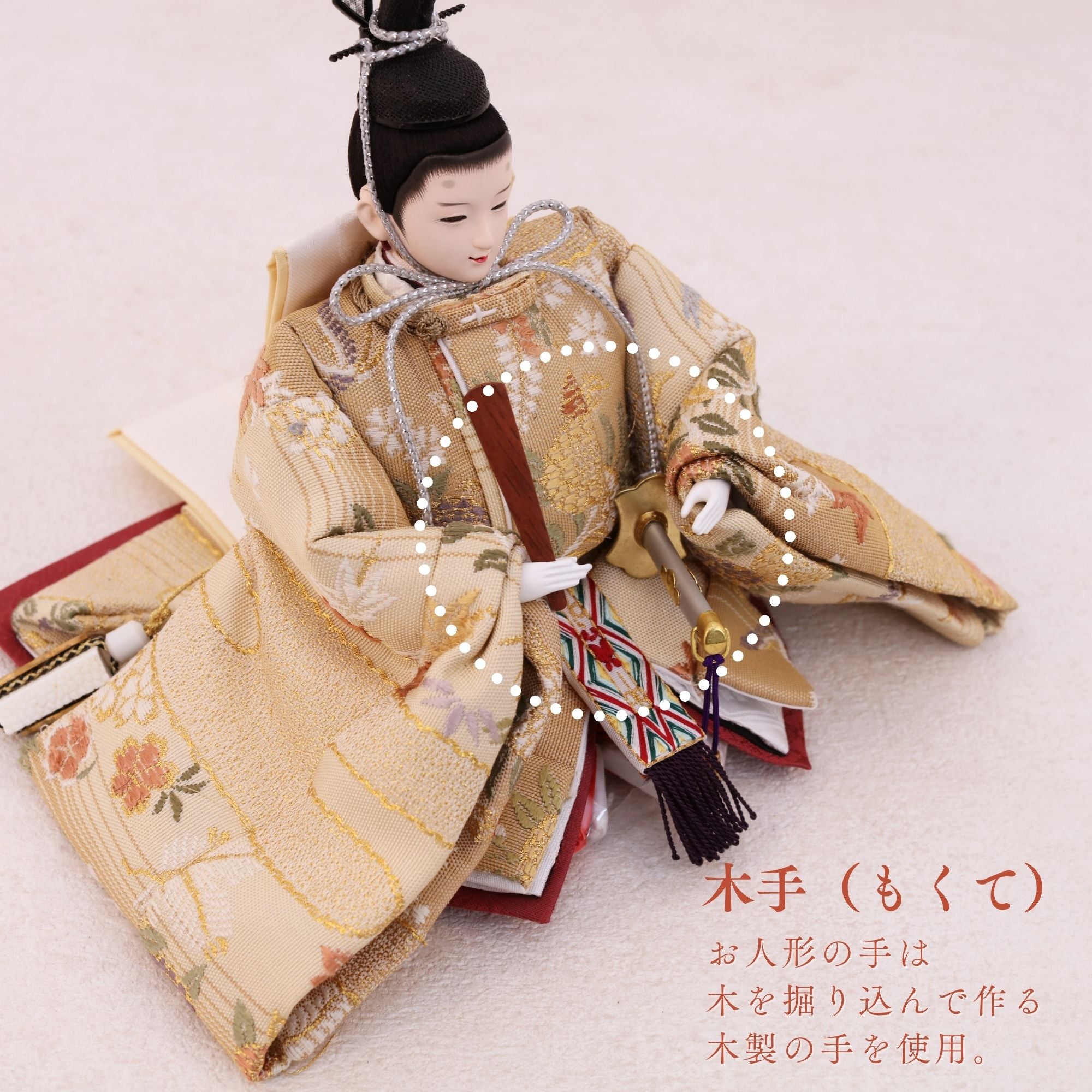 国産の分(せん)は、美しい木目と温もりある質感が魅力の天然木です。耐久性に優れ、経年とともに味わいを醸し出します。台座や屏風などに使用することで、自然素材ならではの落ち着いた風合いと上質感を演出し、雛人形全体をより品格ある印象に仕上げます。