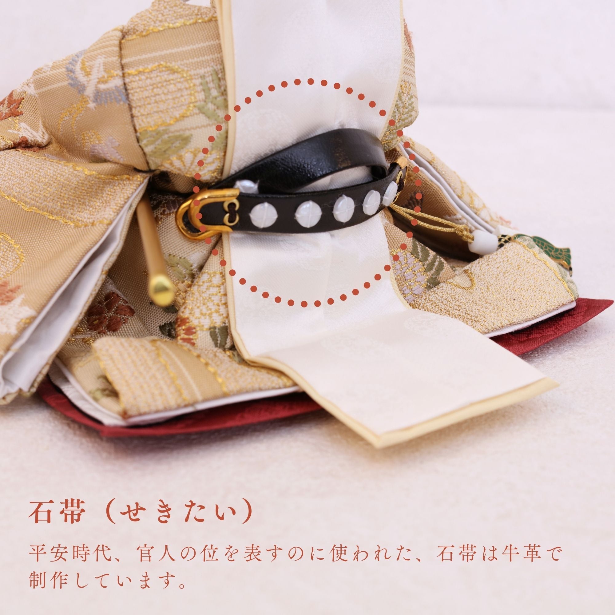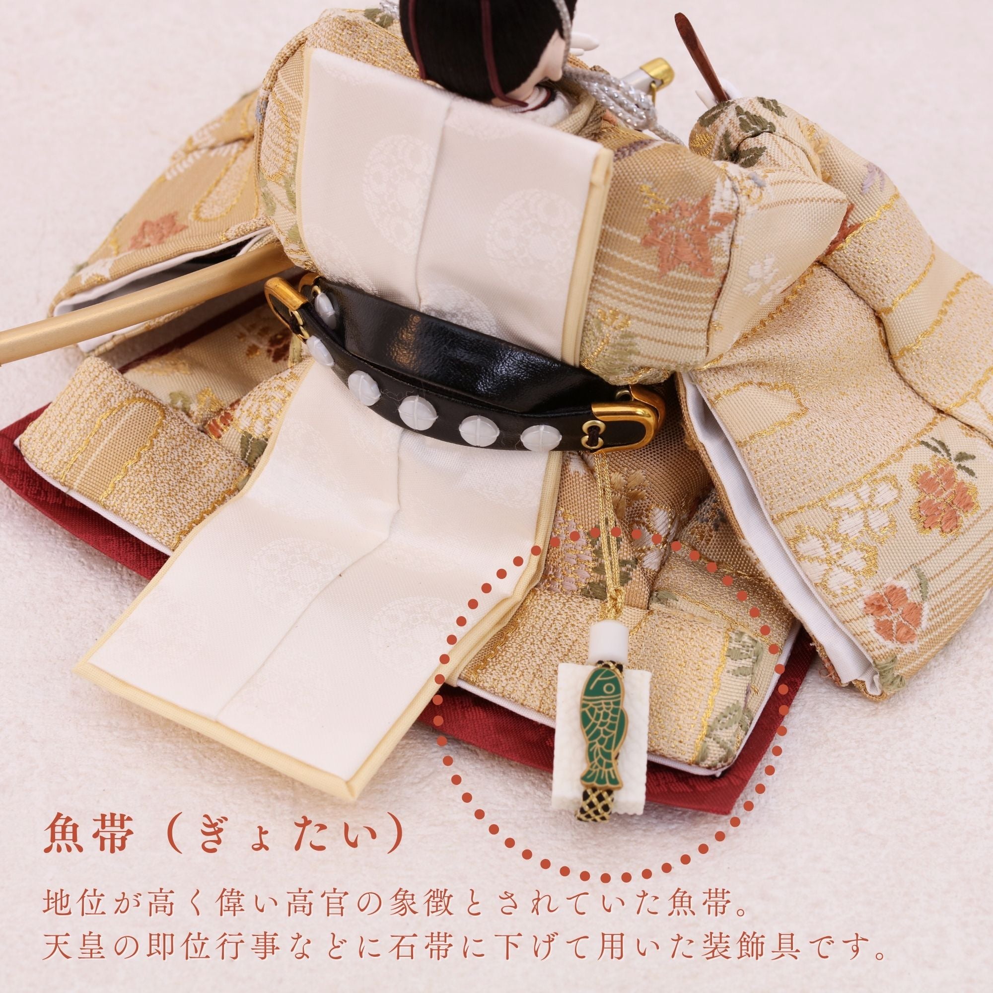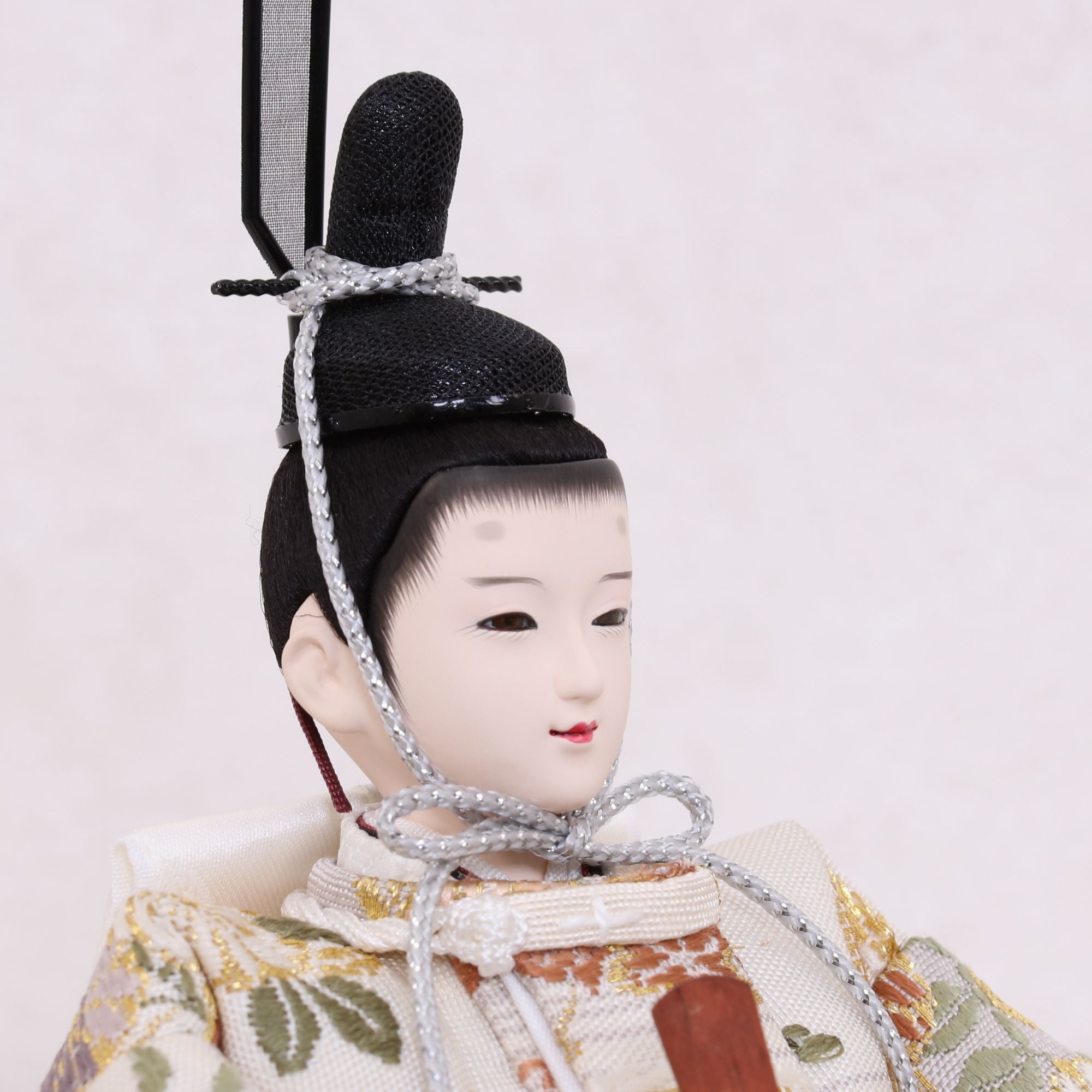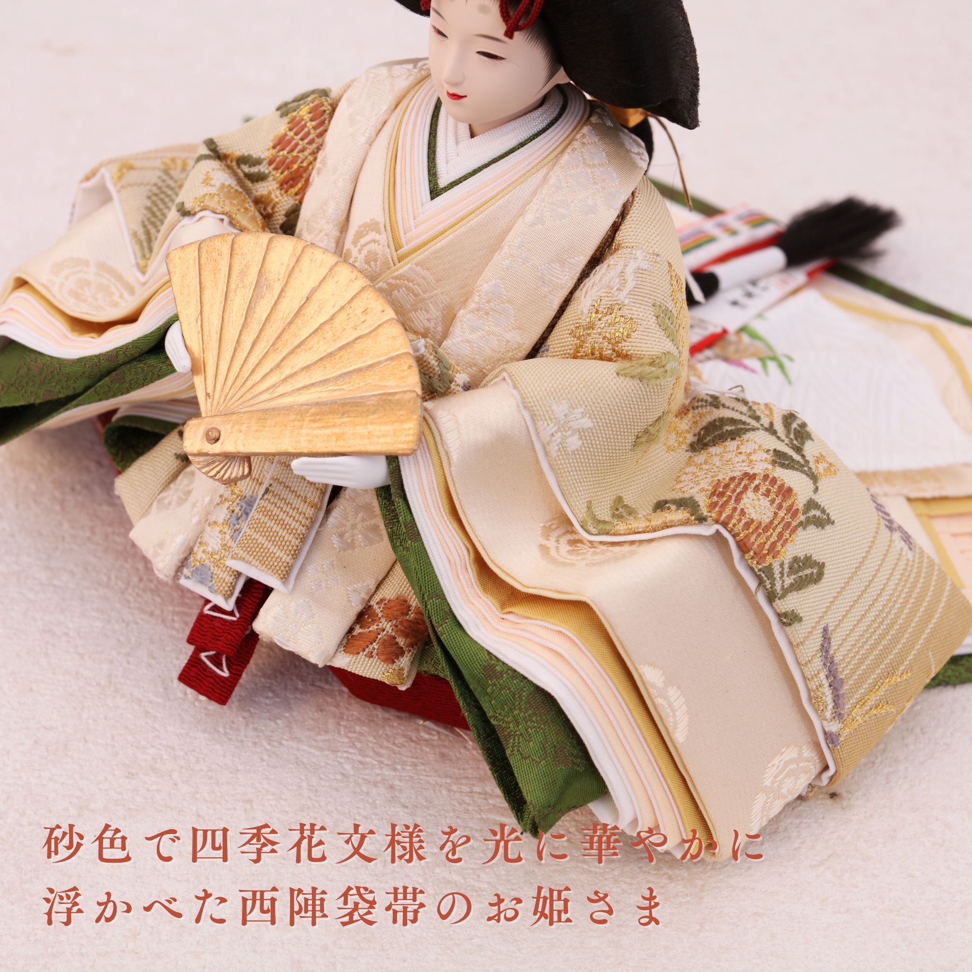国産の分(せん)は、美しい木目と温もりある質感が魅力の天然木です。耐久性に優れ、経年とともに味わいを醸し出します。台座や屏風などに使用することで、自然素材ならではの落ち着いた風合いと上質感を演出し、雛人形全体をより品格ある印象に仕上げます。