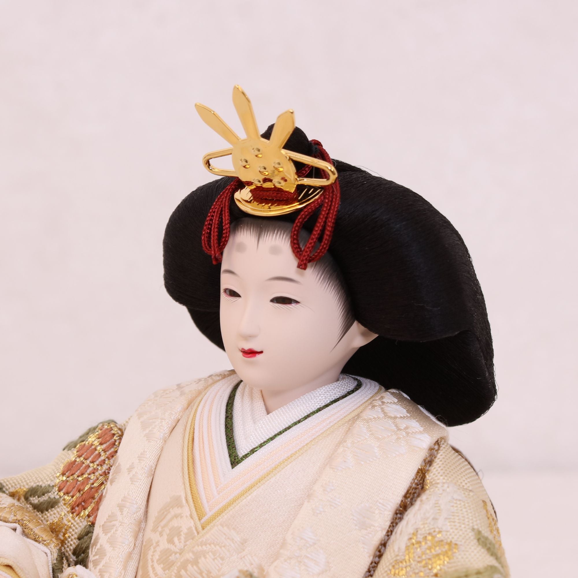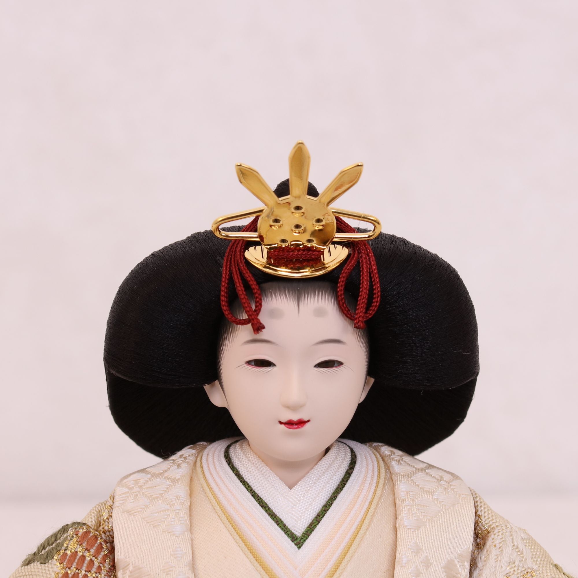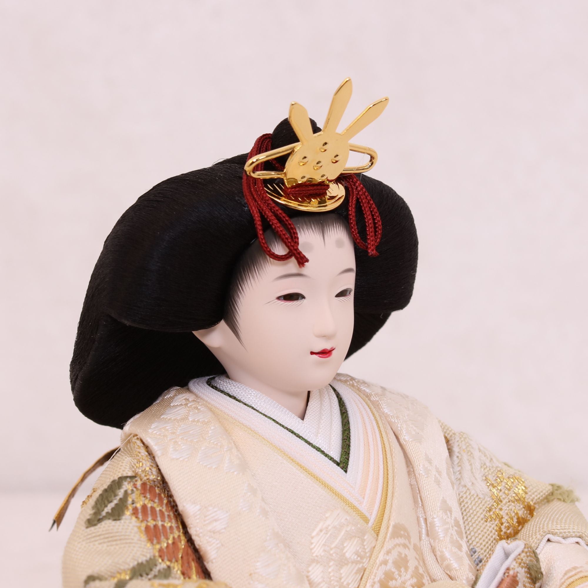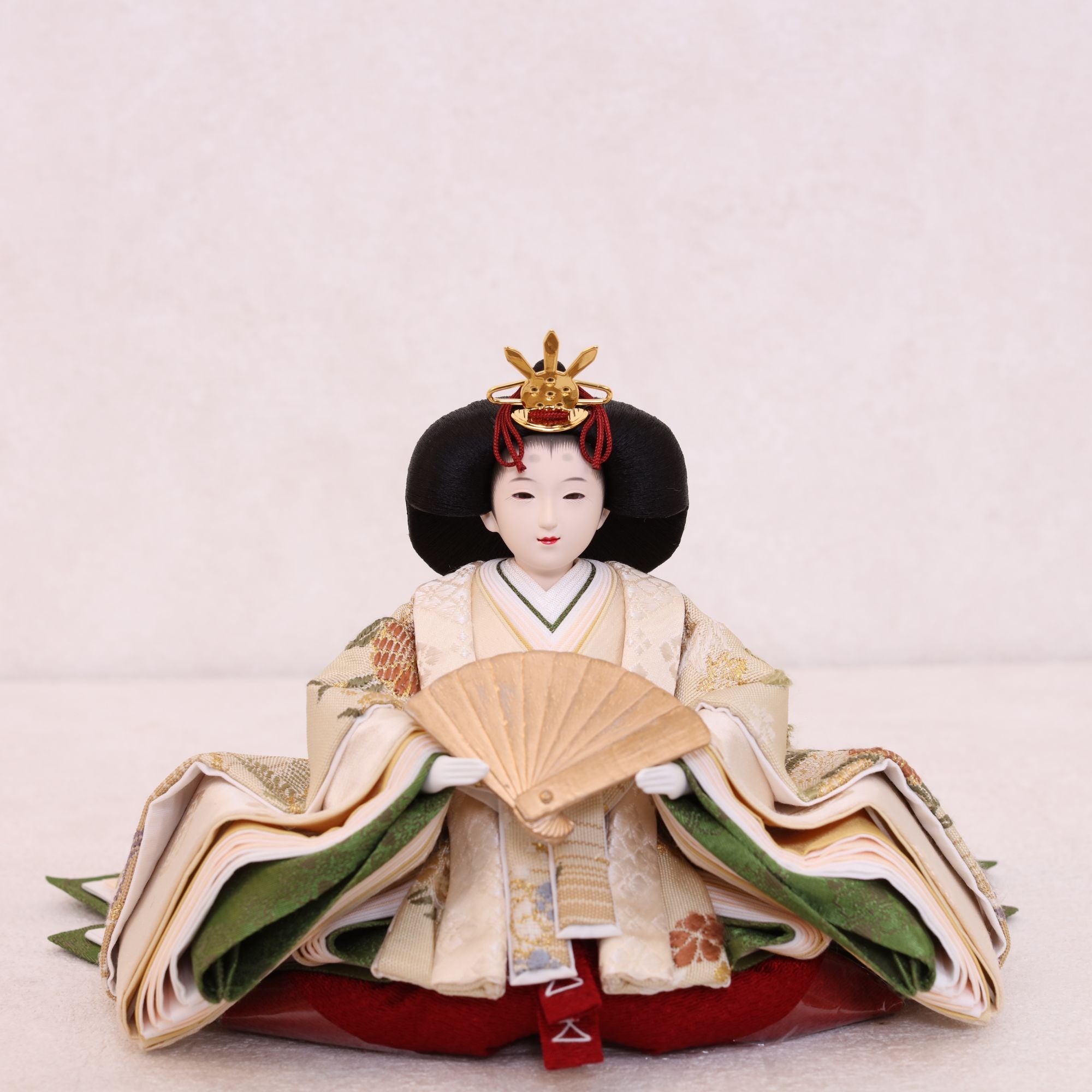 国産の分(せん)は、美しい木目と温もりある質感が魅力の天然木です。耐久性に優れ、経年とともに味わいを醸し出します。台座や屏風などに使用することで、自然素材ならではの落ち着いた風合いと上質感を演出し、雛人形全体をより品格ある印象に仕上げます。