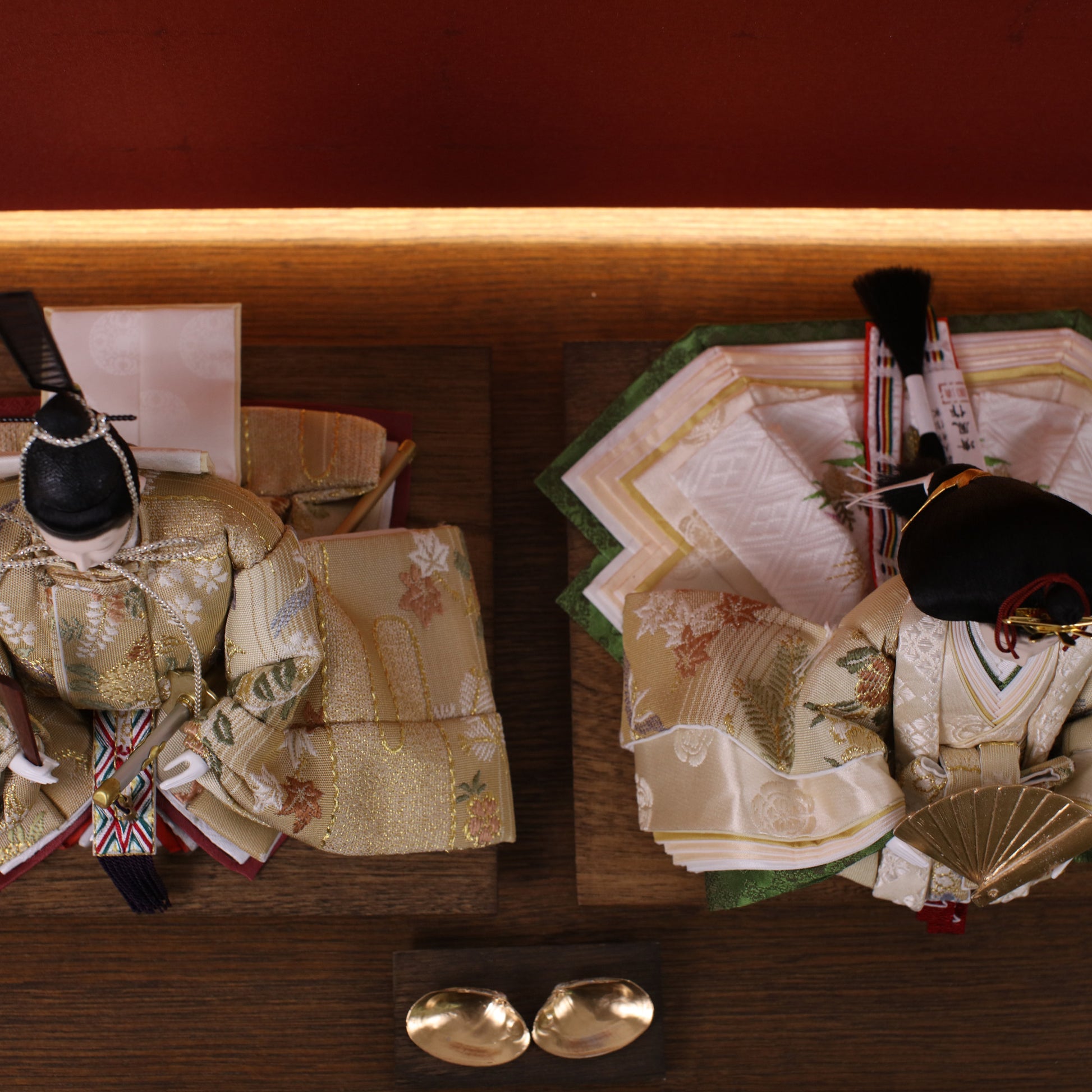 お屏風の下からは柔らかなライトがともり、実物と映る姿が重なって飾り全体がいっそう華やかで、美しい世界が生まれます。