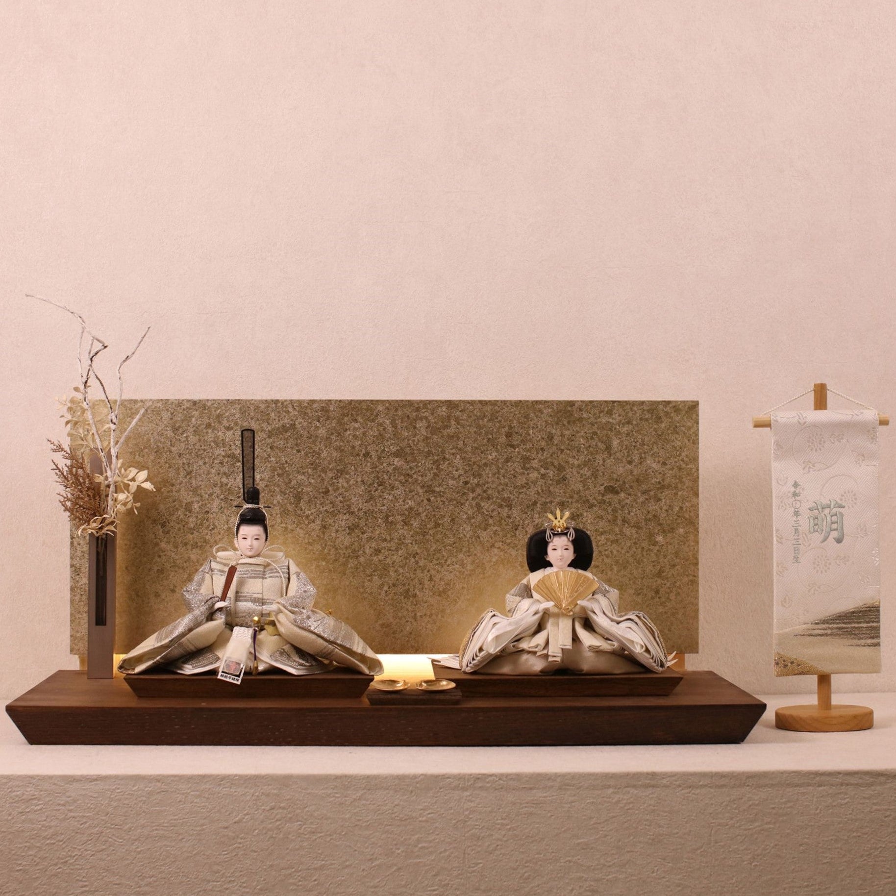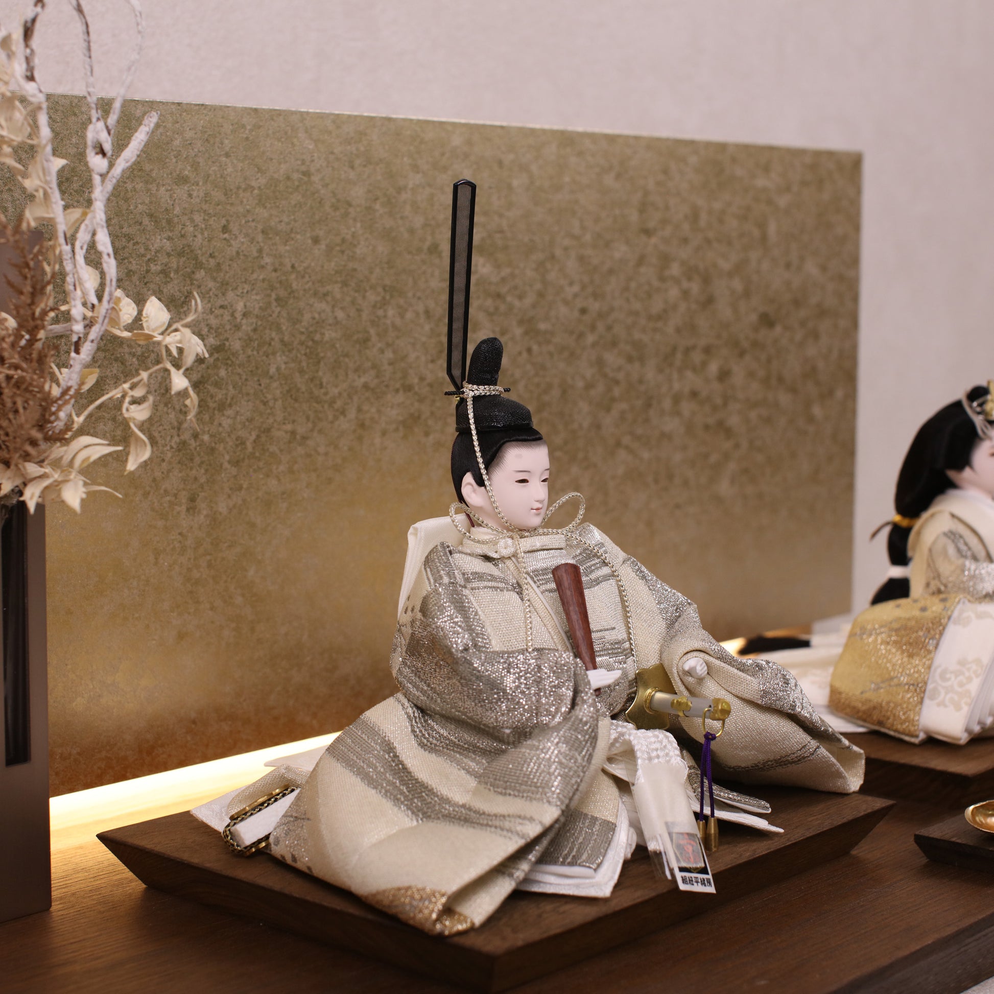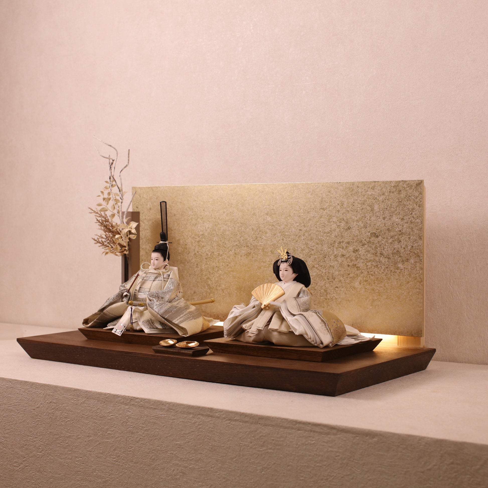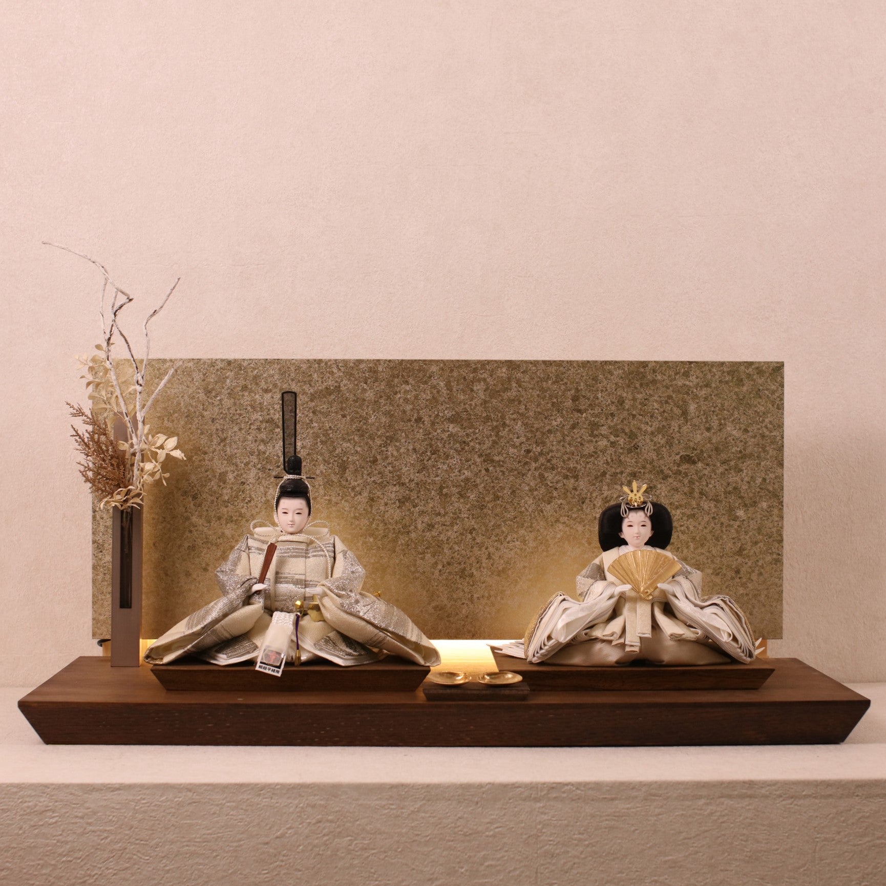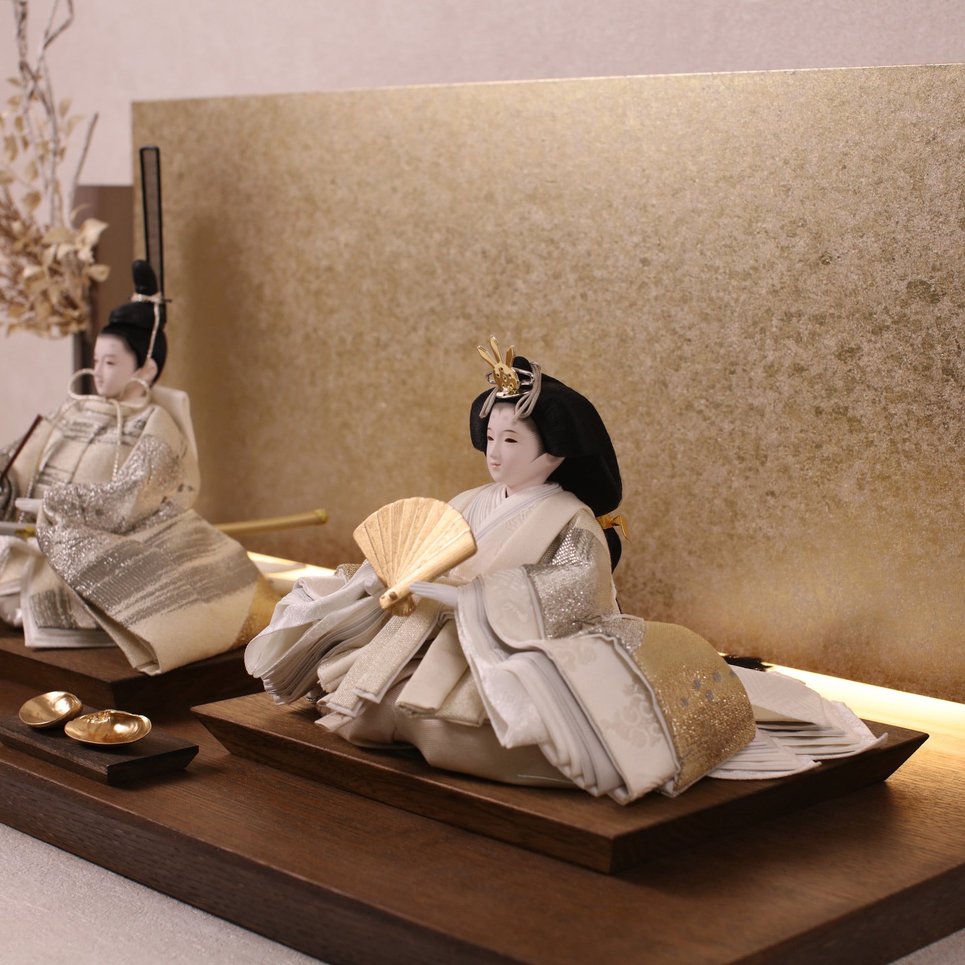 箔押しのお屏風は光を受けて輝き、お雛様の姿をそっと映し出します。