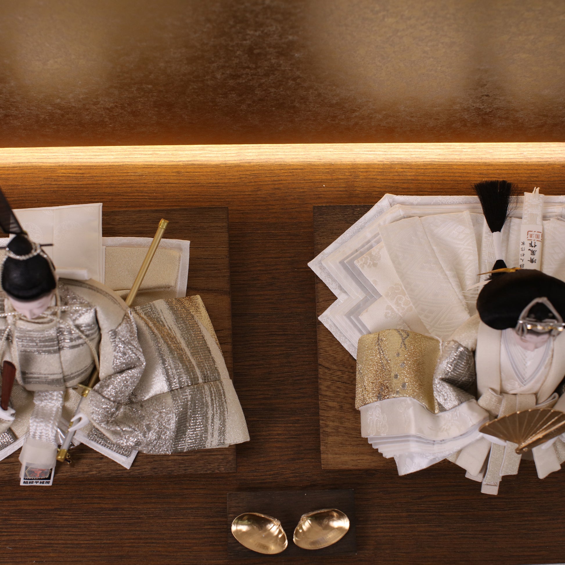 お屏風の下からは柔らかなライトがともり、実物と映る姿が重なって飾り全体がいっそう華やかで、美しい世界が生まれます。