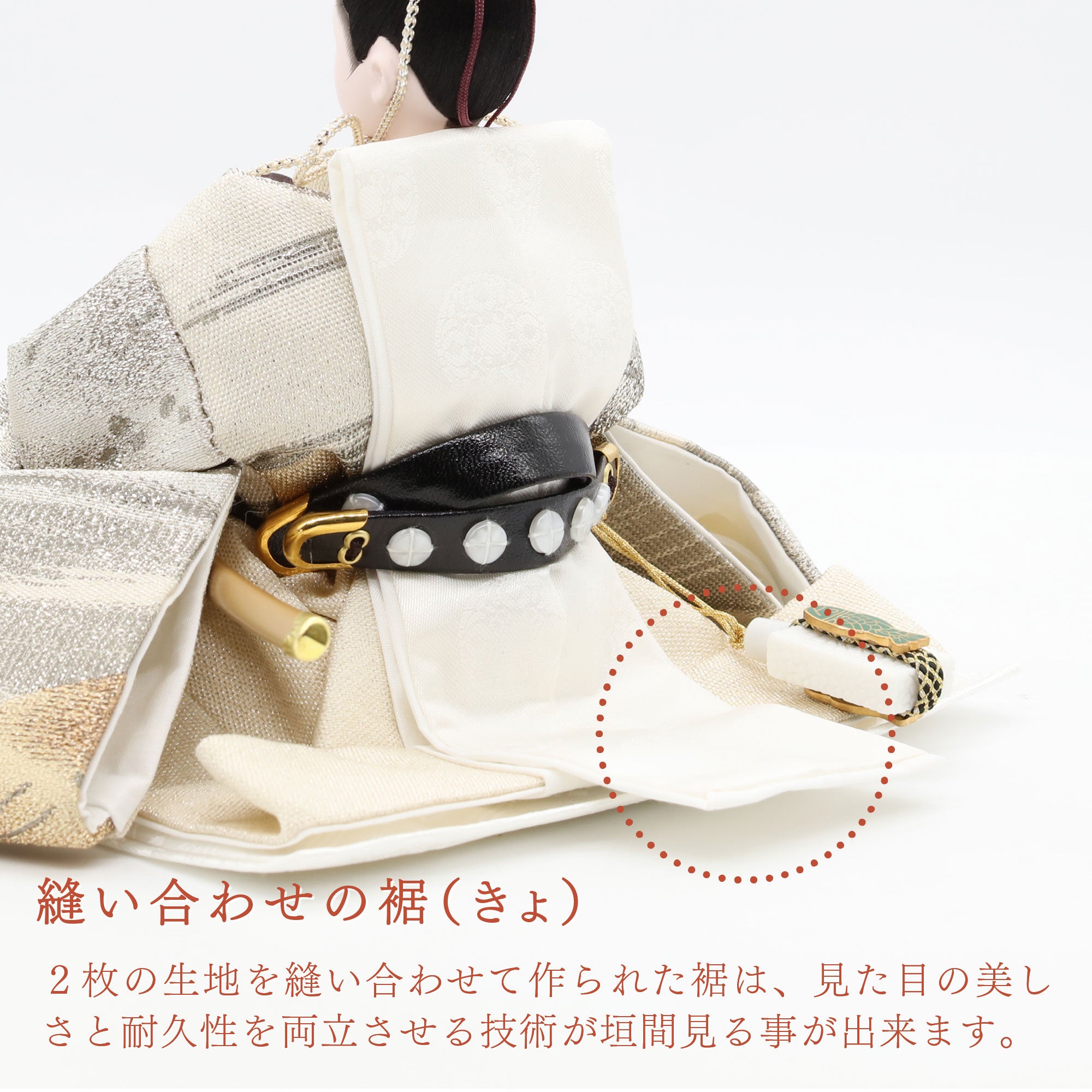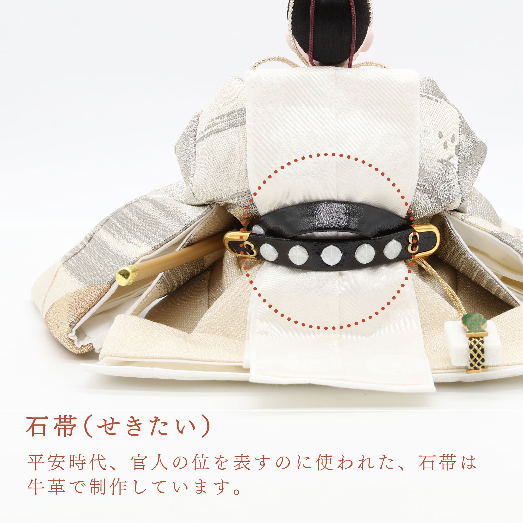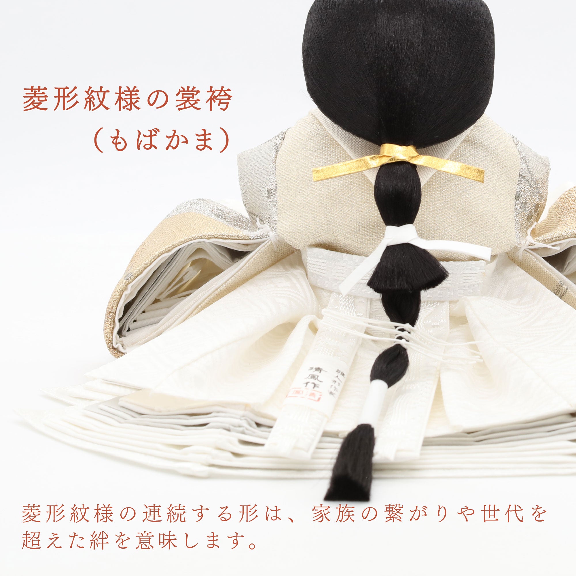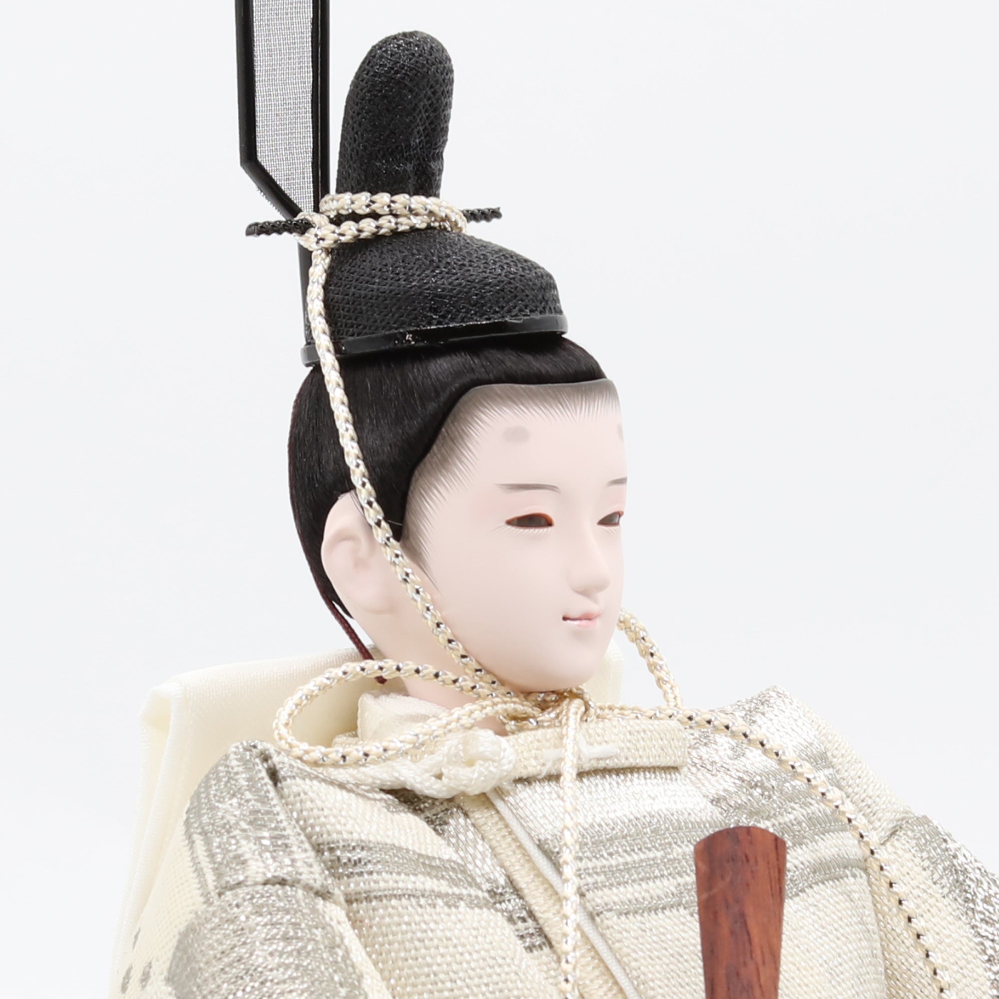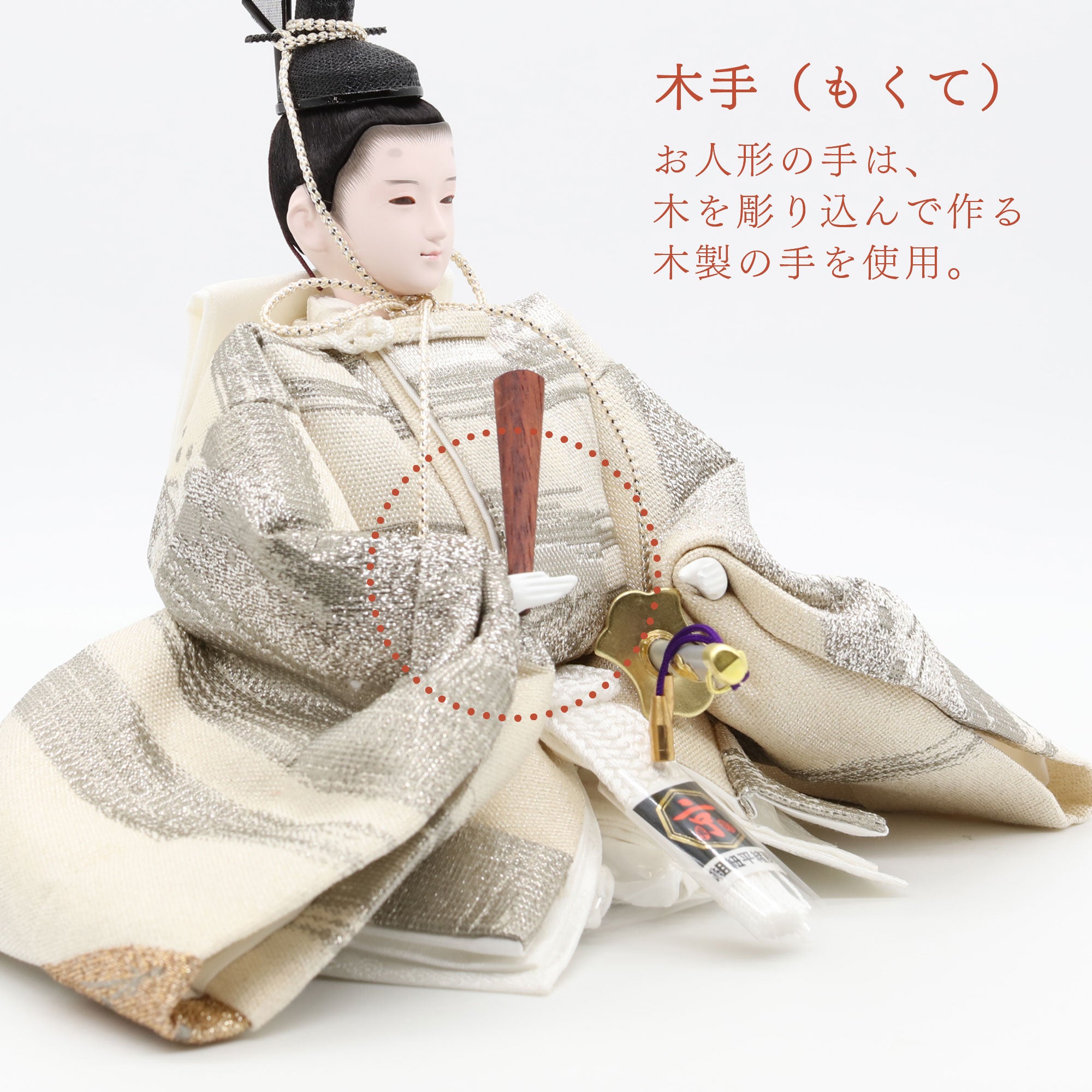 国産の分(せん)は、美しい木目と温もりある質感が魅力の天然木です。耐久性に優れ、経年とともに味わいを醸し出します。台座や屏風などに使用することで、自然素材ならではの落ち着いた風合いと上質感を演出し、雛人形全体をより品格ある印象に仕上げます。