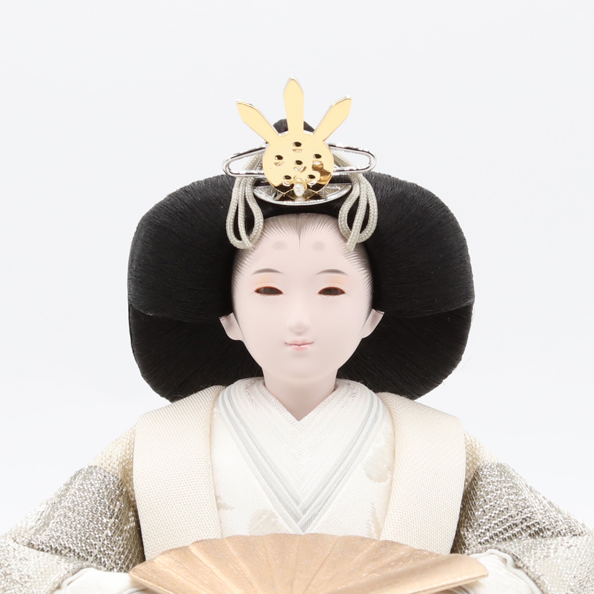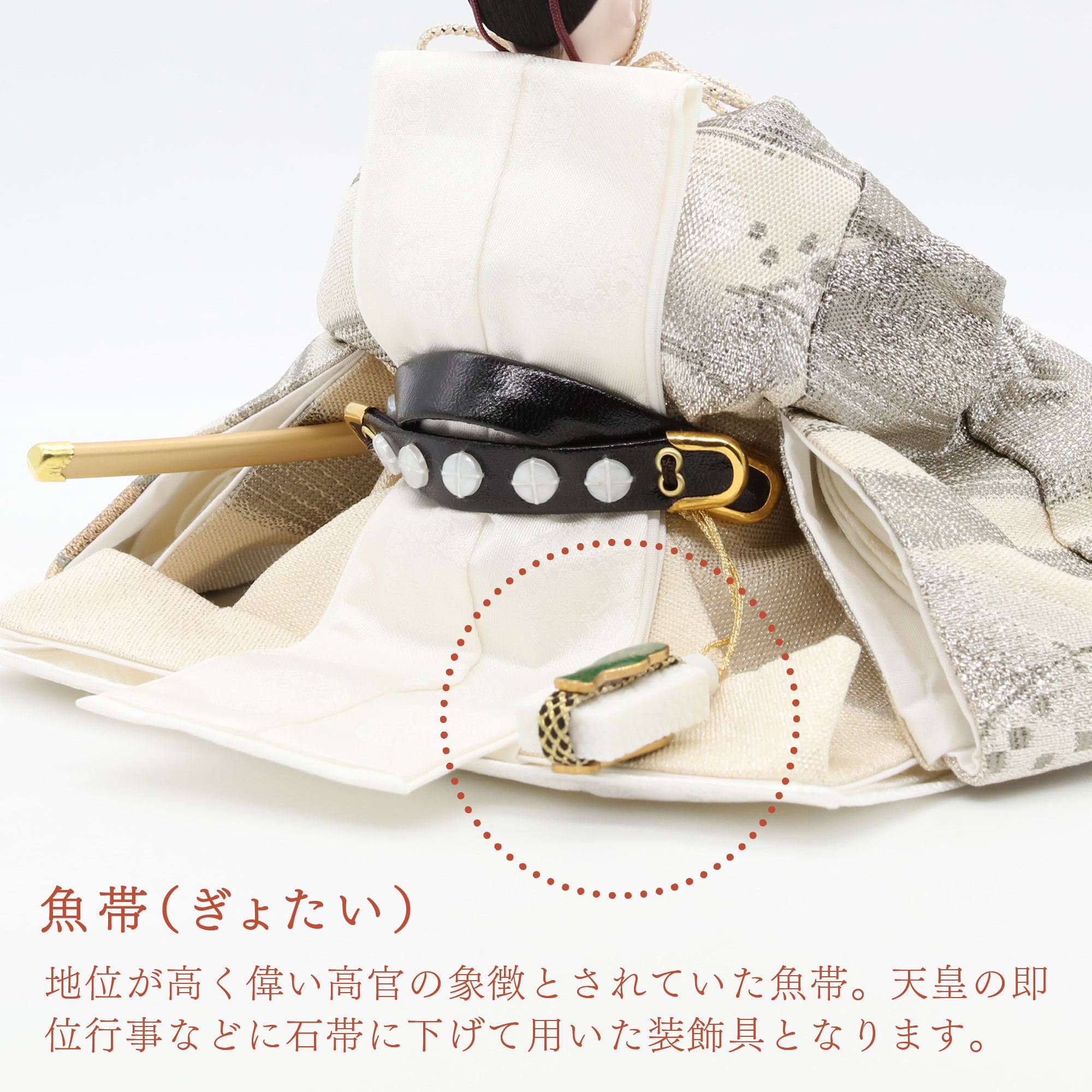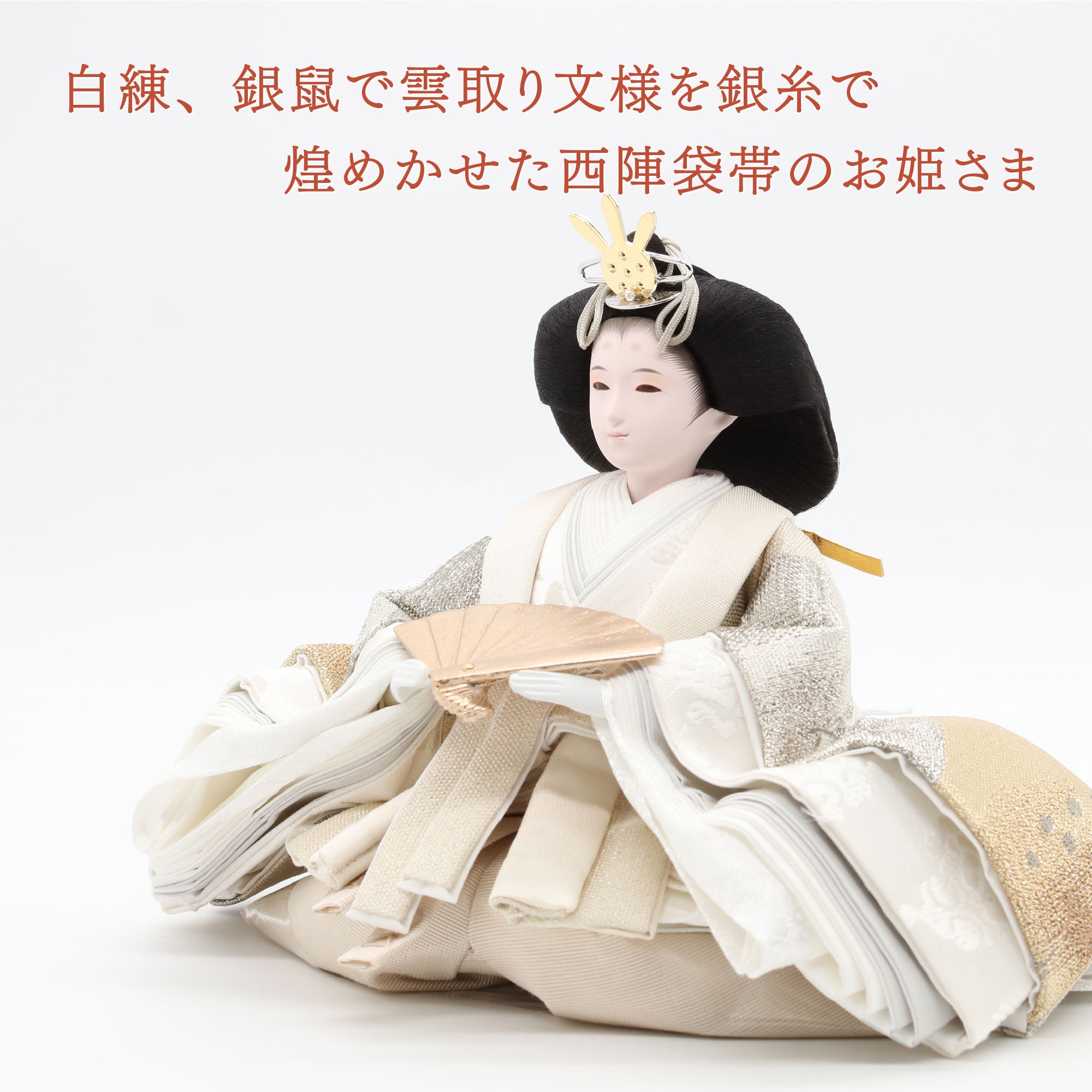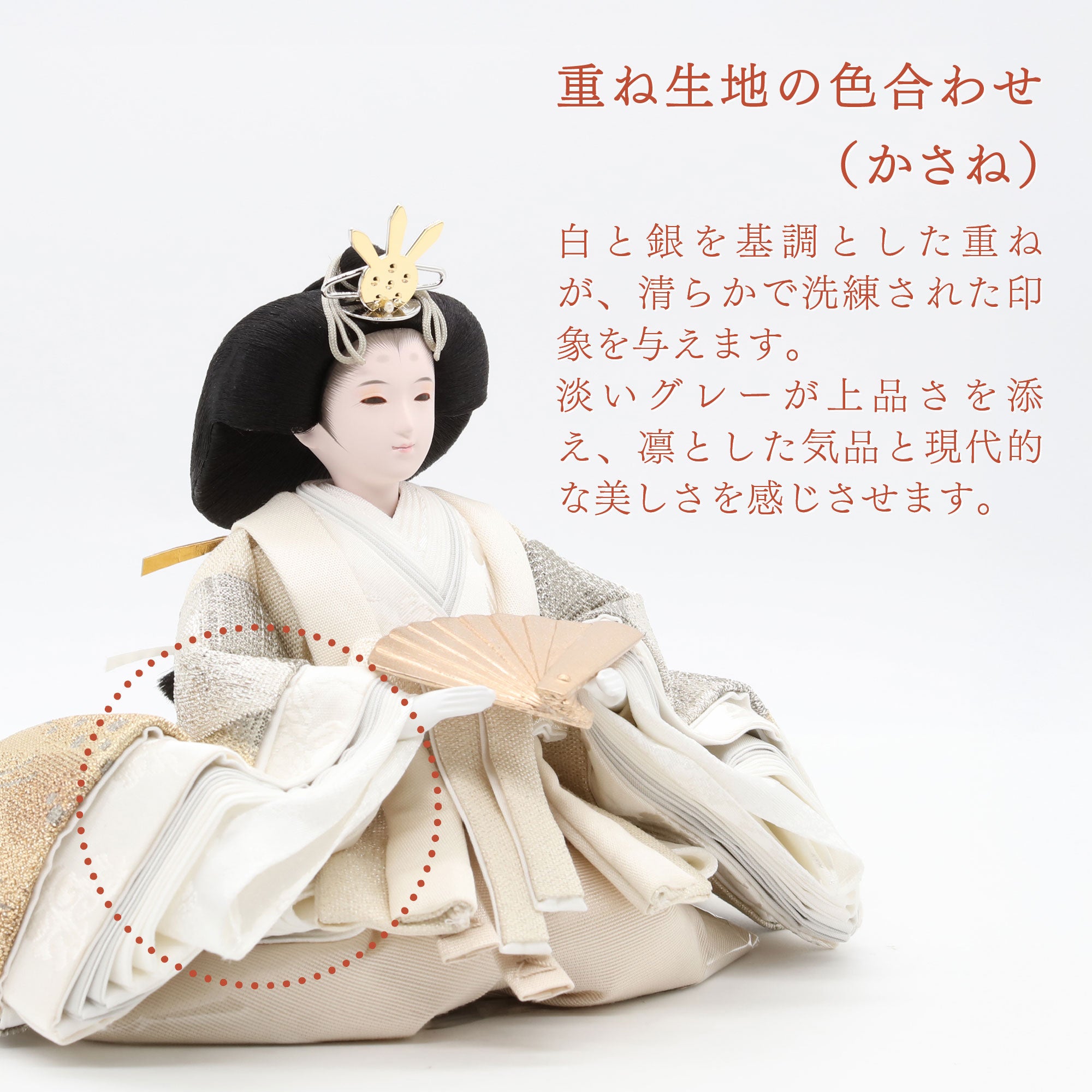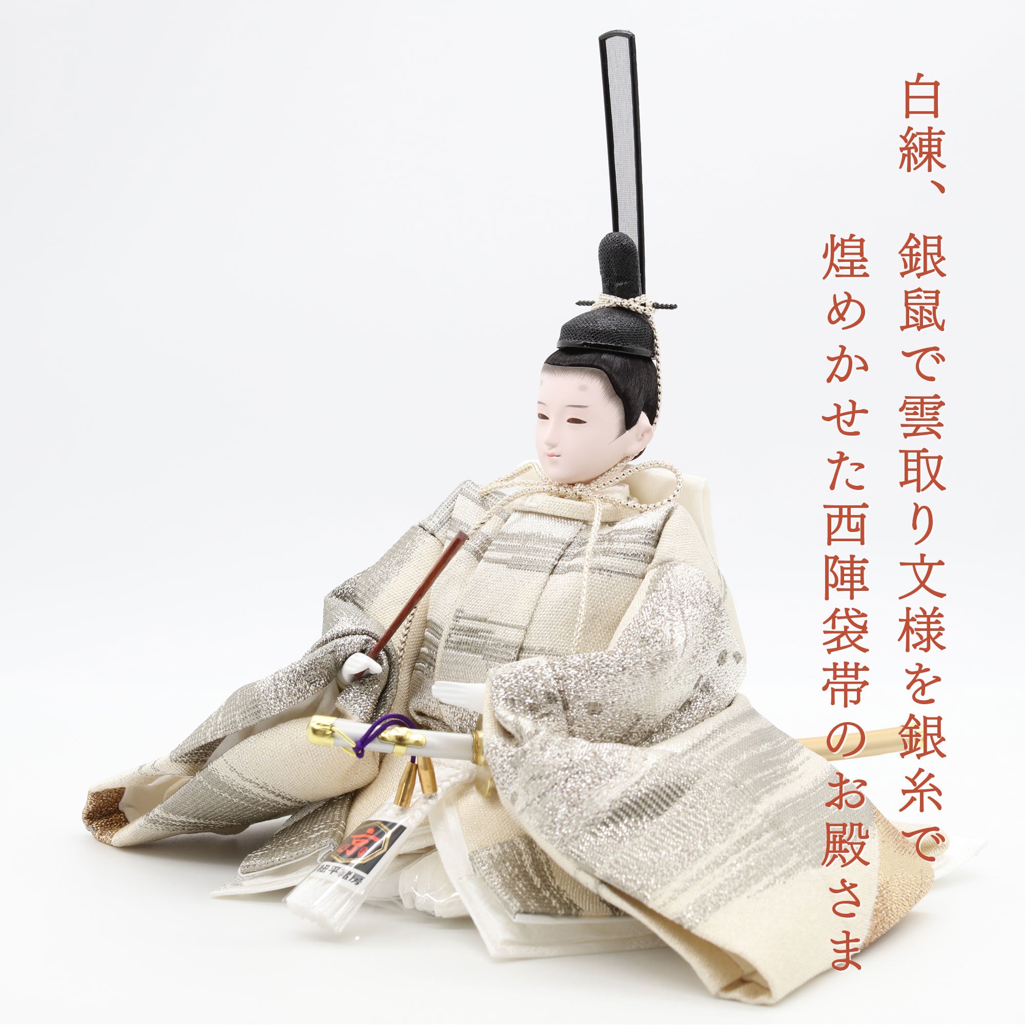 国産の分(せん)は、美しい木目と温もりある質感が魅力の天然木です。耐久性に優れ、経年とともに味わいを醸し出します。台座や屏風などに使用することで、自然素材ならではの落ち着いた風合いと上質感を演出し、雛人形全体をより品格ある印象に仕上げます。