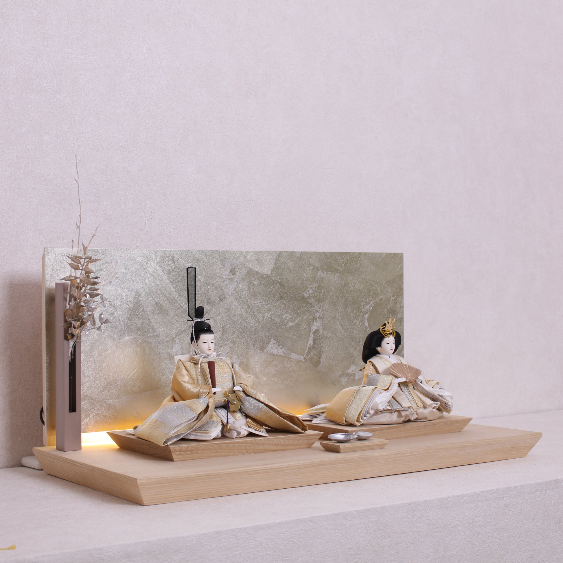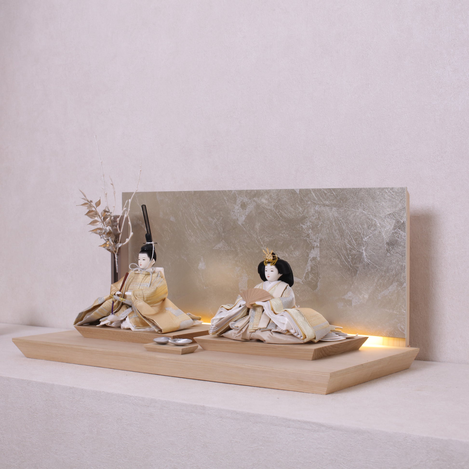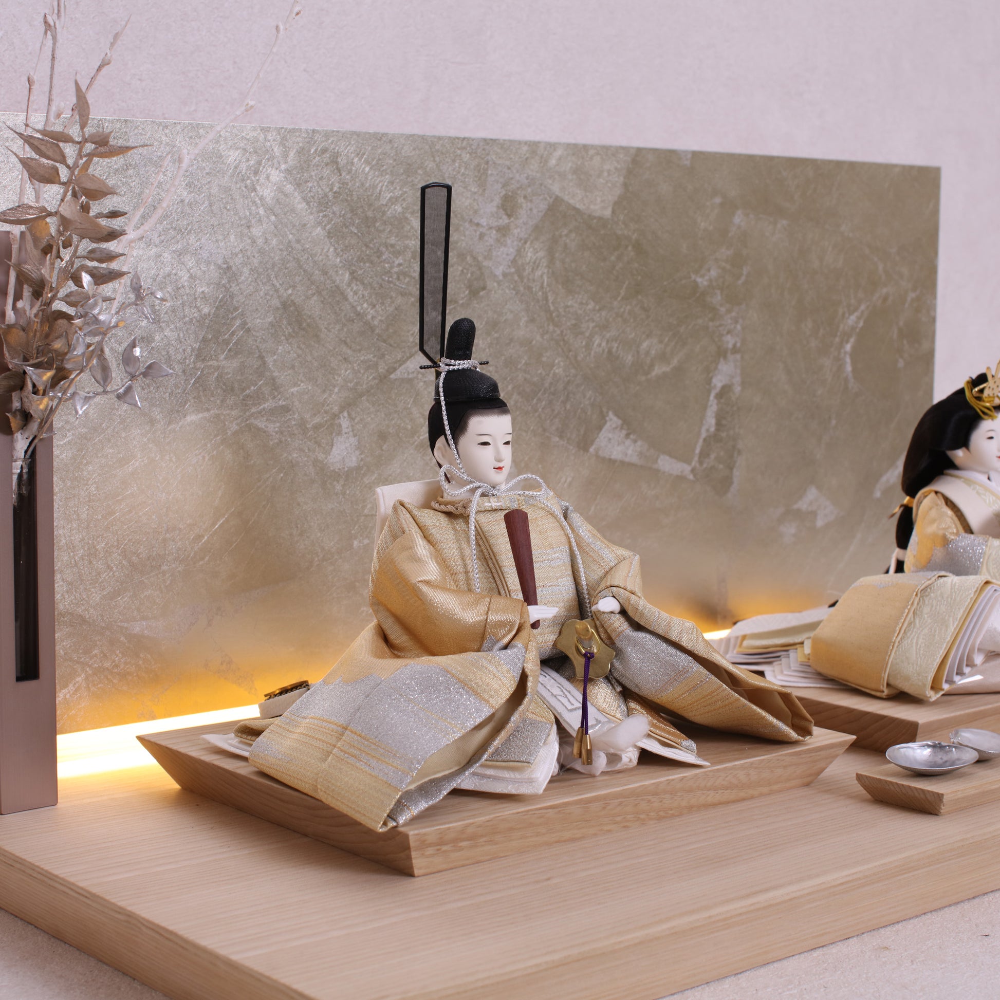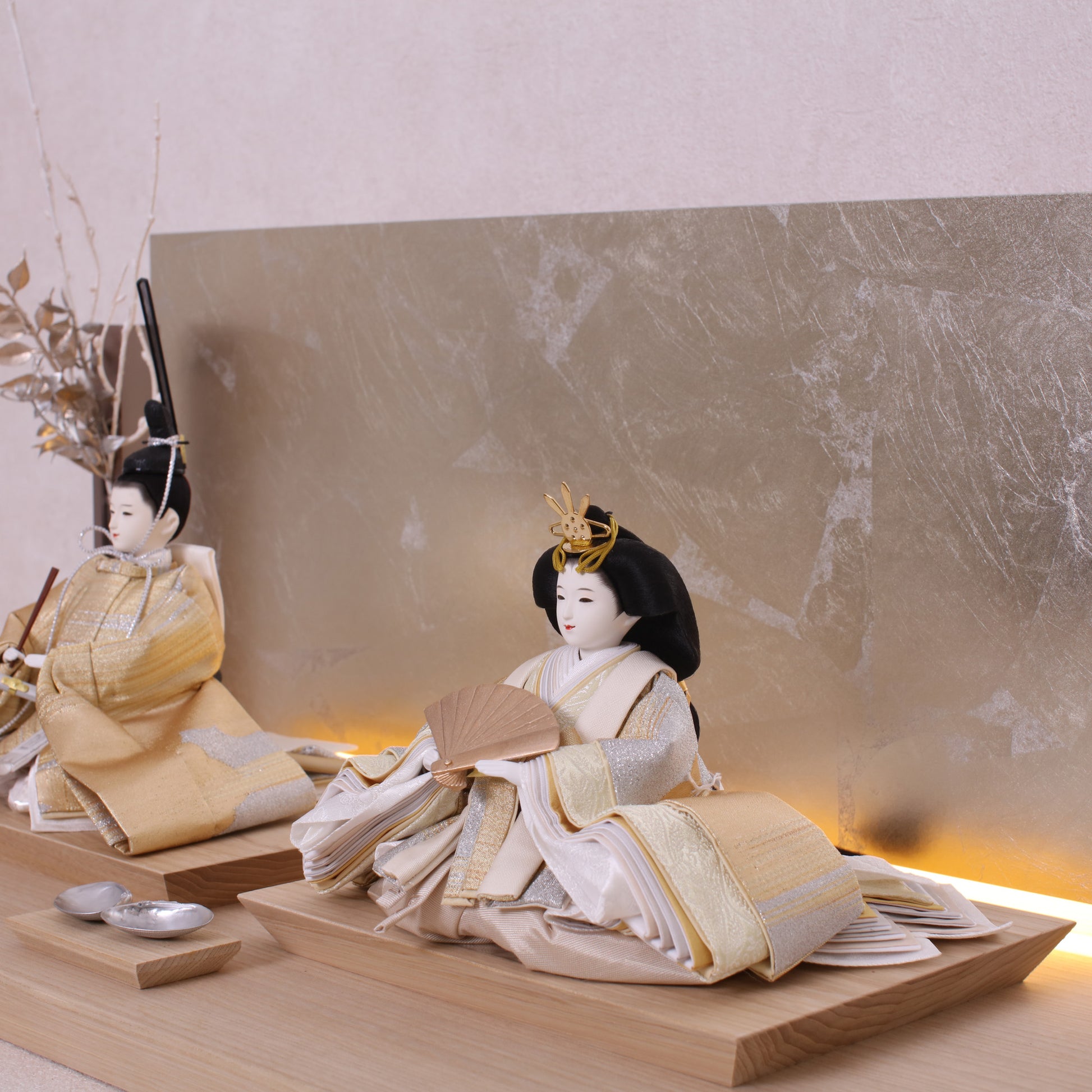 箔押しのお屏風は光を受けて輝き、お雛様の姿をそっと映し出します。