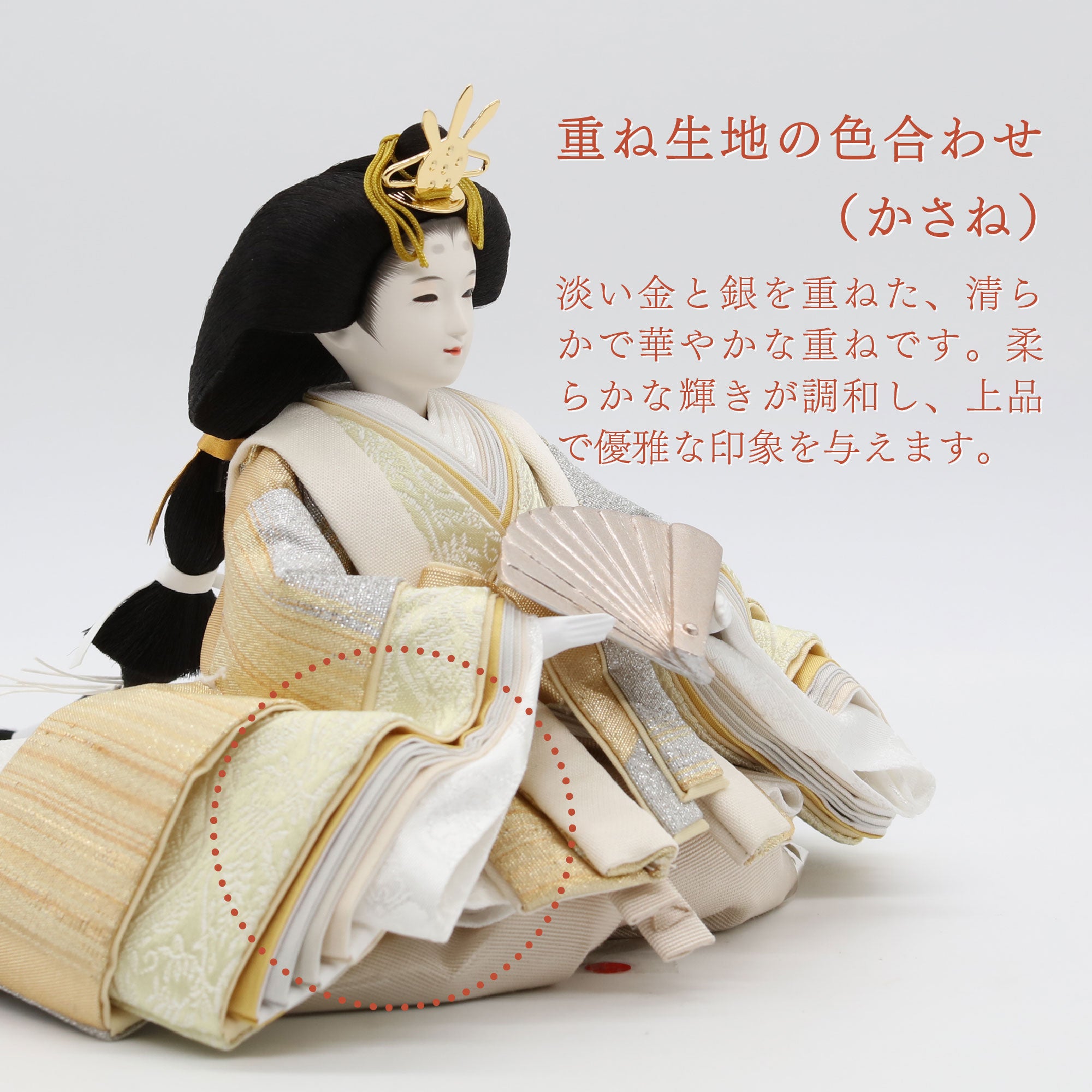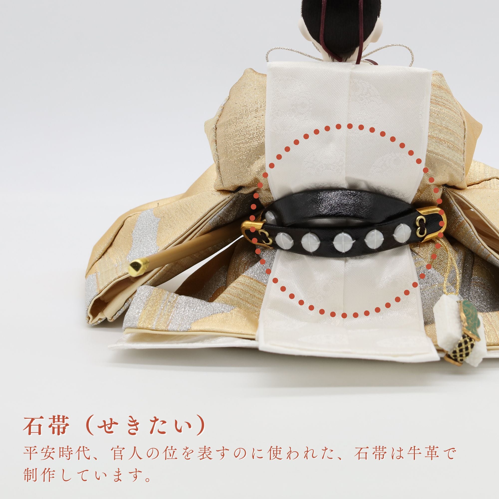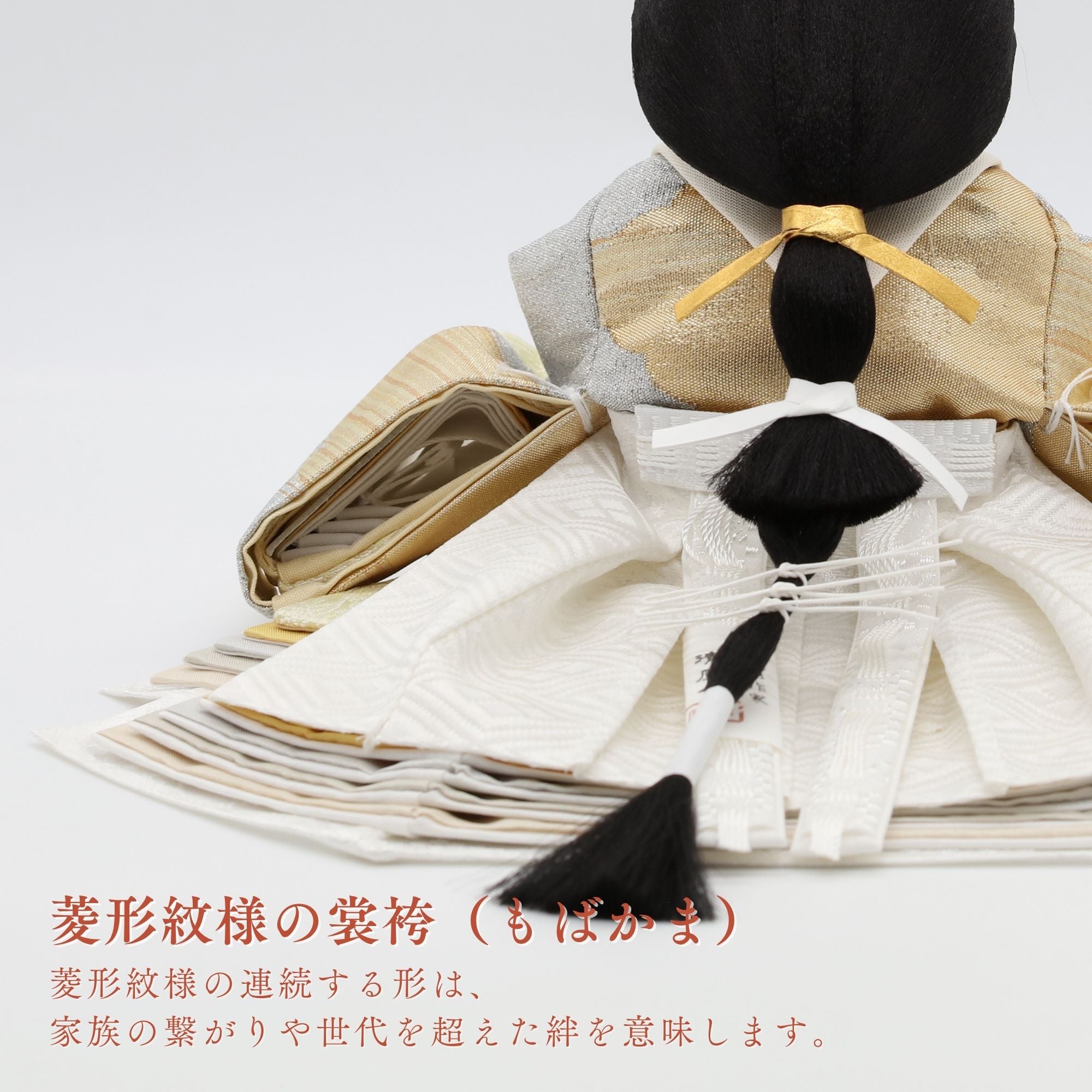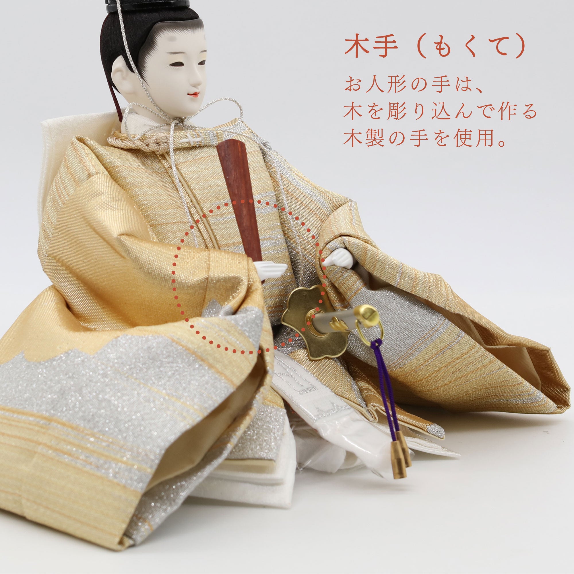国産の分(せん)は、美しい木目と温もりある質感が魅力の天然木です。耐久性に優れ、経年とともに味わいを醸し出します。台座や屏風などに使用することで、自然素材ならではの落ち着いた風合いと上質感を演出し、雛人形全体をより品格ある印象に仕上げます。