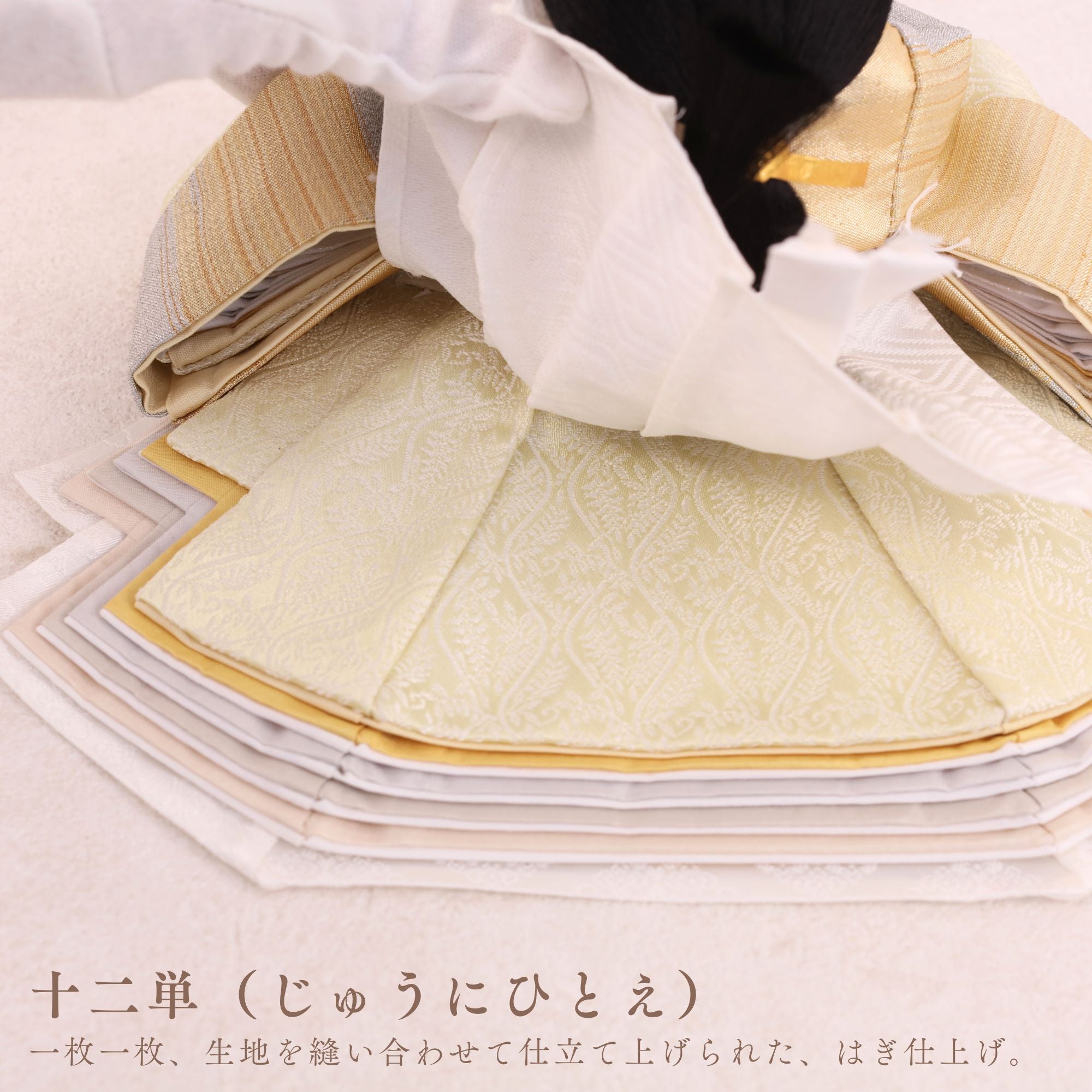 山吹色と銀鼠で雲取り文様を金銀糸で優雅に織った西陣袋帯のお姫さま