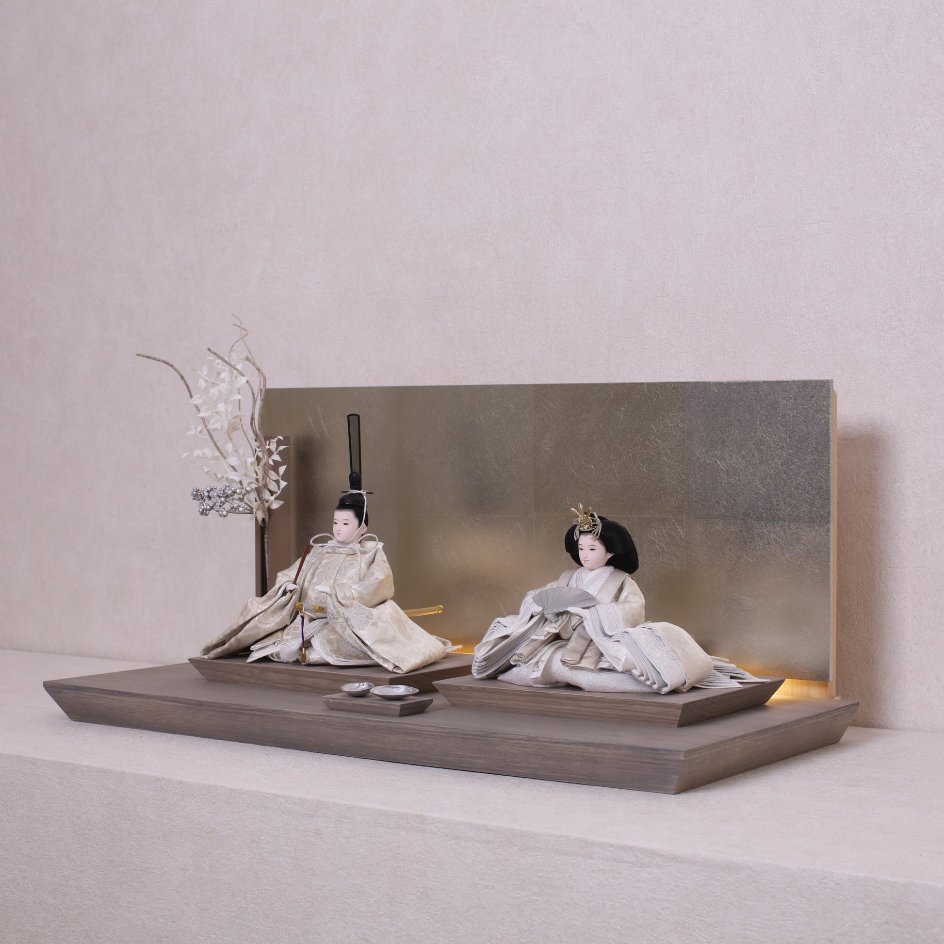 箔押しのお屏風は光を受けて輝き、お雛様の姿をそっと映し出します。