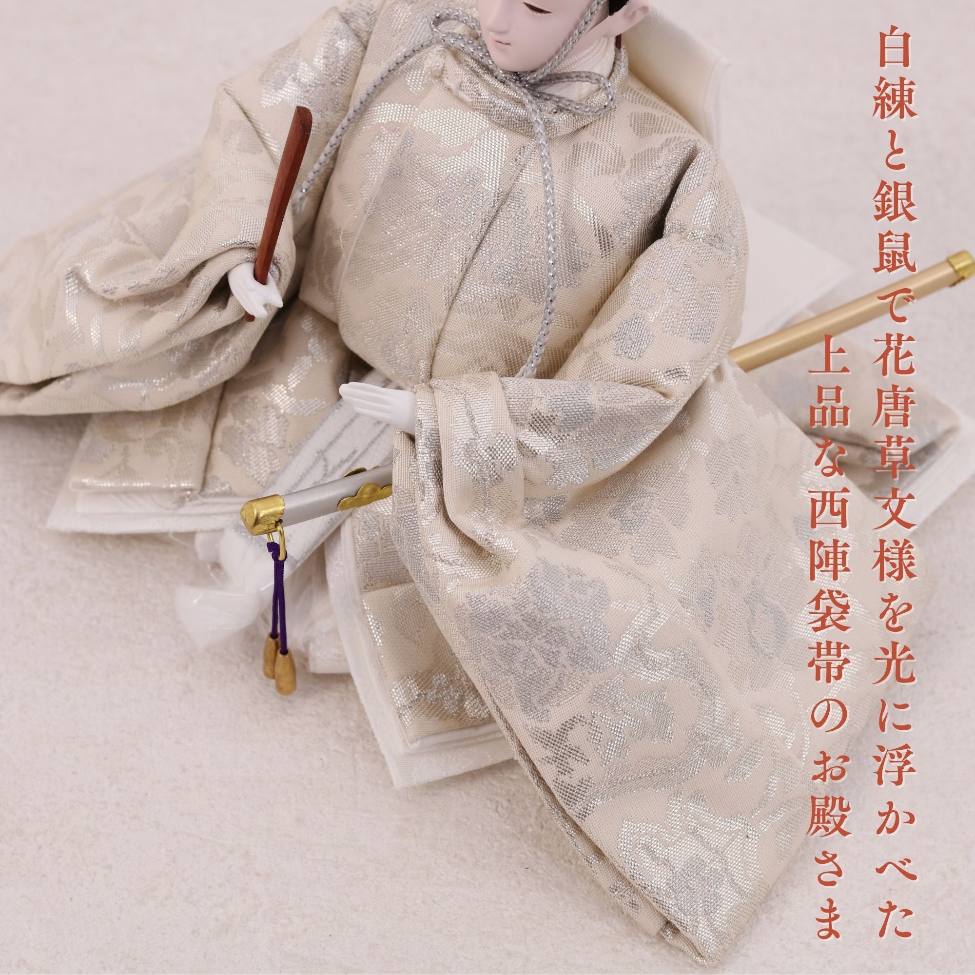 白練と銀鼠の花唐草文様を施した西陣袋帯の殿。光の角度で浮かび上がる文様が、子どもの健やかな成長と家庭の繁栄を祈る意味を持っています。