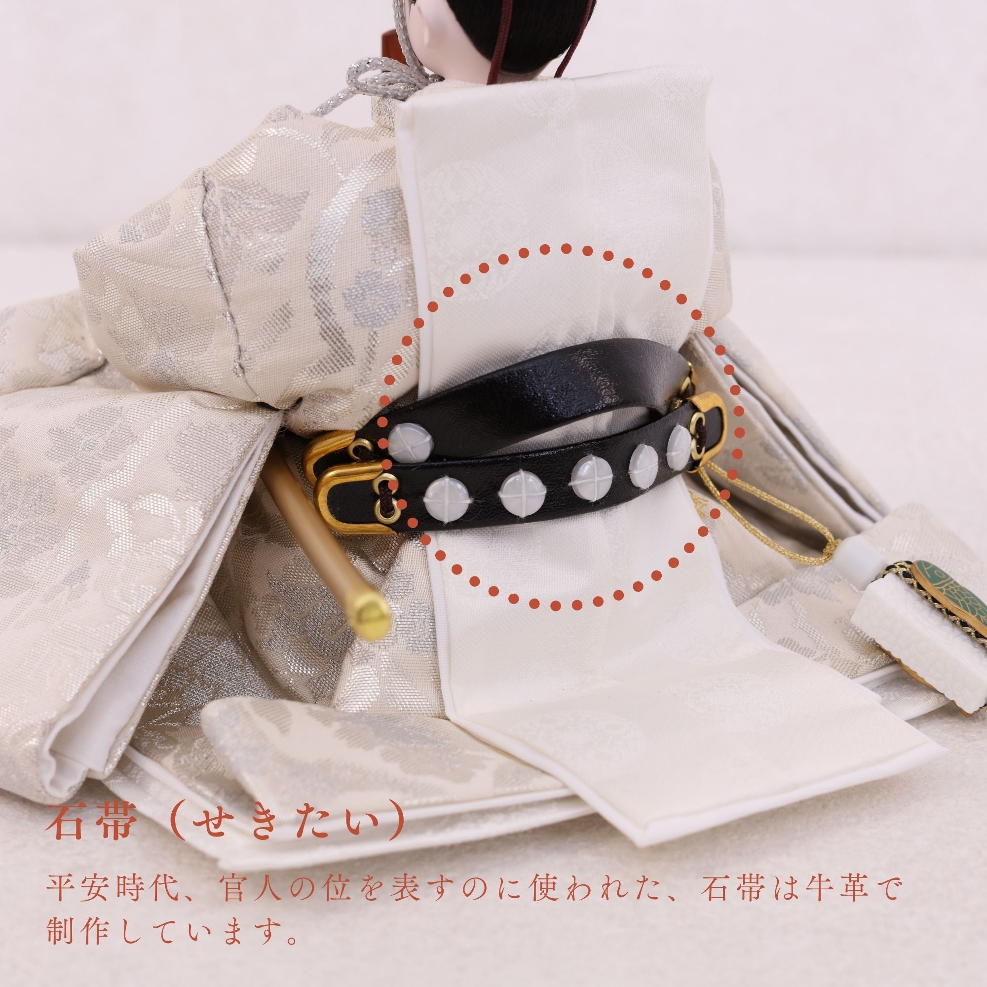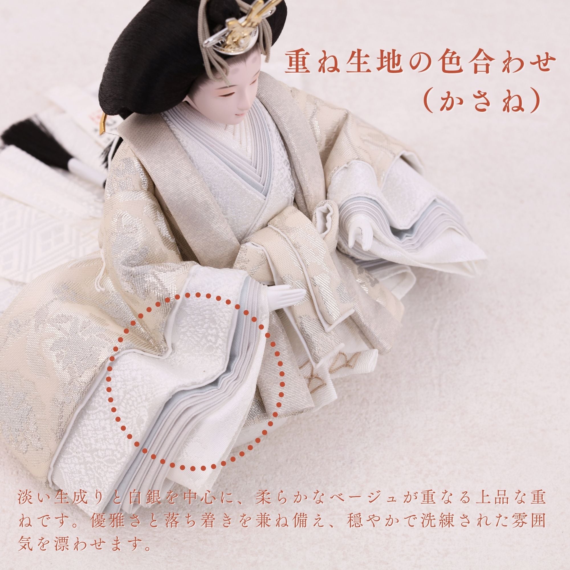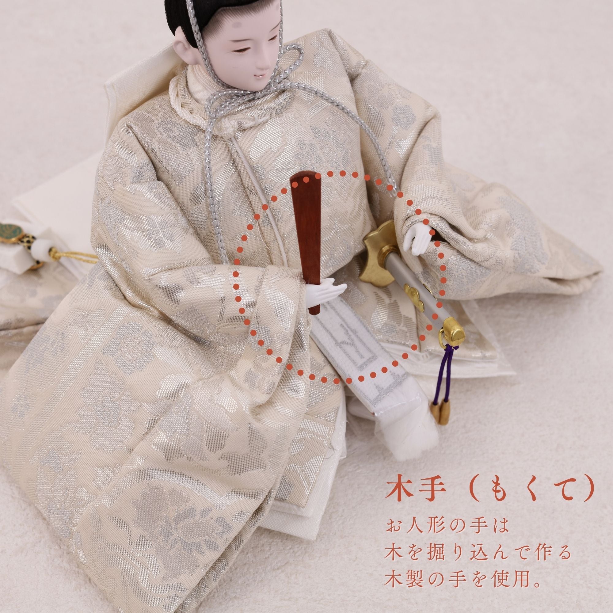 国産の分(せん)は、美しい木目と温もりある質感が魅力の天然木です。耐久性に優れ、経年とともに味わいを醸し出します。台座や屏風などに使用することで、自然素材ならではの落ち着いた風合いと上質感を演出し、雛人形全体をより品格ある印象に仕上げます。