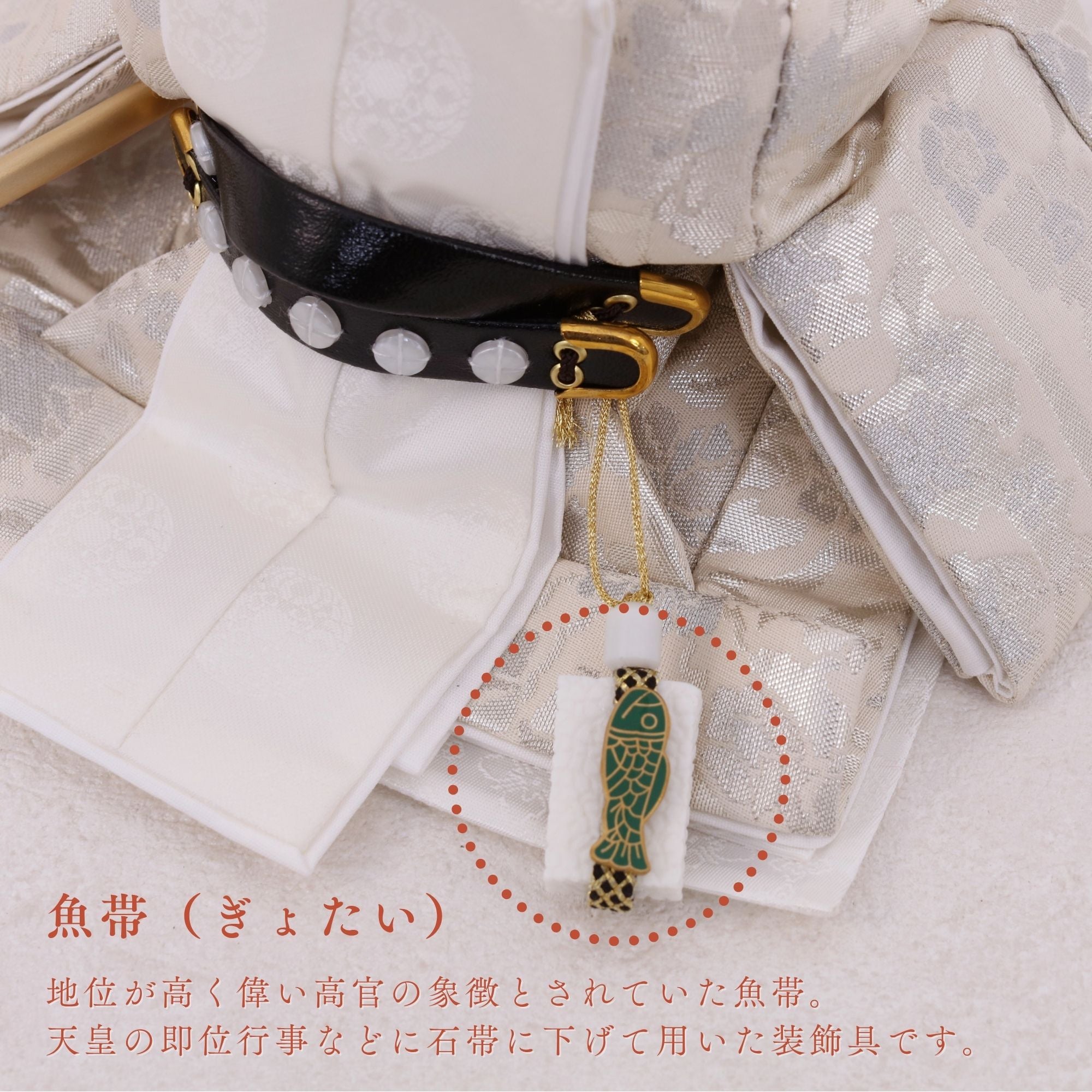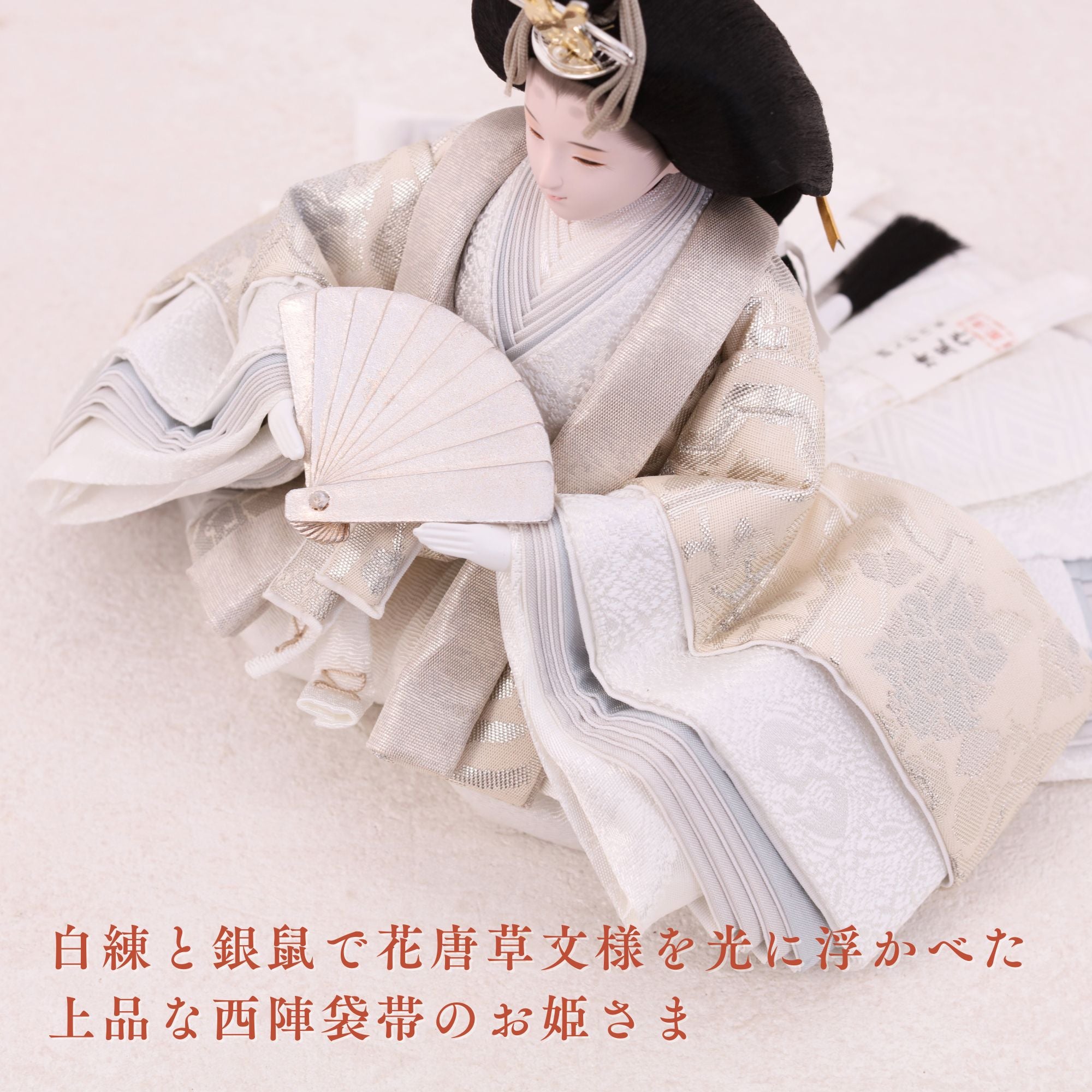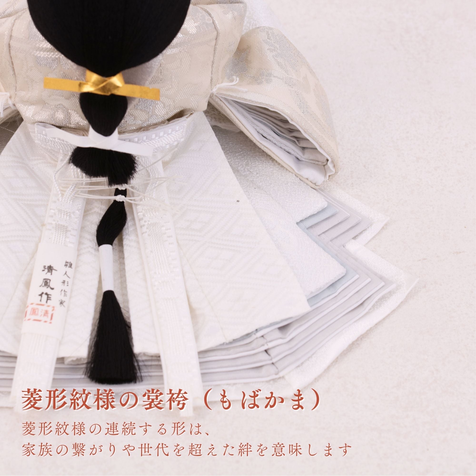 国産の分(せん)は、美しい木目と温もりある質感が魅力の天然木です。耐久性に優れ、経年とともに味わいを醸し出します。台座や屏風などに使用することで、自然素材ならではの落ち着いた風合いと上質感を演出し、雛人形全体をより品格ある印象に仕上げます。