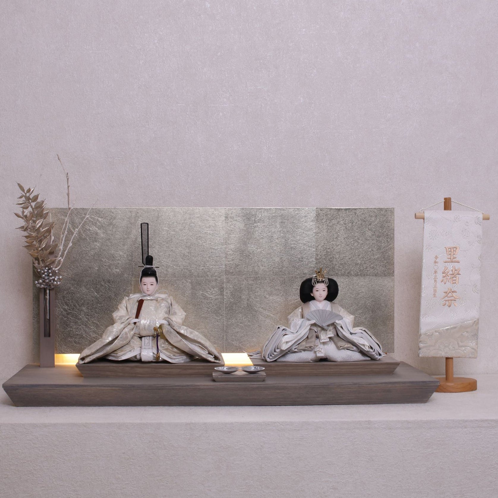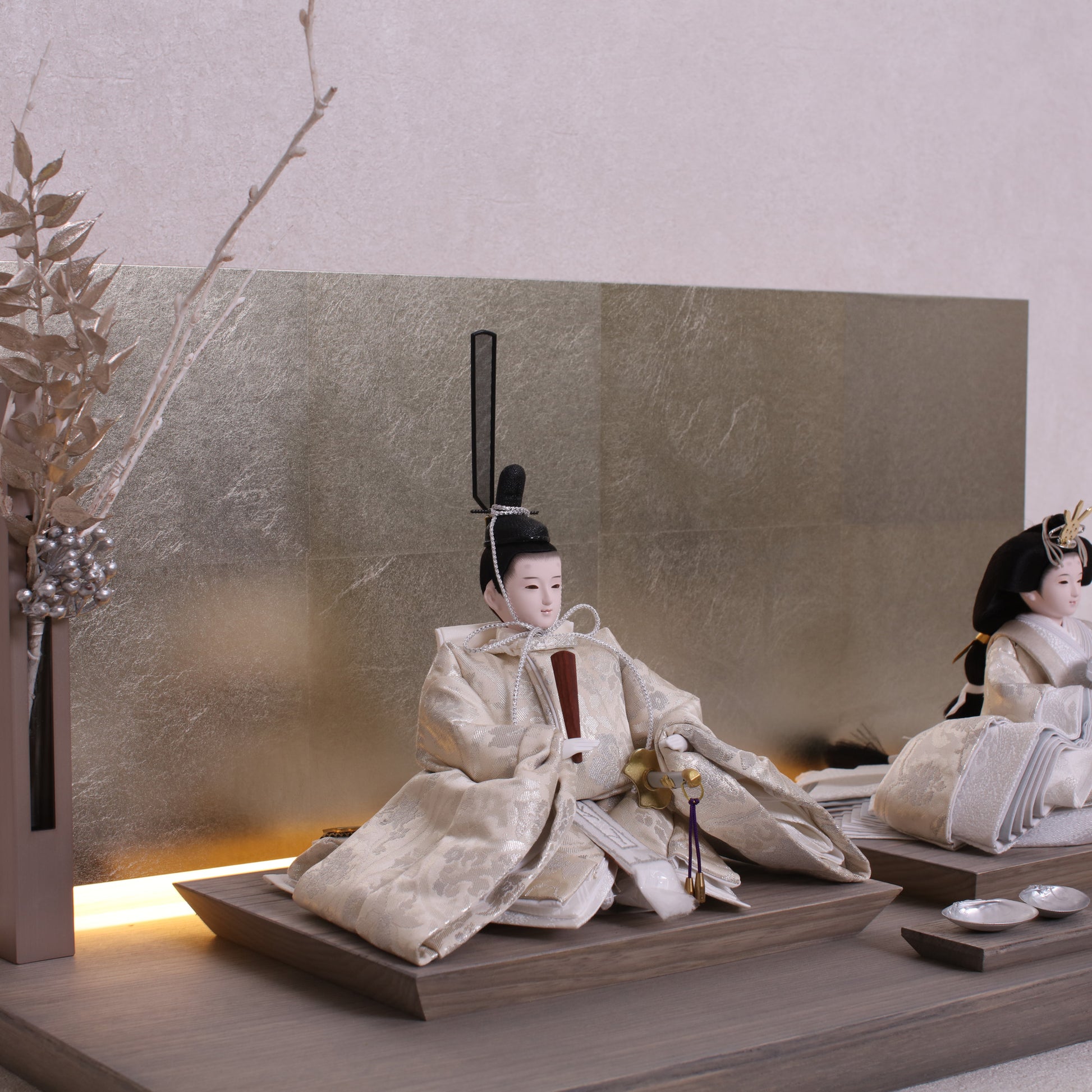 箔押しのお屏風は光を受けて輝き、お雛様の姿をそっと映し出します。