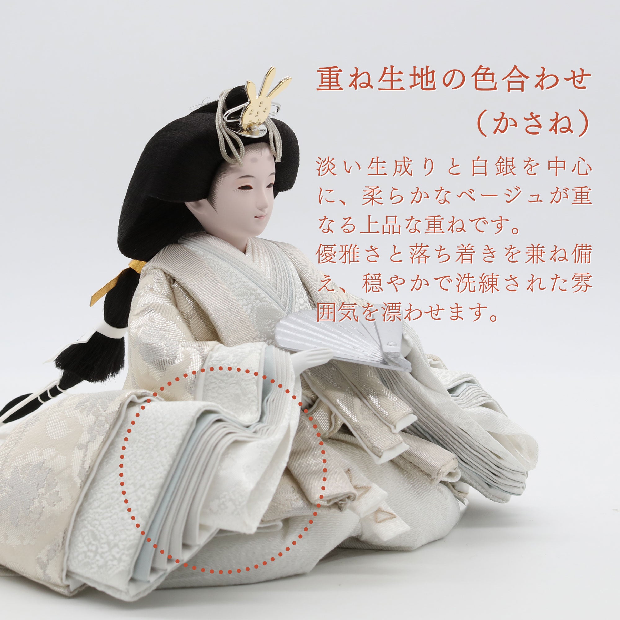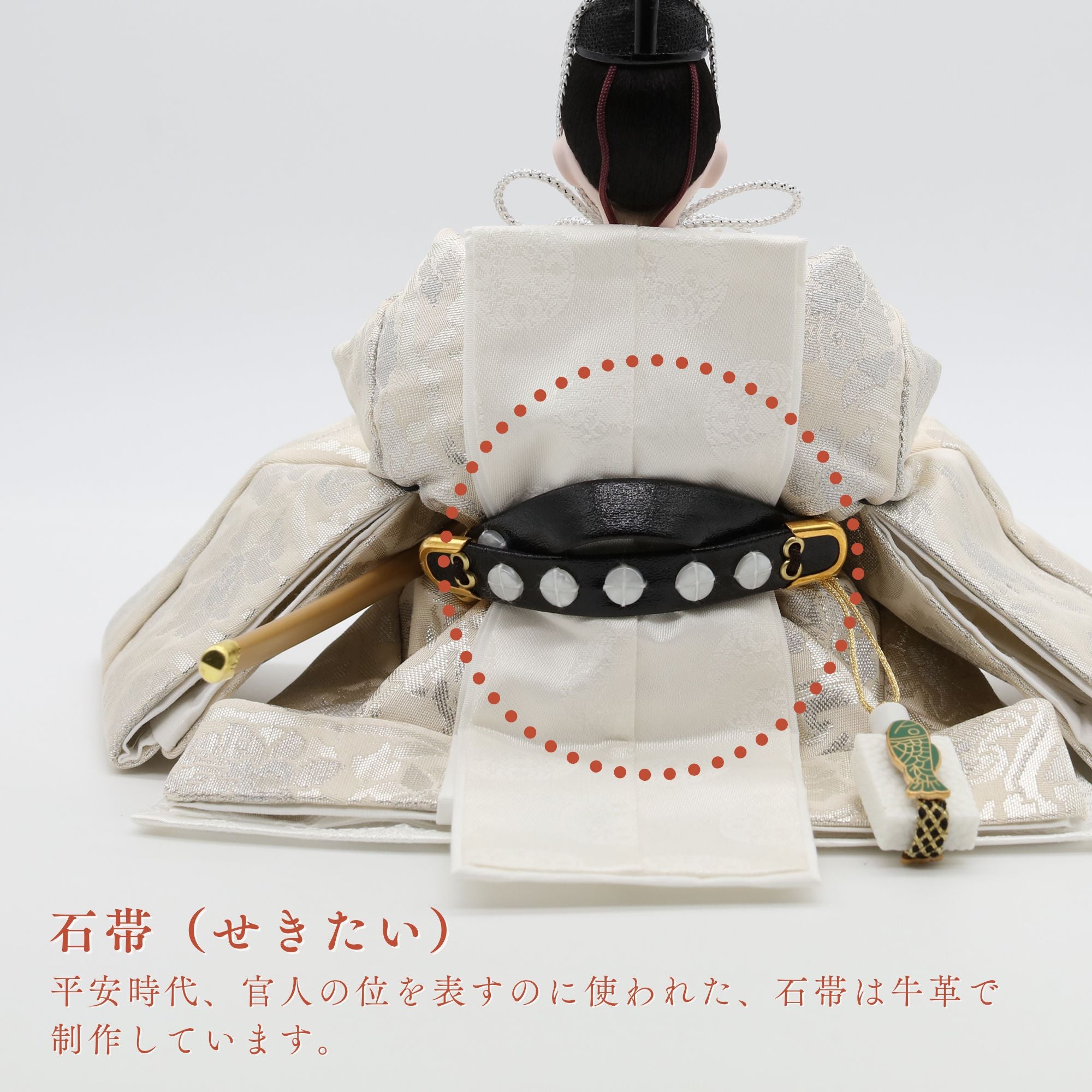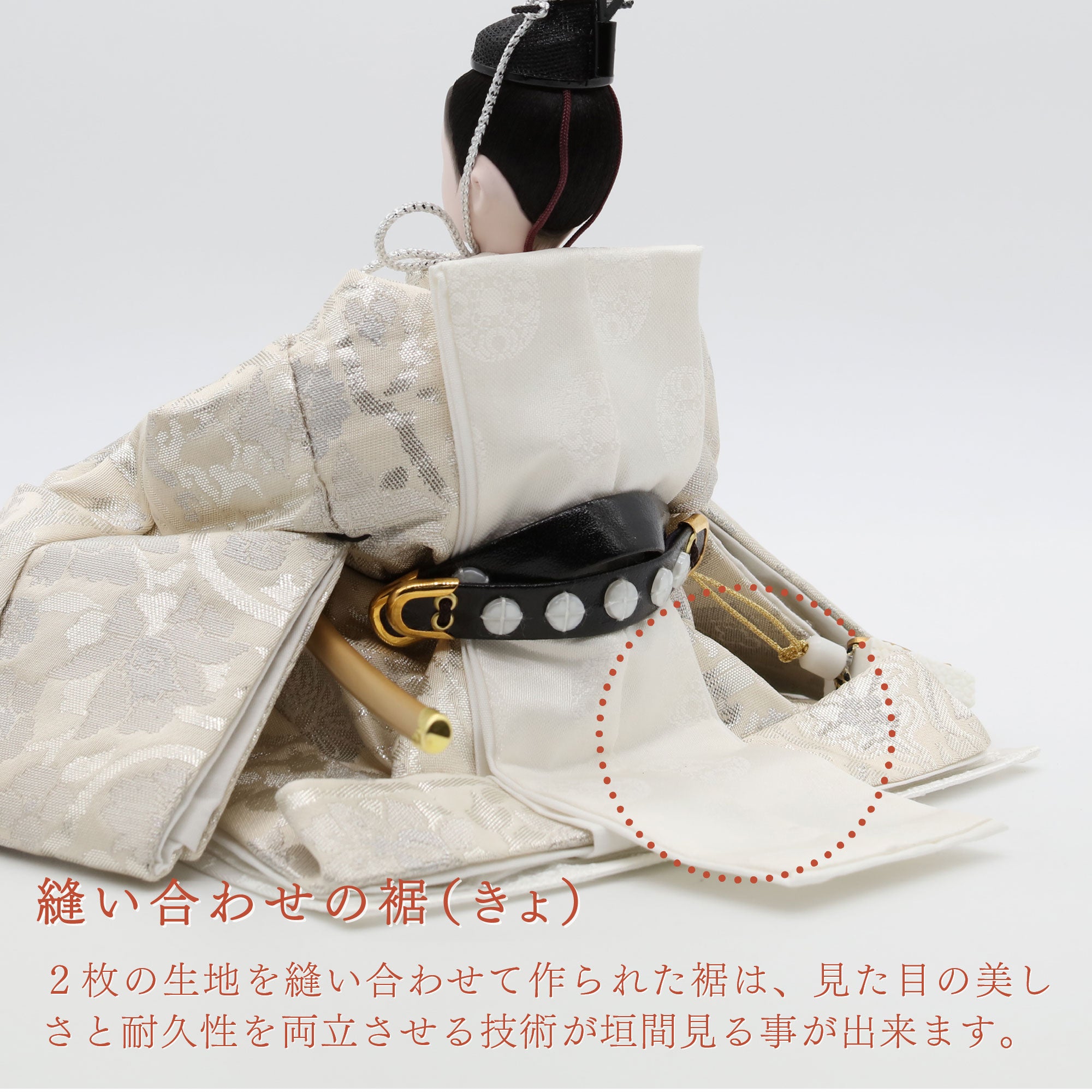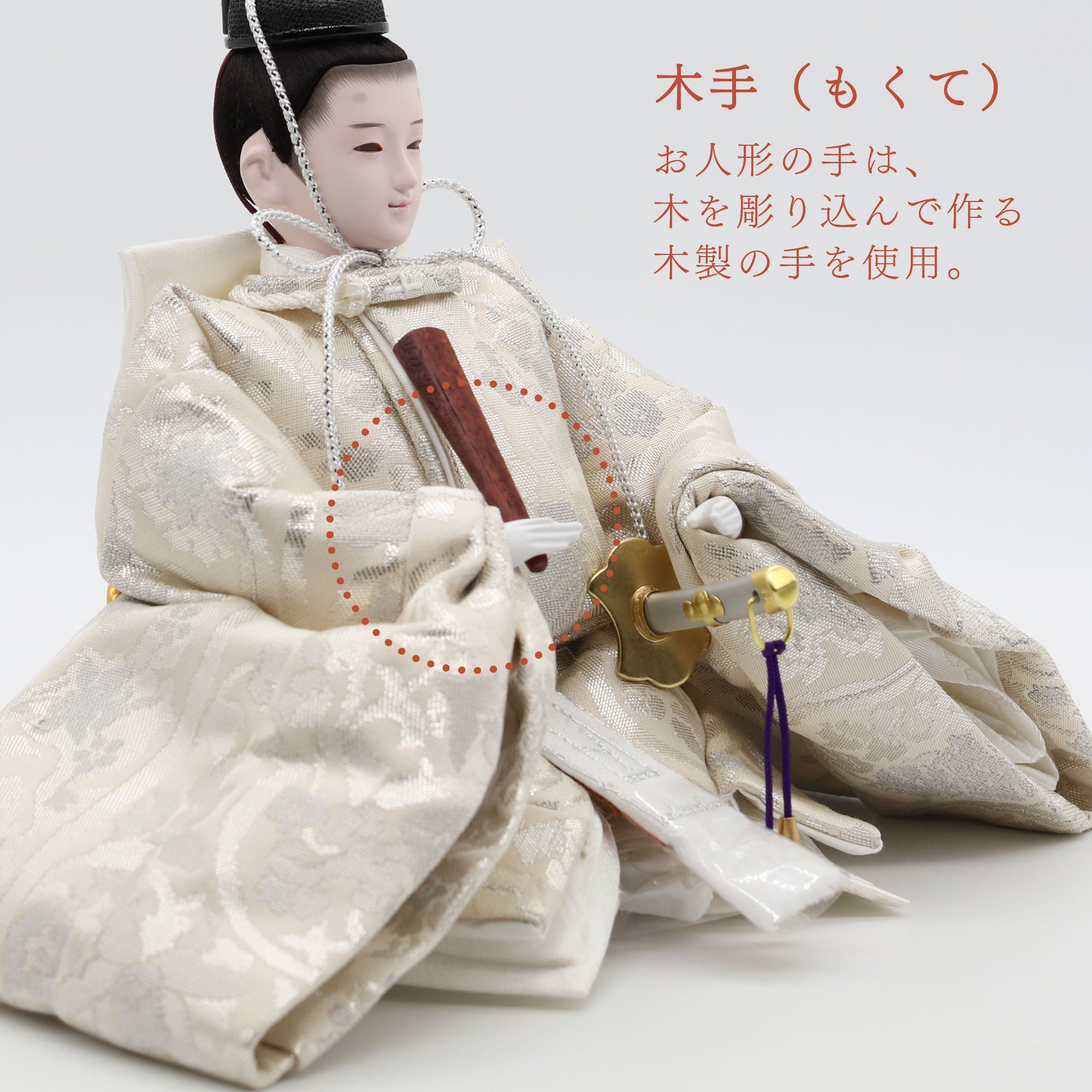 国産の分(せん)は、美しい木目と温もりある質感が魅力の天然木です。耐久性に優れ、経年とともに味わいを醸し出します。台座や屏風などに使用することで、自然素材ならではの落ち着いた風合いと上質感を演出し、雛人形全体をより品格ある印象に仕上げます。