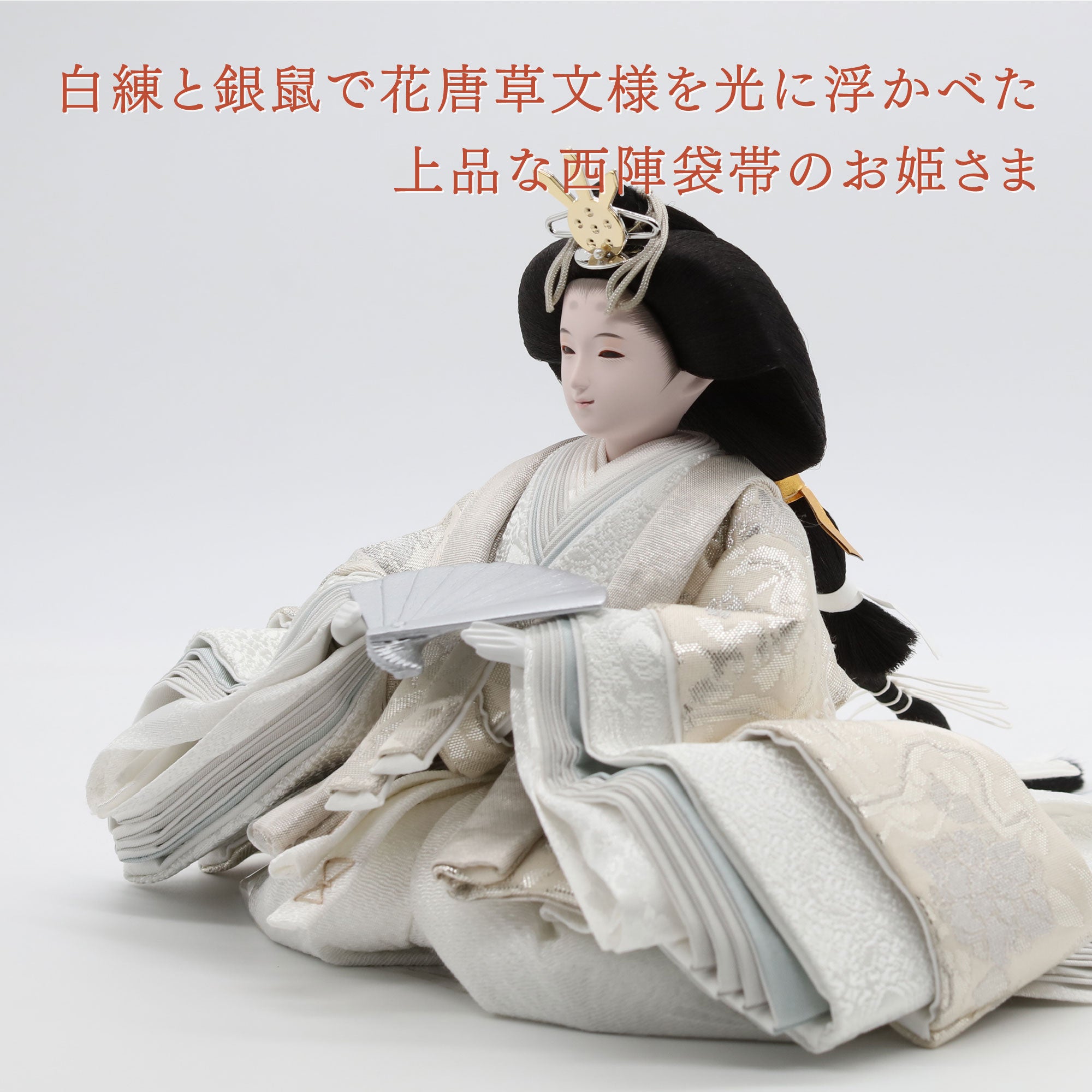 白練と銀鼠で花唐草文様を光に浮かべた上品な西陣袋帯のお姫さま